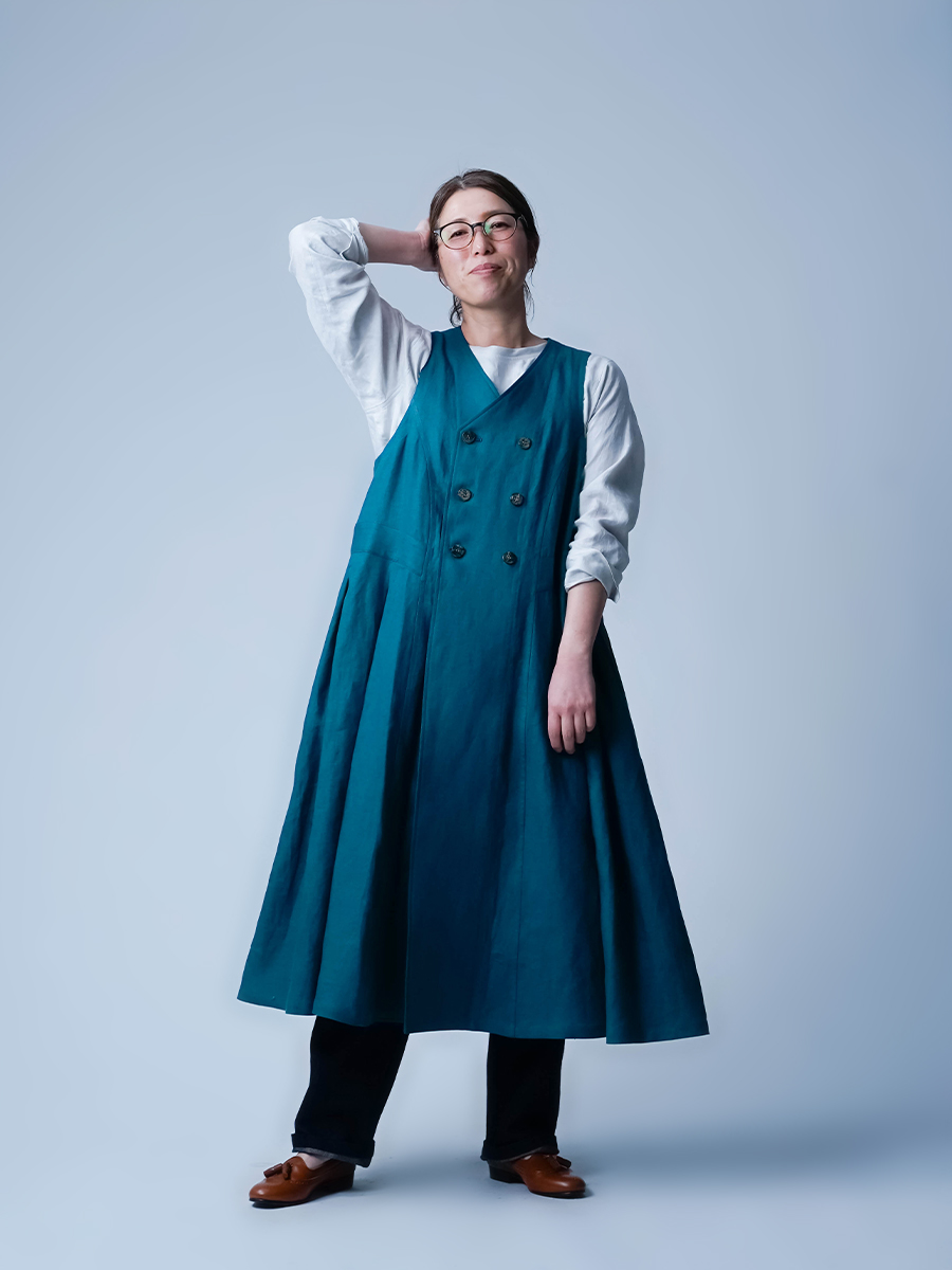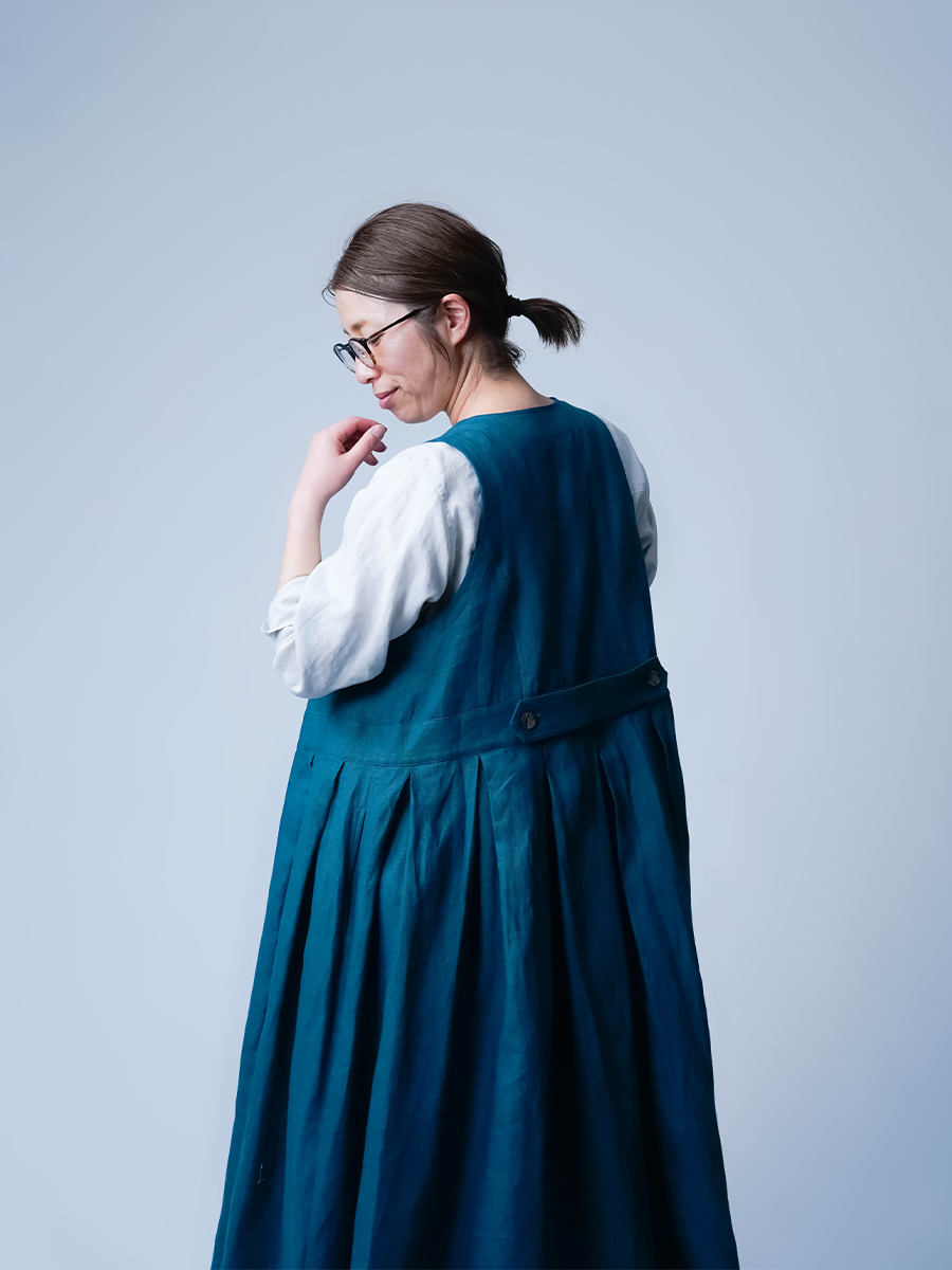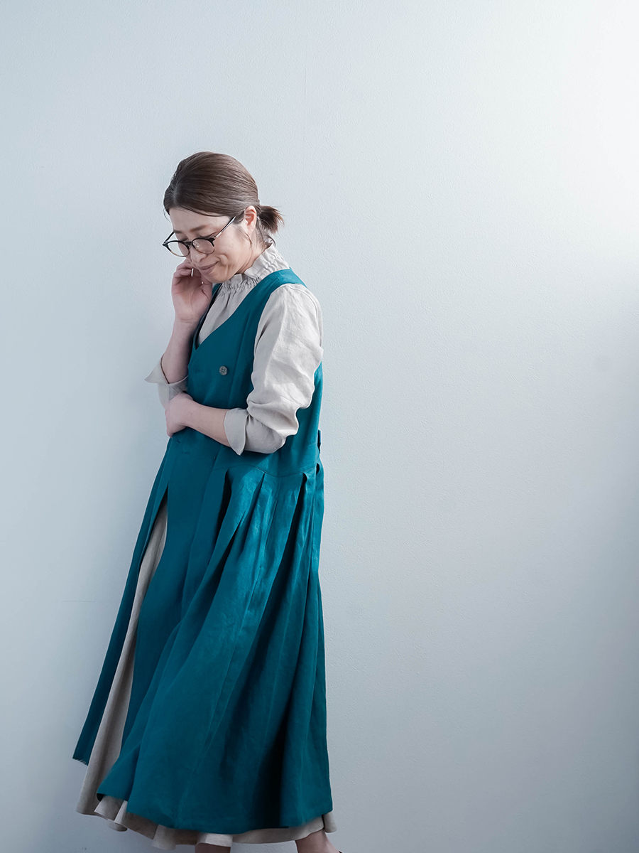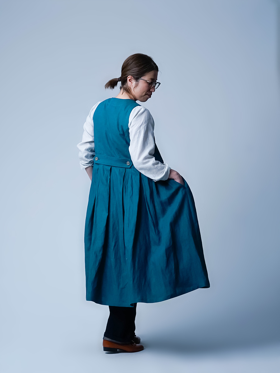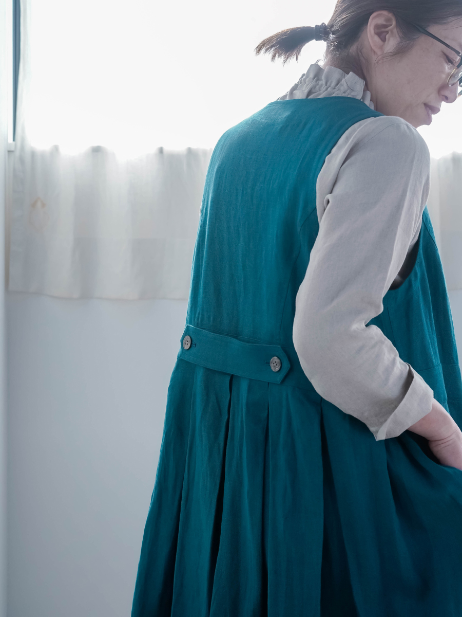 しっかりとしたデザインなのに、見た目はすっきり軽やか。フロントのダブルボタンは存在感があり、閉じても開けても自然と決まります。程よい深さのVネックはインナーを選ばず、タンクトップや半袖に合わせてもすっと馴染みました。ボタンを留めた状態でも締め付け感はなく、快適な着心地です。ウエストの切替から広がる鍵盤タックと、歩くたびに生まれる揺れ感も印象的。タックの配置が計算されているため、ボリュームが出すぎず、すっきりとしたシルエットで着られます。着丈はくるぶしの少し上、約5cmほど。重たく見えず、バランスよく着こなせる丈感だと感じました。