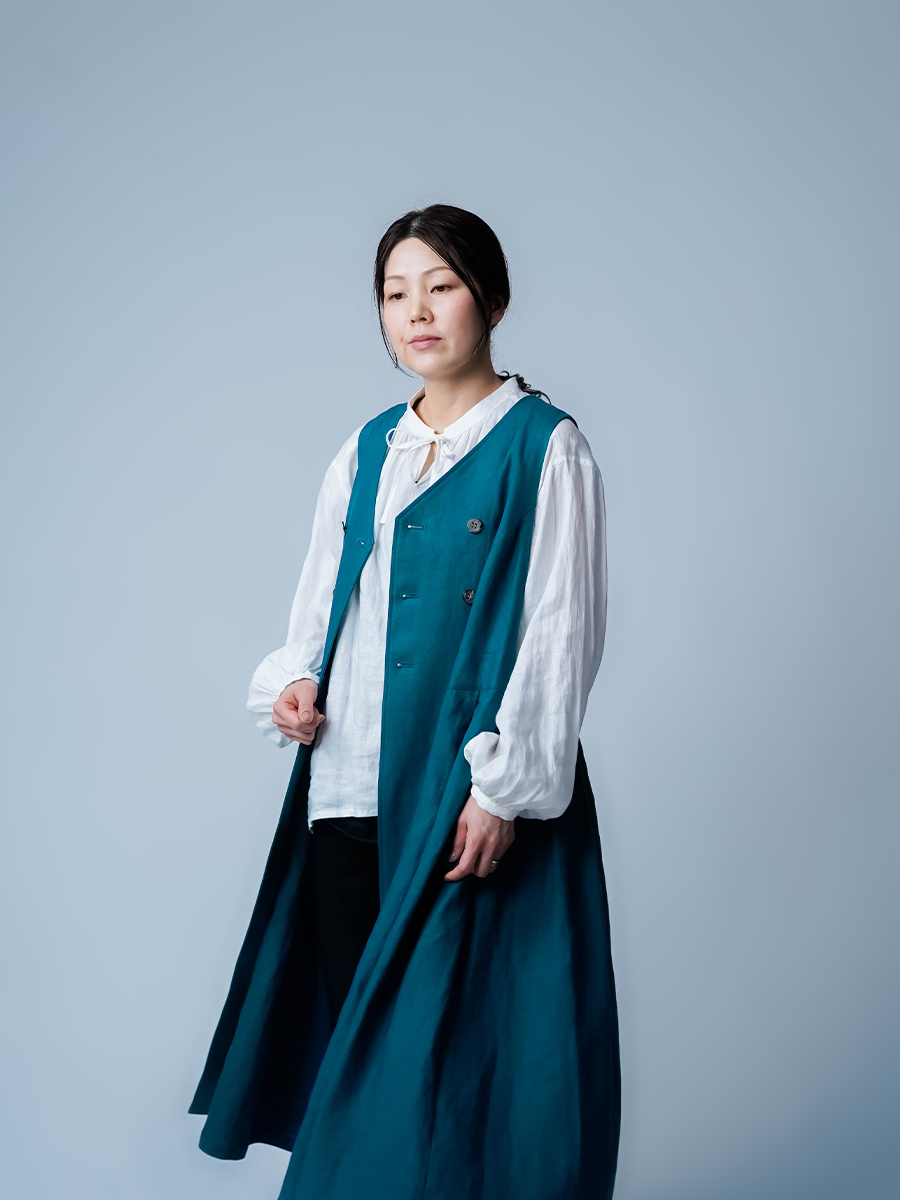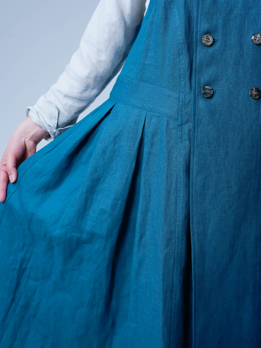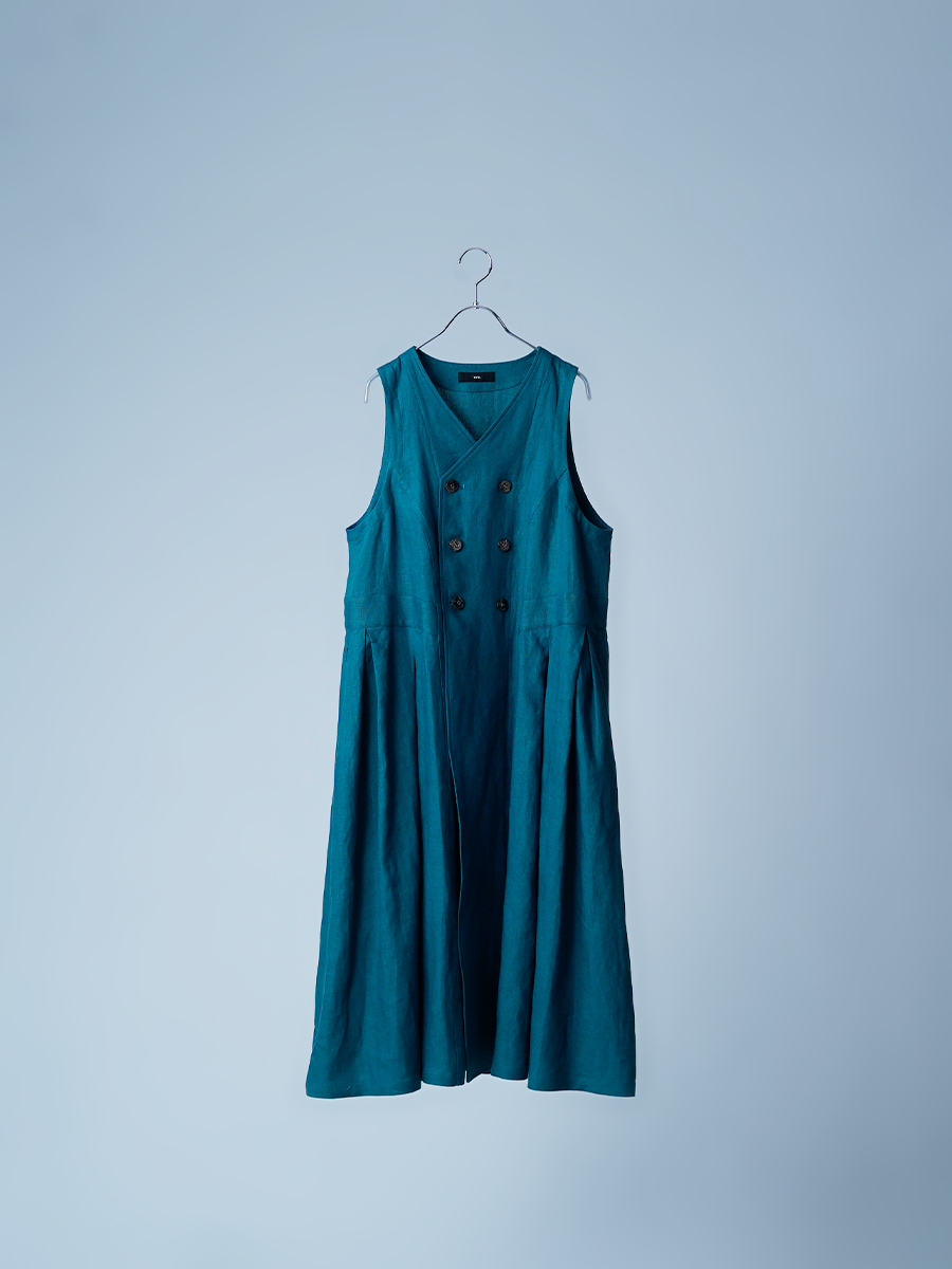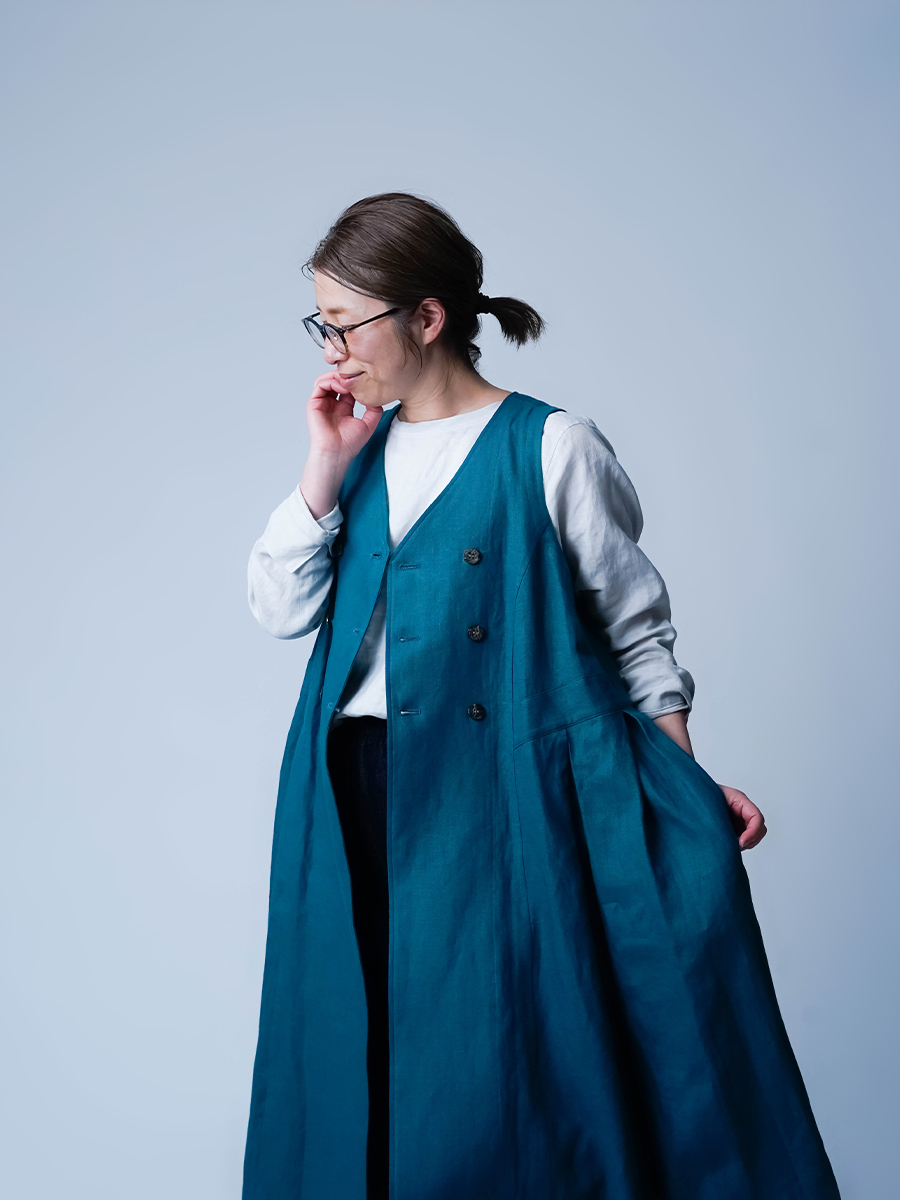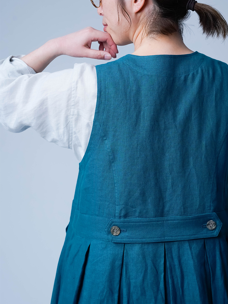 しっかりとしたデザインなのに、見た目はすっきり軽やか。フロントのダブルボタンは存在感があり、閉じても開けても自然と決まります。程よい深さのVネックはインナーを選ばず、タンクトップや半袖に合わせてもすっと馴染みました。ボタンを留めた状態でも締め付け感はなく、快適な着心地です。ウエストの切替から広がる鍵盤タックと、歩くたびに生まれる揺れ感も印象的。タックの配置が計算されているため、ボリュームが出すぎず、すっきりとしたシルエットで着られます。着丈はくるぶしの少し上、約5cmほど。重たく見えず、バランスよく着こなせる丈感だと感じました。