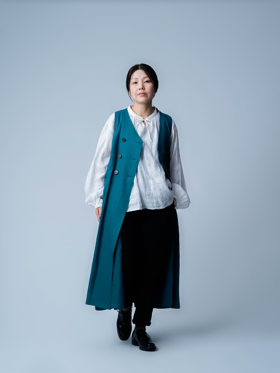 一目見て、その重厚感ある佇まいに圧倒されました。歳を重ねても着るだけで背筋がピンと伸びるような、凛とした強さを感じます。 ダブルボタンの存在感は抜群、前を閉じても開けても、最高にカッコいいです。 それにVネックの深さは、どんなインナーも正解へと導いてくれるラインで、収まりがいいとはこの事かと感じるくらいです。肩幅が広い方、鳩胸さんでもスッと馴染むラインですよ。スカート部分は見た目以上に豪華で、動くたびに贅沢に揺れるところが好きです。 あえてデニムと合わせてカジュアルに合わせてみたいです。着丈は膝下10cm。私に寄り添い、共に時を刻んでくれるそんな作品です。