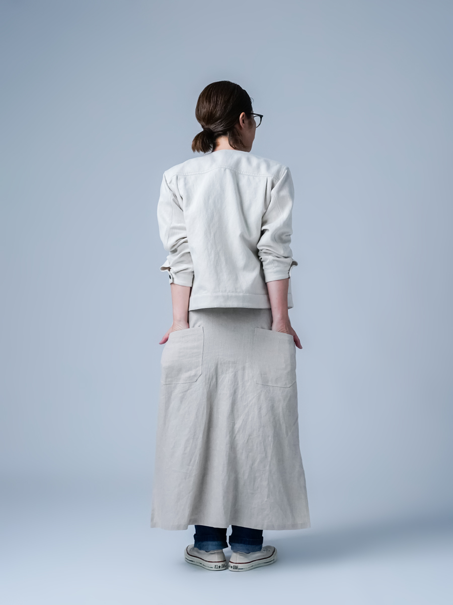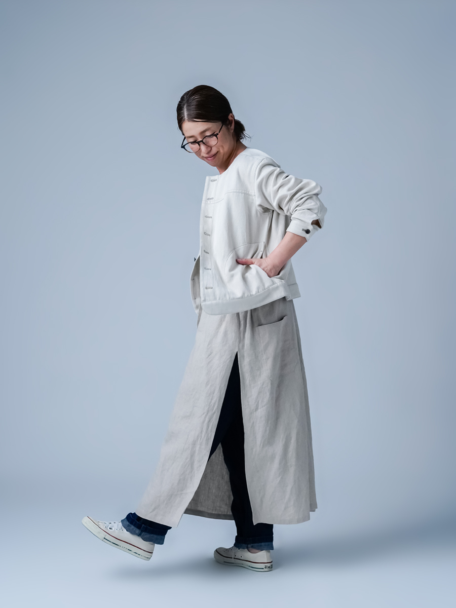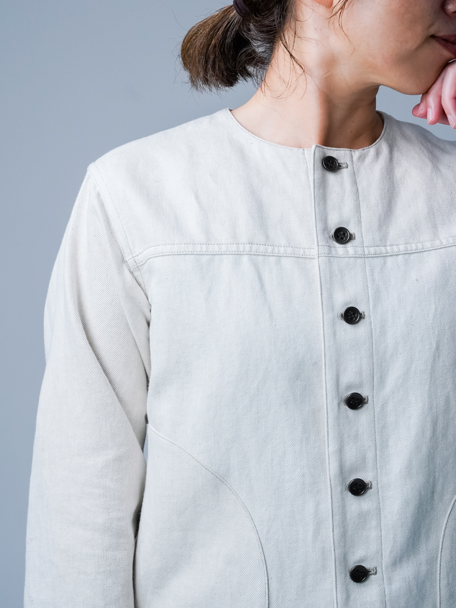 首元をすっきり見せるノーカラー、裾やポケットに施された丸み。