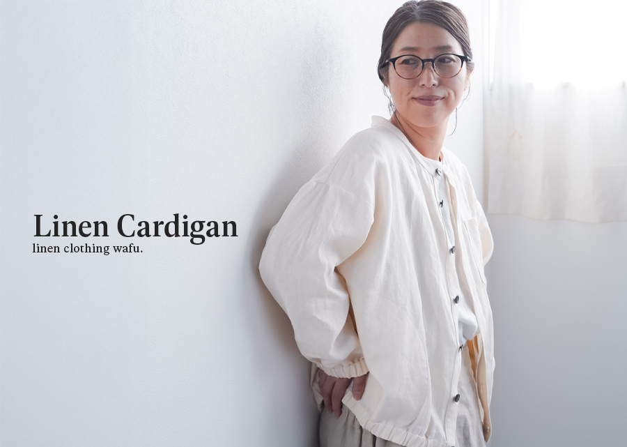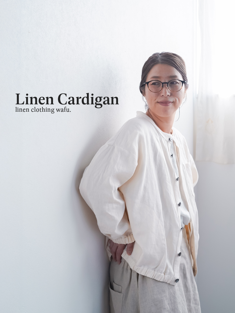 どのシーズンにもマッチする羽織りできました。着丈はお尻半分の少し下くらい。袖丈は指先が少し見えるくらい。袖と裾に平ゴムを入れることでカーディガンをカジュアルに仕上げました。胸ポケットをつけることでよりカジュアルダウンしどんなアイテムとも相性よく着こなしができるでしょう。