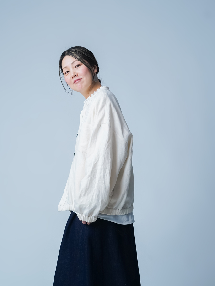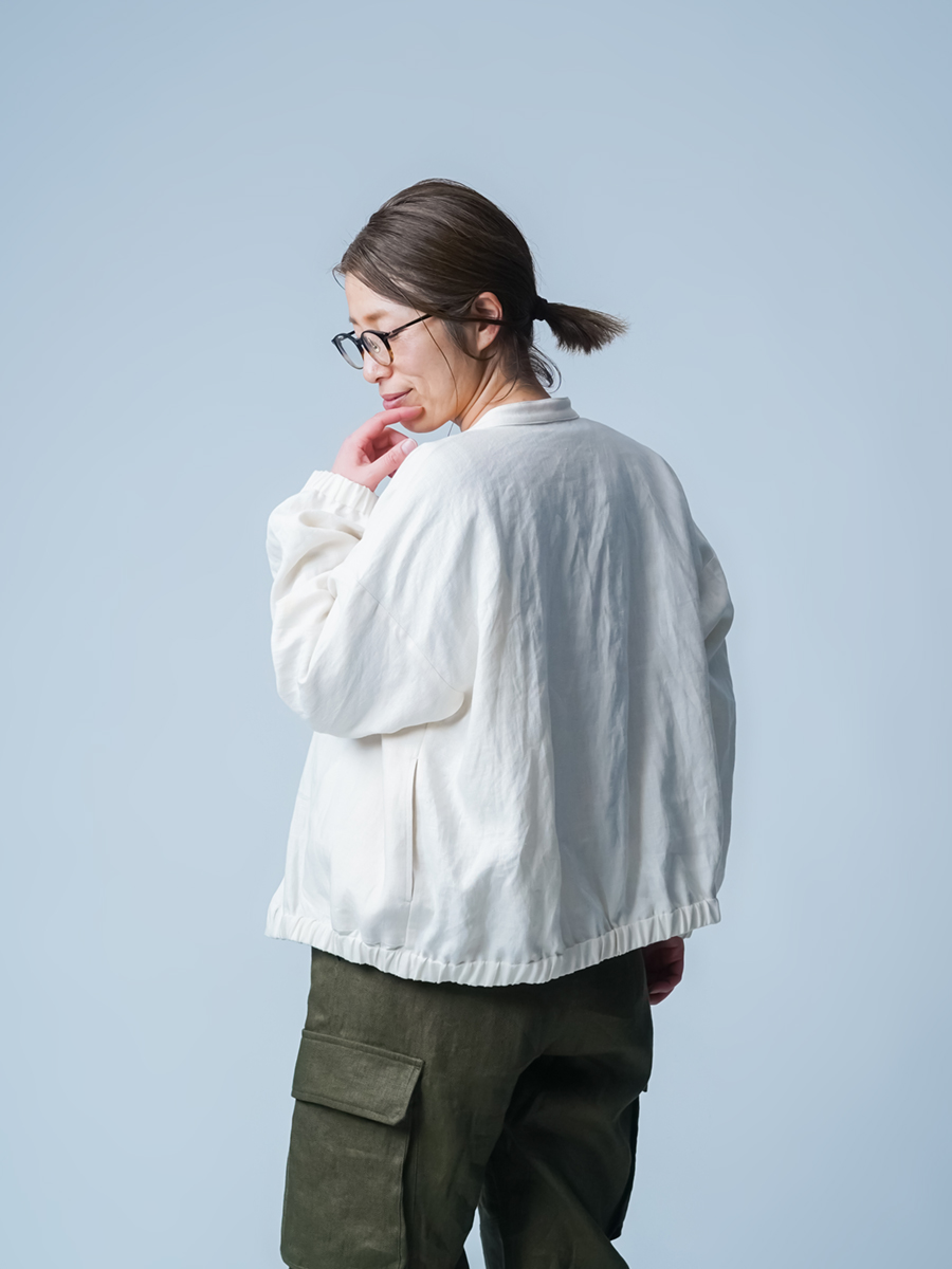 この色のブルゾン、なかなか見かけないのでとっても新鮮です。季節に合わせてジャケット感覚で羽織ったり、シャツみたいに軽く着たり、これからの時期が楽しみになりますね。袖口と裾はゴム仕様なので、ふわっと立体感が出てくれるのも可愛いポイント。重ね着派の白コーデ好きとしては、これはもう素通りできません。着丈は腰にかかるくらい、袖丈は手の甲が隠れるくらいで、安心感もばっちりです。