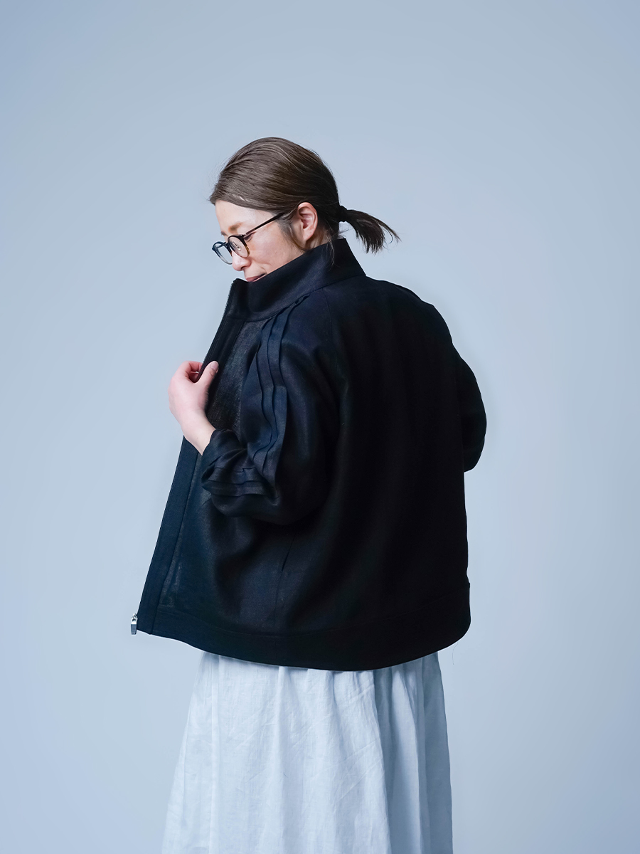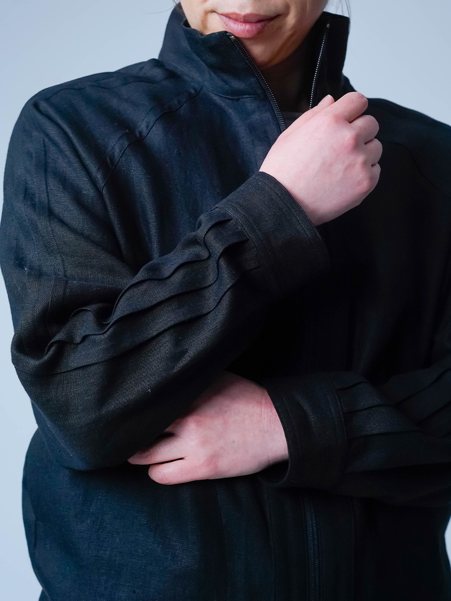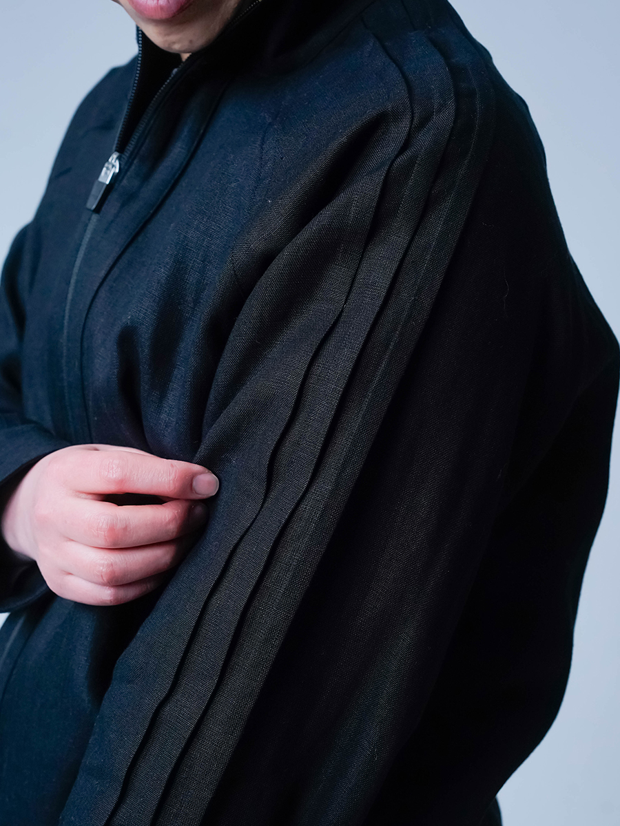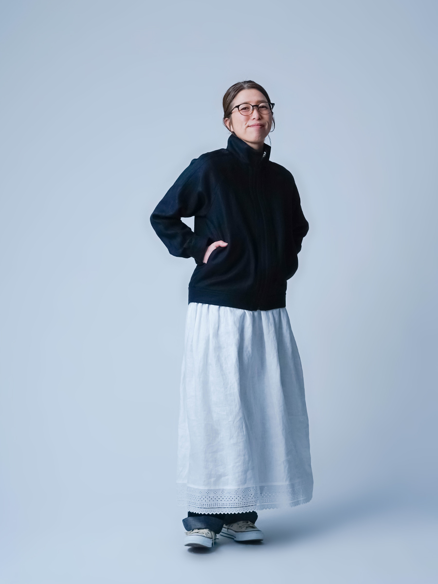 Lサイズを着用。静寂な黒の中に、腕に施された立体的な3本ラインがきらりと映える一枚。スポーティーな要素がありながらも、大人の上品さをしっかりと演出してくれるので、「ラフすぎたくない日」にこそ選びたい作品です。ユニセックスで着られるデザインなので、主人とシェアしたい一枚。袖丈は手の甲が隠れるくらいで、一折りして着るのもバランスの良い長さ。着丈はヒップがすっぽり隠れる安心感があります。ファスナーを閉めて着ても胸まわりはきつくなく、首元はアゴまでしっかり覆われるデザイン。ファスナーを閉めて着る場合、ヒップにボリュームがある体型の方はヒップより少し上で留め、腰あたりでたゆませて着ると、シルエットがより綺麗に見えると思います。