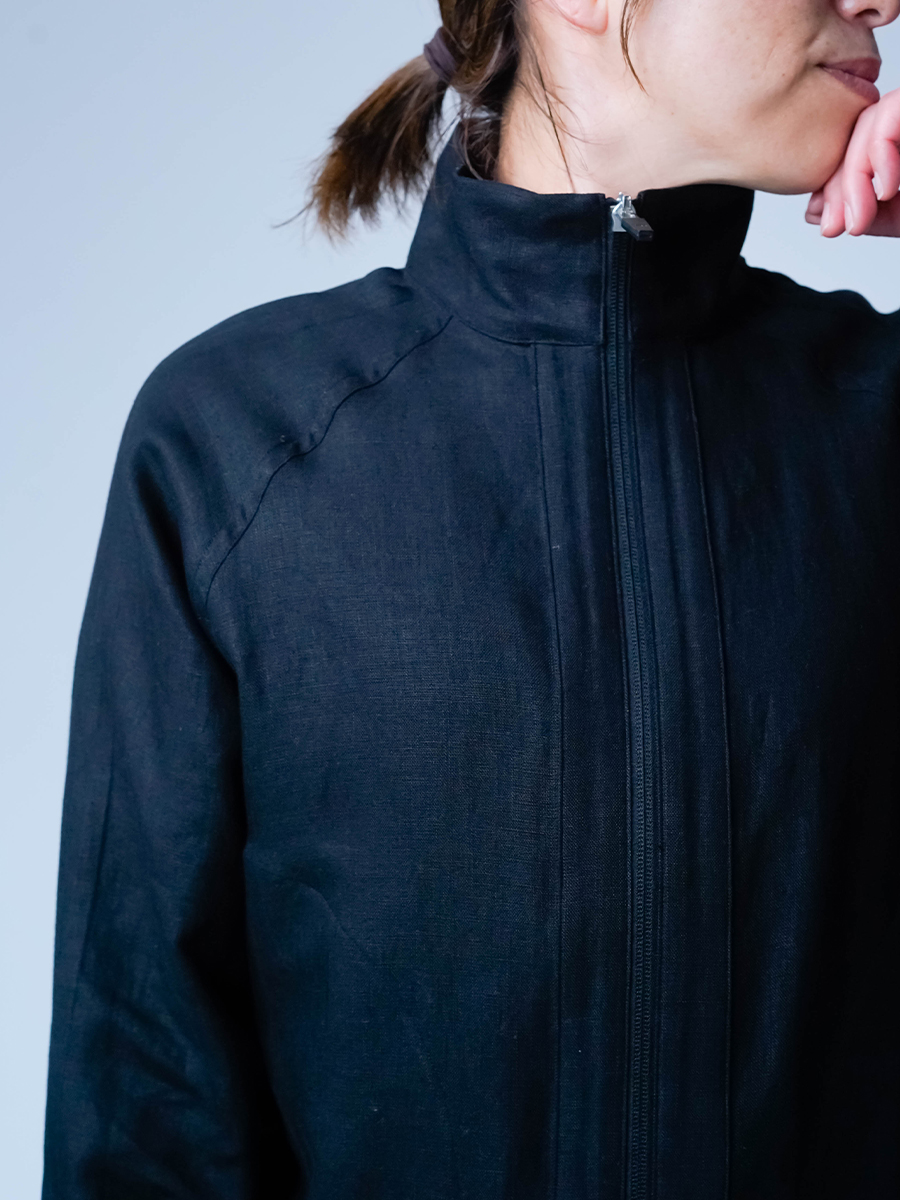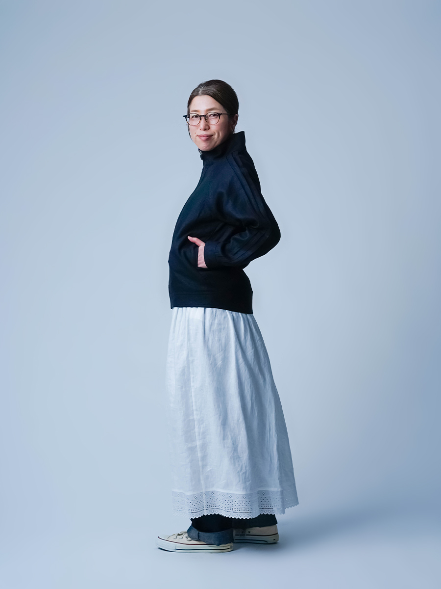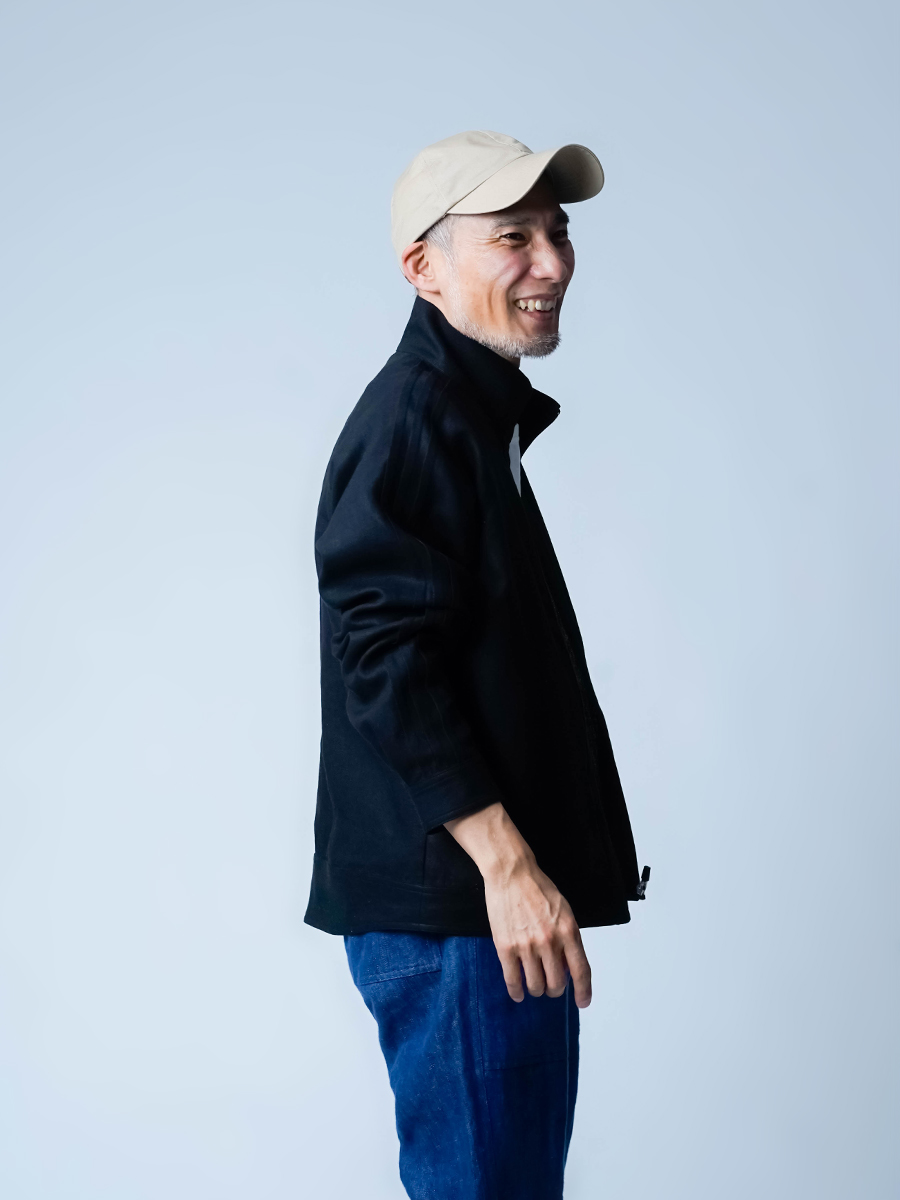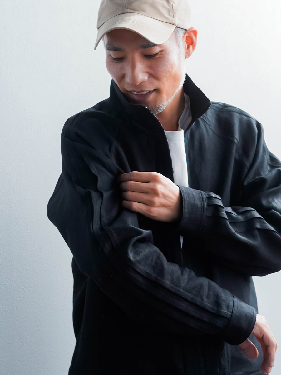 Lサイズを着用。静寂な黒の中に、腕に施された立体的な3本ラインがきらりと映える一枚。スポーティーな要素がありながらも、大人の上品さをしっかりと演出してくれるので、「ラフすぎたくない日」にこそ選びたい作品です。ユニセックスで着られるデザインなので、主人とシェアしたい一枚。袖丈は手の甲が隠れるくらいで、一折りして着るのもバランスの良い長さ。着丈はヒップがすっぽり隠れる安心感があります。ファスナーを閉めて着ても胸まわりはきつくなく、首元はアゴまでしっかり覆われるデザイン。ファスナーを閉めて着る場合、ヒップにボリュームがある体型の方はヒップより少し上で留め、腰あたりでたゆませて着ると、シルエットがより綺麗に見えると思います。