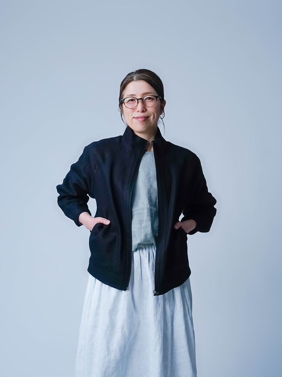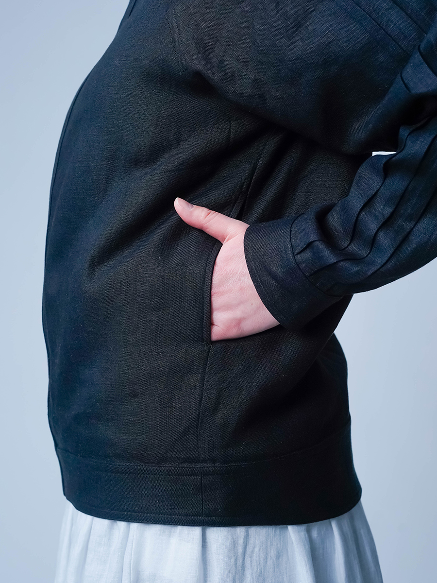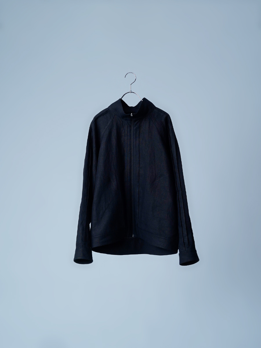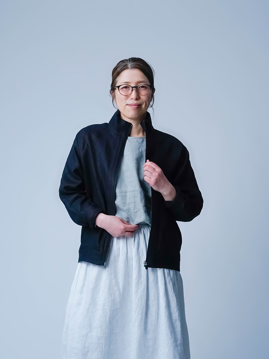Lサイズを着用。静寂な黒の中に、腕に施された立体的な3本ラインがきらりと映える一枚。スポーティーな要素がありながらも、大人の上品さをしっかりと演出してくれるので、「ラフすぎたくない日」にこそ選びたい作品です。ユニセックスで着られるデザインなので、主人とシェアしたい一枚。袖丈は手の甲が隠れるくらいで、一折りして着るのもバランスの良い長さ。着丈はヒップがすっぽり隠れる安心感があります。ファスナーを閉めて着ても胸まわりはきつくなく、首元はアゴまでしっかり覆われるデザイン。ファスナーを閉めて着る場合、ヒップにボリュームがある体型の方はヒップより少し上で留め、腰あたりでたゆませて着ると、シルエットがより綺麗に見えると思います。