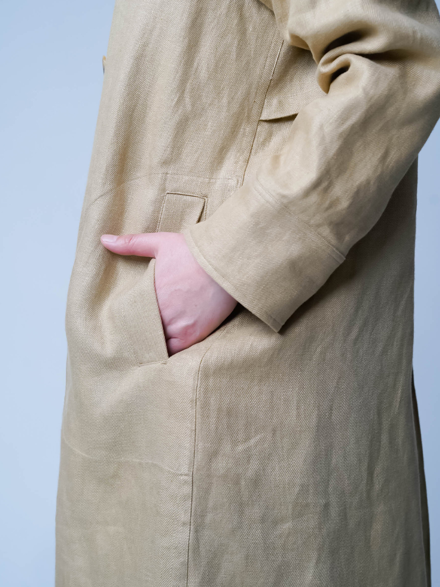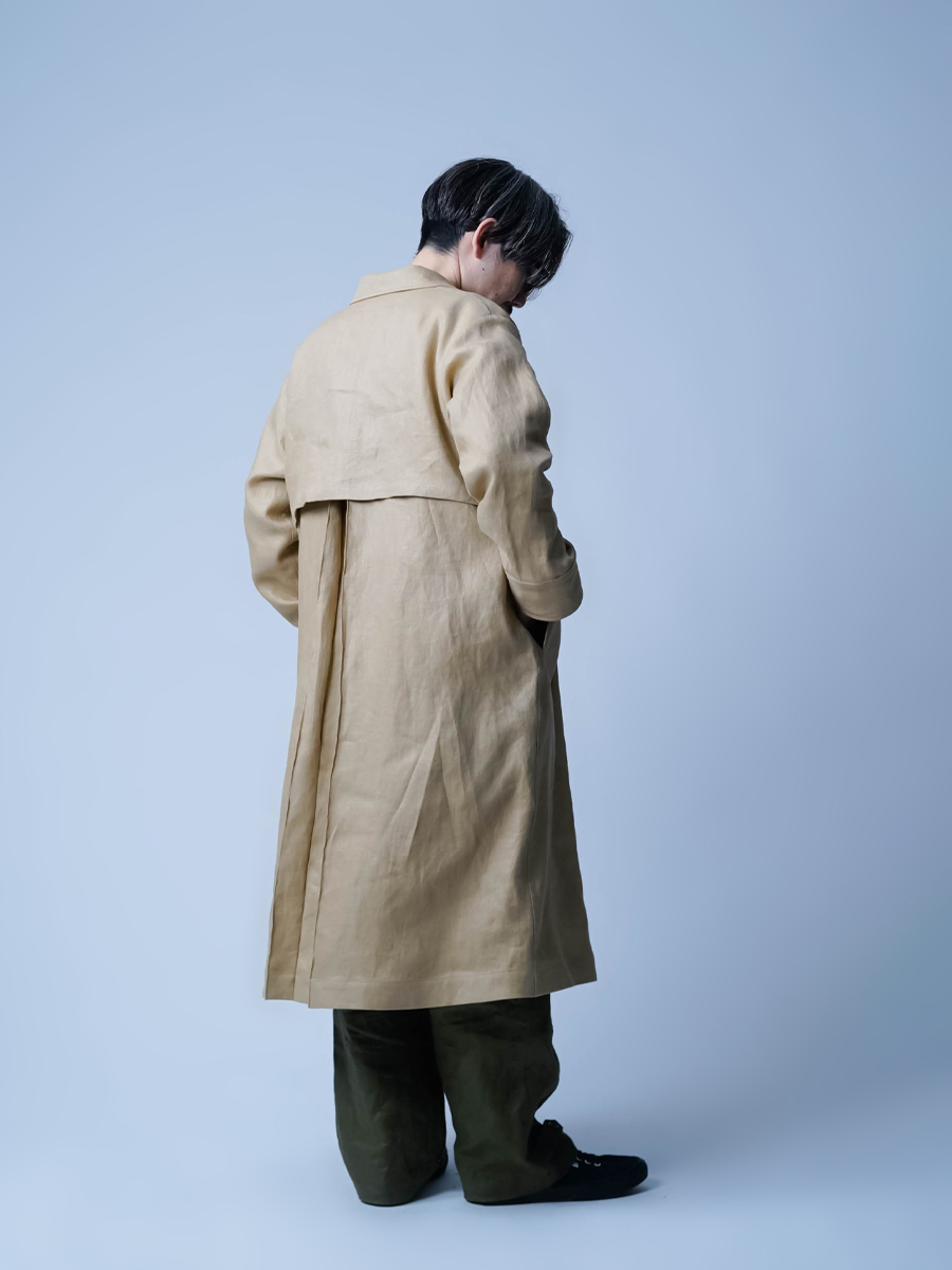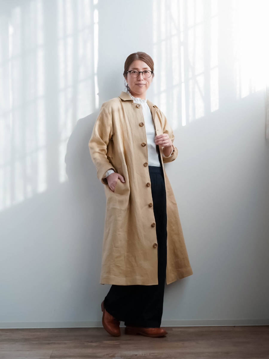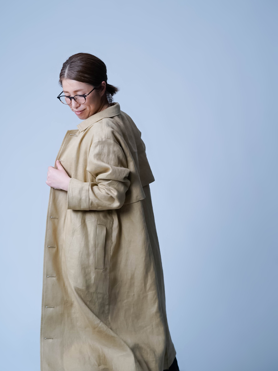 僕はLサイズを選びたいと思います。着丈は膝くらいで、袖丈は手首が隠れるくらいです。身幅には余裕があるので中にスーツを着ていても着られると思います。プレミアムリネンの上品な光沢が目を引くシンプルにしてベストなコートだと思います。冬こそリネンを体現する作品です。