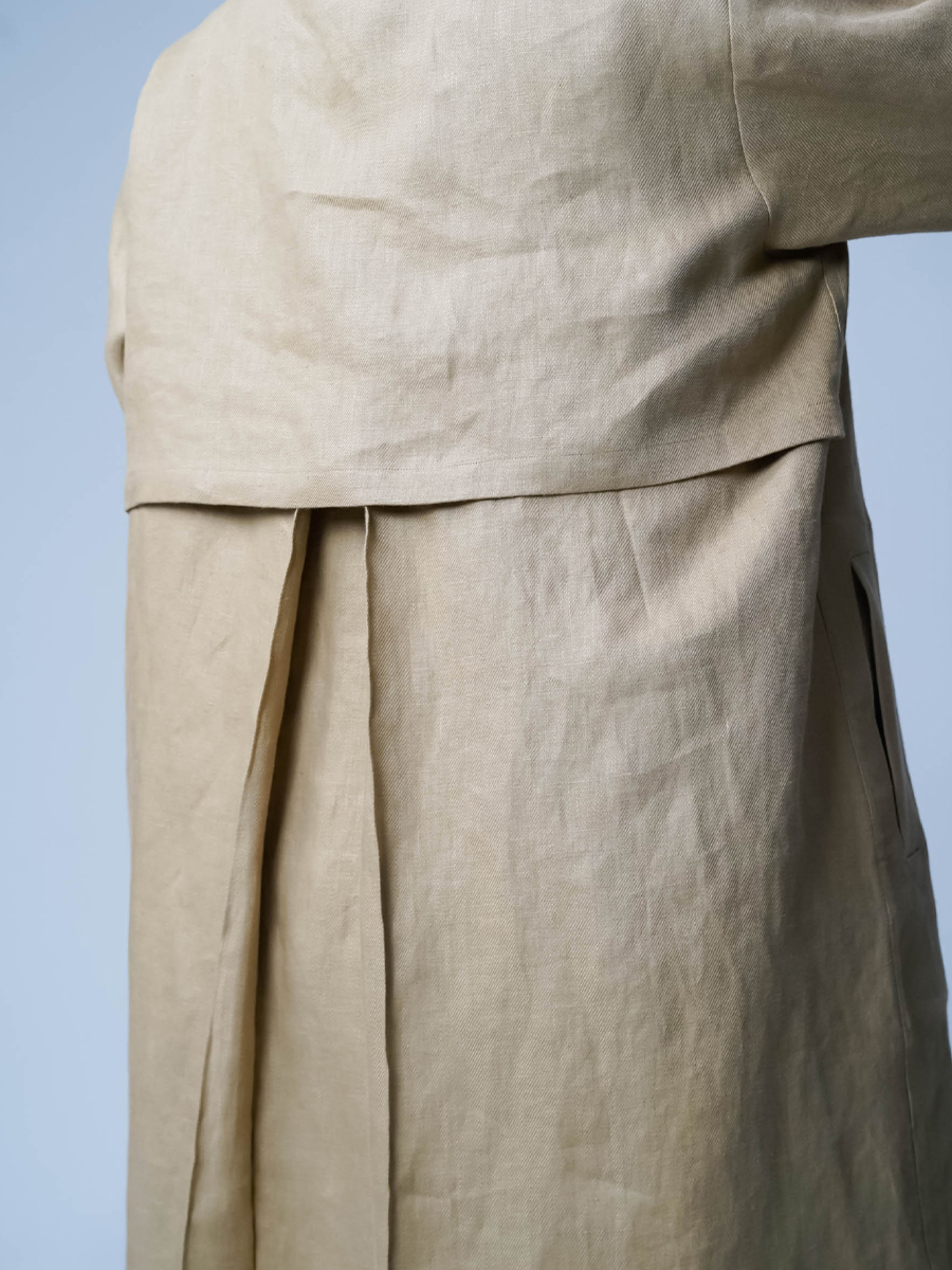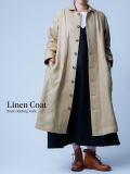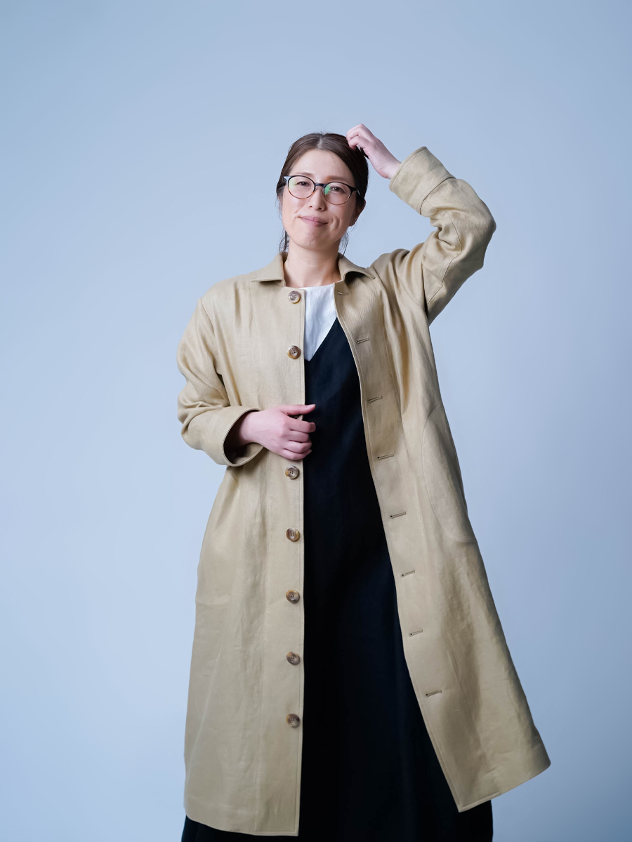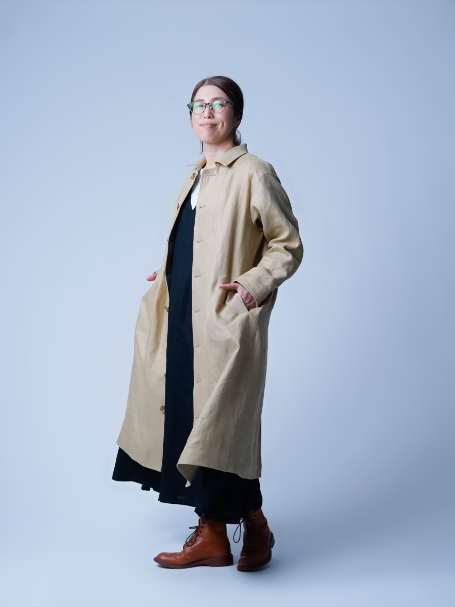 僕はLサイズを選びたいと思います。着丈は膝くらいで、袖丈は手首が隠れるくらいです。身幅には余裕があるので中にスーツを着ていても着られると思います。プレミアムリネンの上品な光沢が目を引くシンプルにしてベストなコートだと思います。冬こそリネンを体現する作品です。