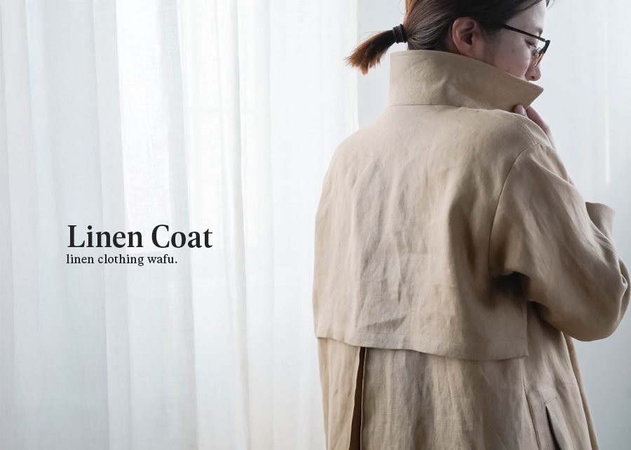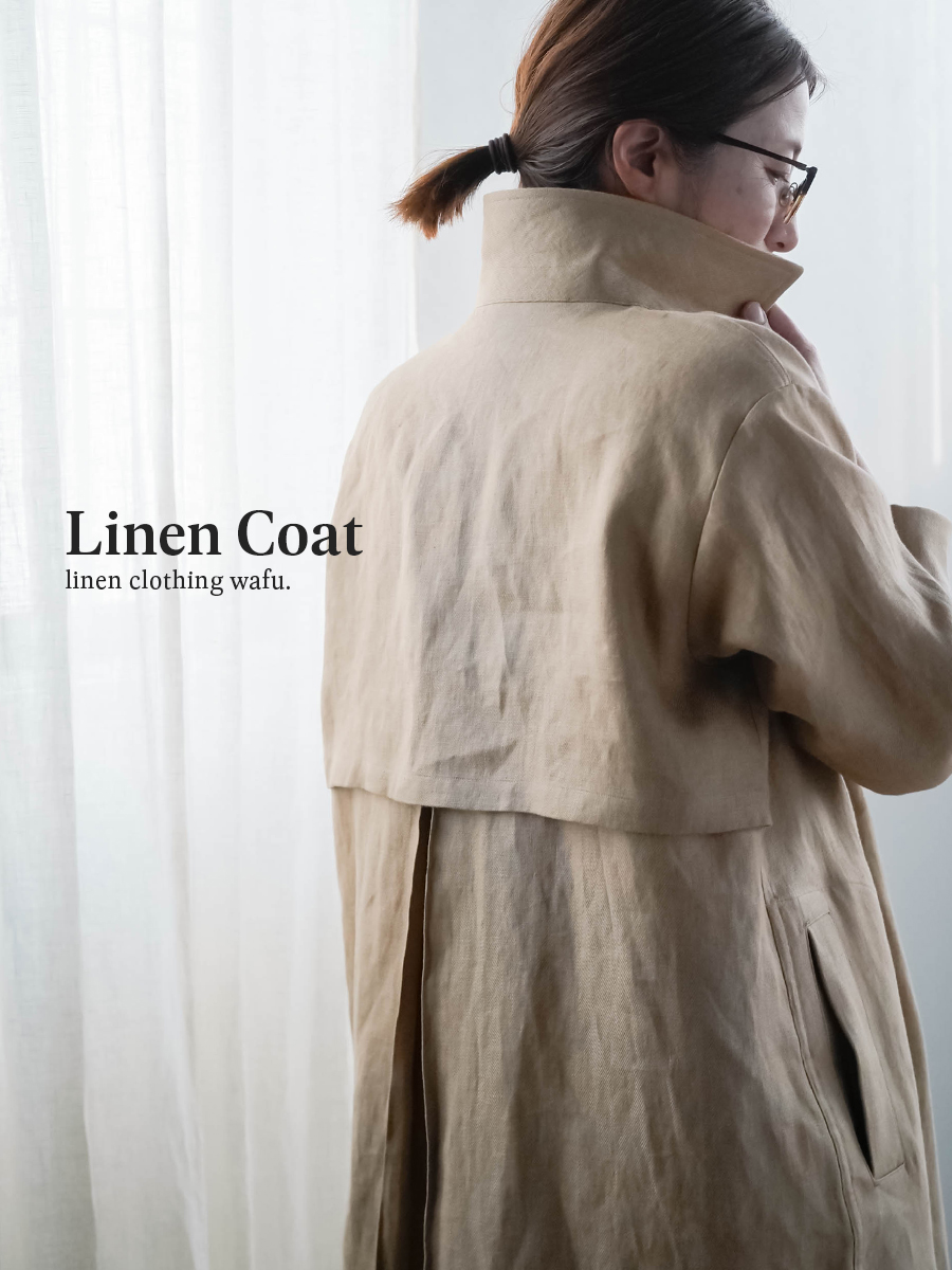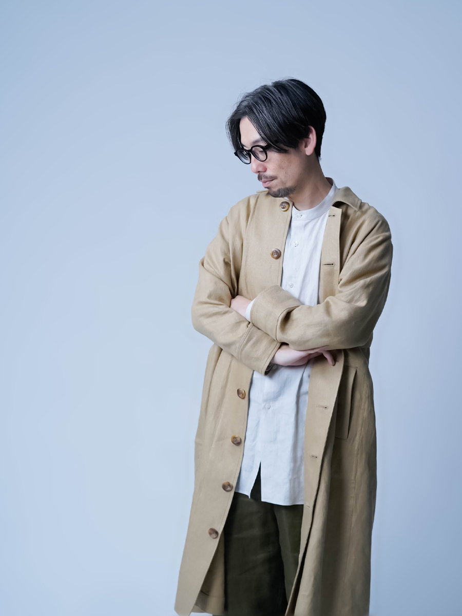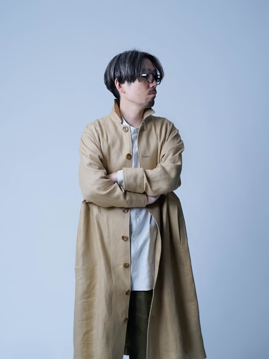 サイズはMサイズを選びます。着丈はふくらはぎの真ん中くらい。袖丈は親指の付け根ぐらいです。身幅はややゆとりのあるシルエットです。シンプルなデザインのコートなので、合わせるアイテムを選びません。これを羽織るだけで一気に大人の雰囲気に。wafu.ではめずらしいメンズのコート。世の中的にもリネンのコート自体めずらしい。見逃せない1着ですね。