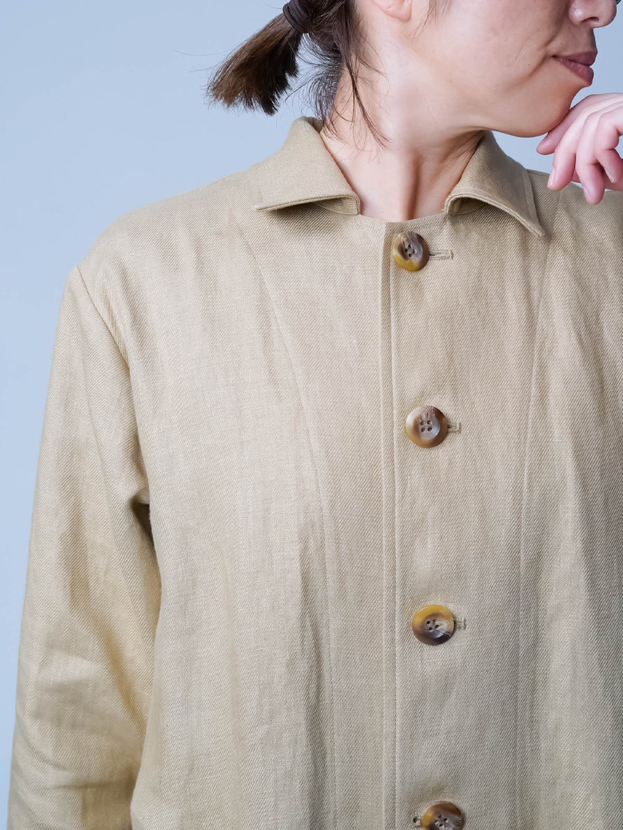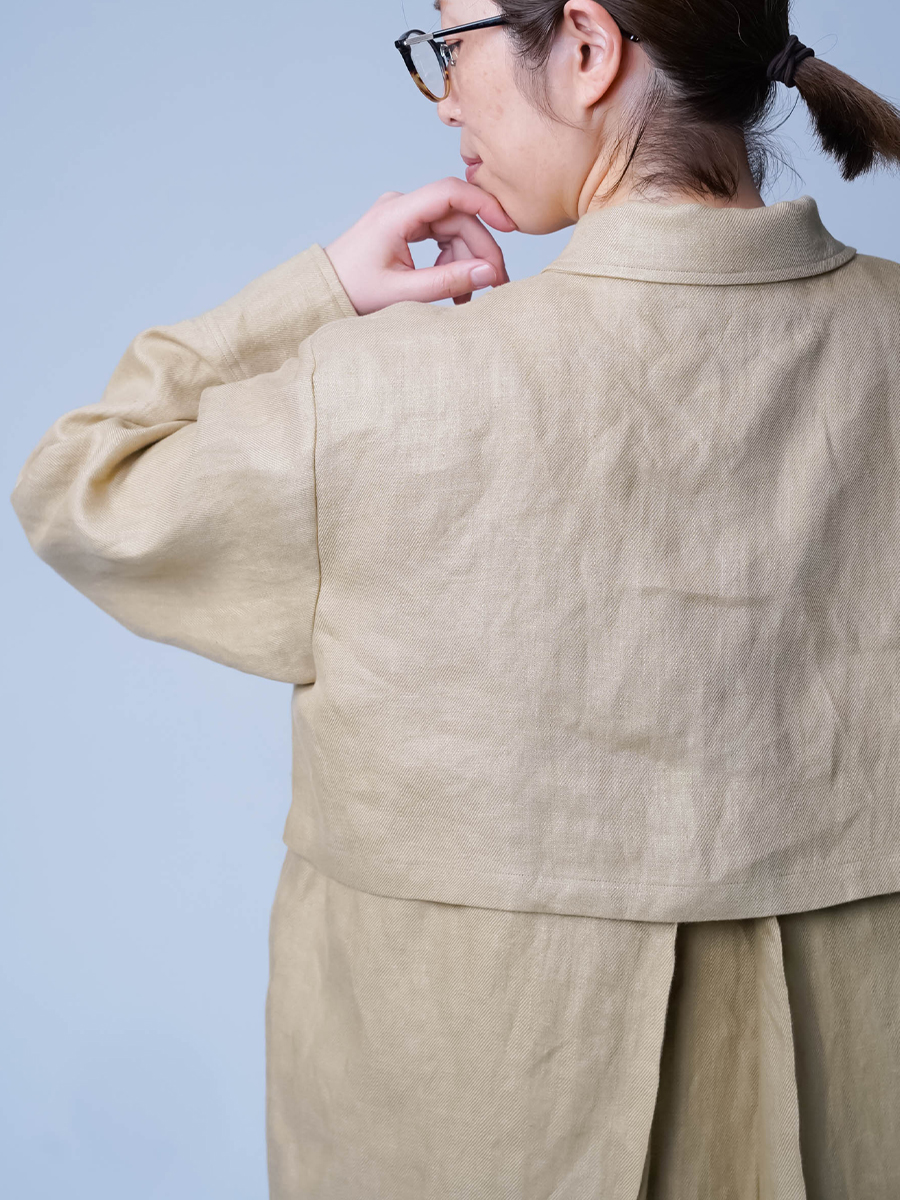- ※生地工場の生産時期によって色味の濃淡が出ることがございます。セットアップでの着用の場合はご相談下さい。カラーリネンは最初色落ちや生地の性質上、毛羽落ちがある場合がございます。落ち着くまで数回は単品でのお洗濯を。最初は水通しをおすすめします。表面の毛羽立ちがとれて、肌への刺激が極端に少なくなります。リネン特有のネップ、節がございます。