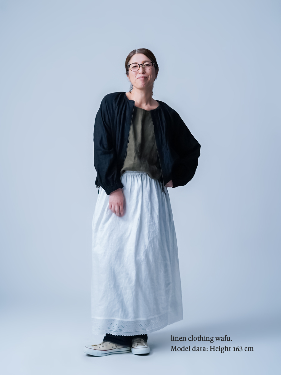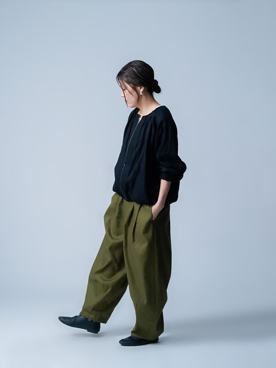 - ※生地工場の生産時期によって色味の濃淡が出ることがございます。セットアップでの着用の場合はご相談下さい。カラーリネンは最初色落ちや生地の性質上、毛羽落ちがある場合がございます。落ち着くまで数回は単品でのお洗濯を。最初は水通しをおすすめします。表面の毛羽立ちがとれて、肌への刺激が極端に少なくなります。リネン特有のネップ、節がございます。