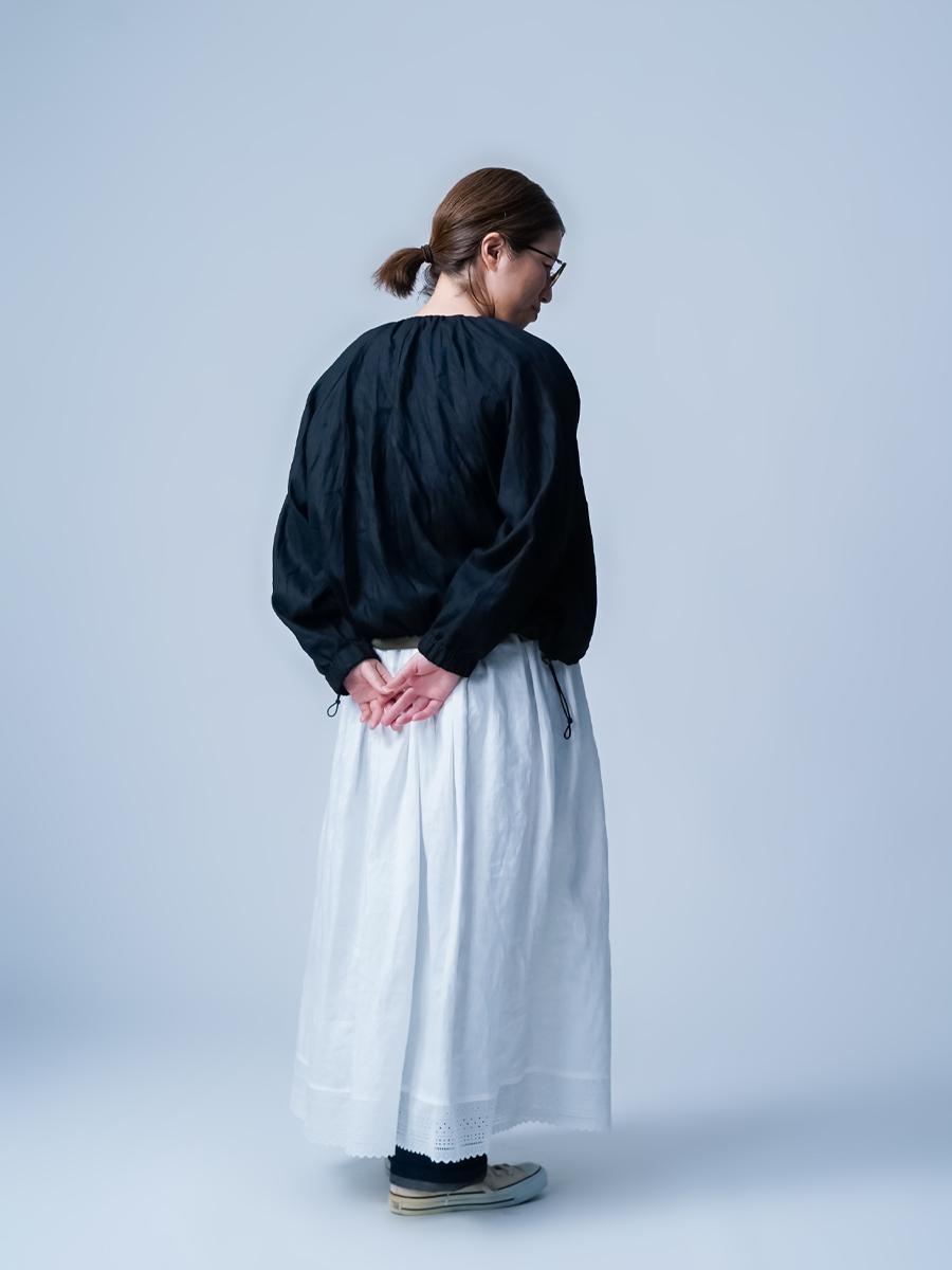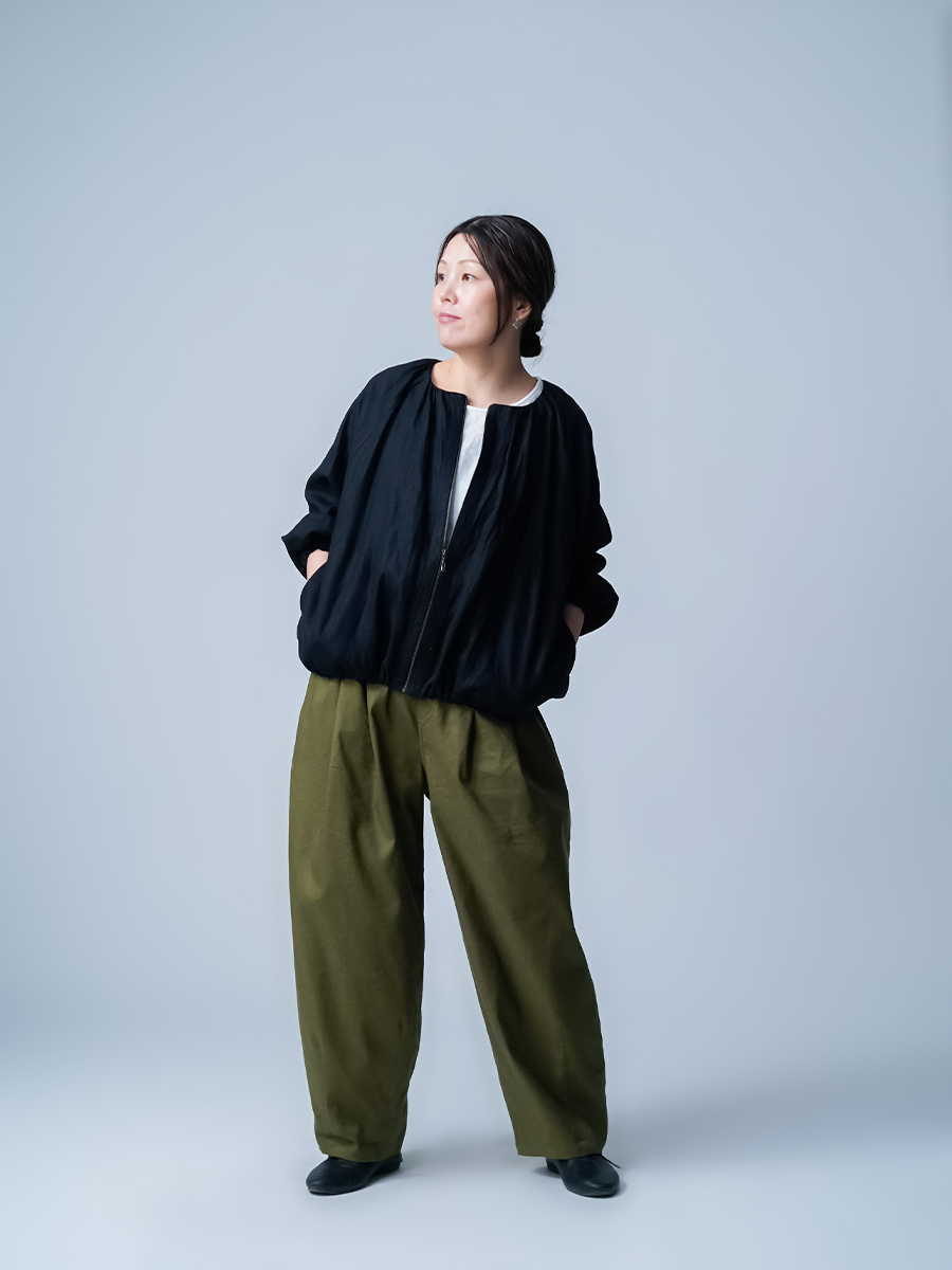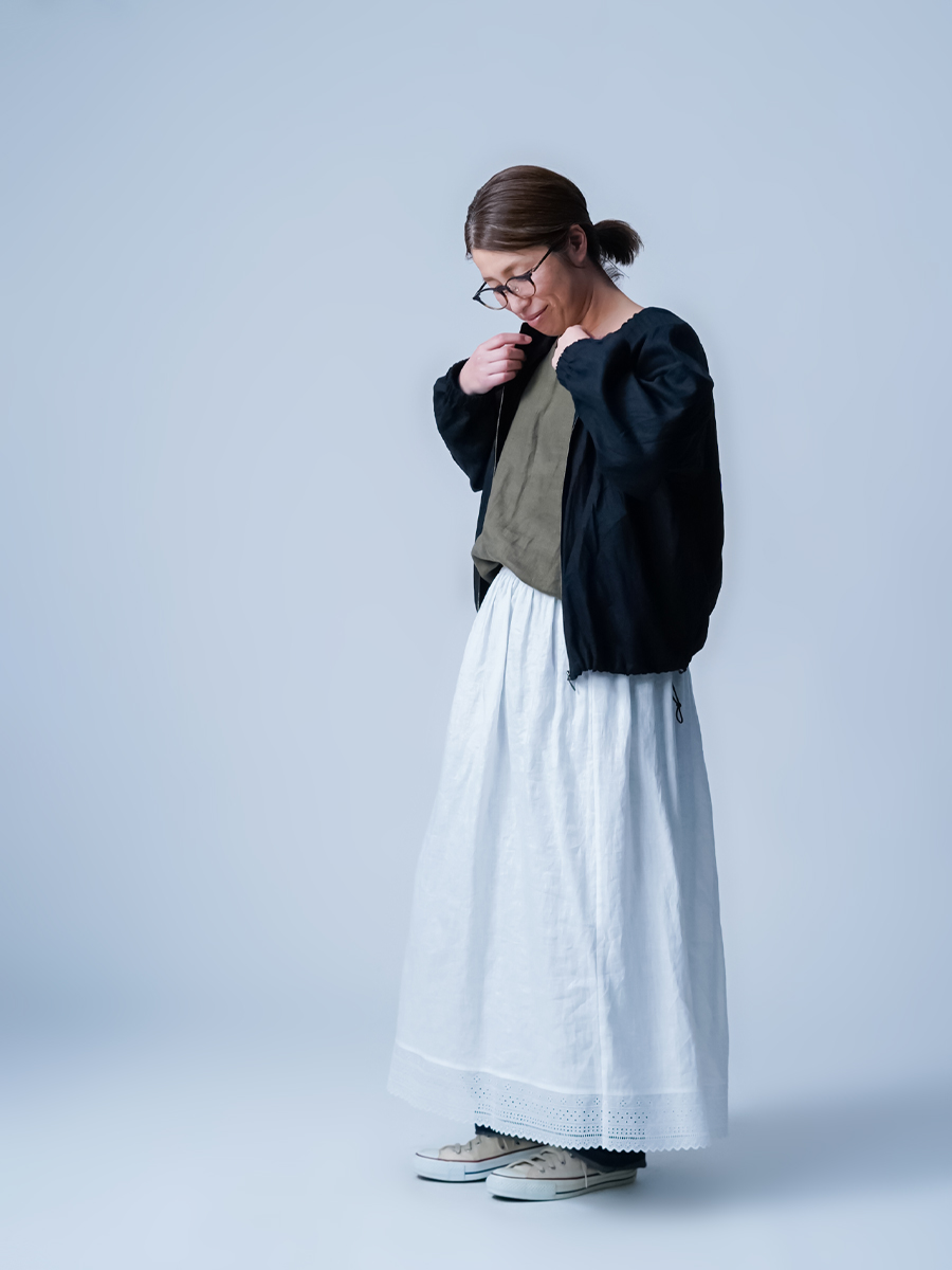 ショート丈なので、ワンピースやタブリエ、ボリュームのあるボトムスともバランスよく合わせられ、コーデに迷わないのが嬉しいポイントです。前回に比べ生地に少し厚みがある分、首回りのギャザーが調整され、より大人っぽくカッコよく仕上がった印象です。それに腰回りもふわっと立体的に見えるのでスッキリパンツを穿いた時お尻が協調されません。季節の変わり目の体温調整や、忙しい朝でも頼りになる一枚ですね。着丈はおしりの1/3、袖丈は手首まで。見た目のバランスもよく、シルエットがすっきりしているので、どんなコーデにも自然に馴染みます。
