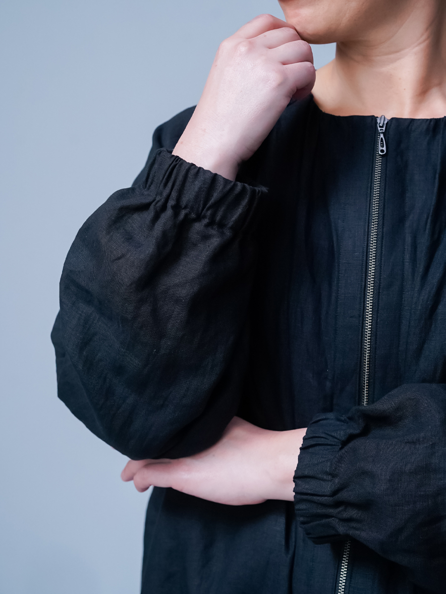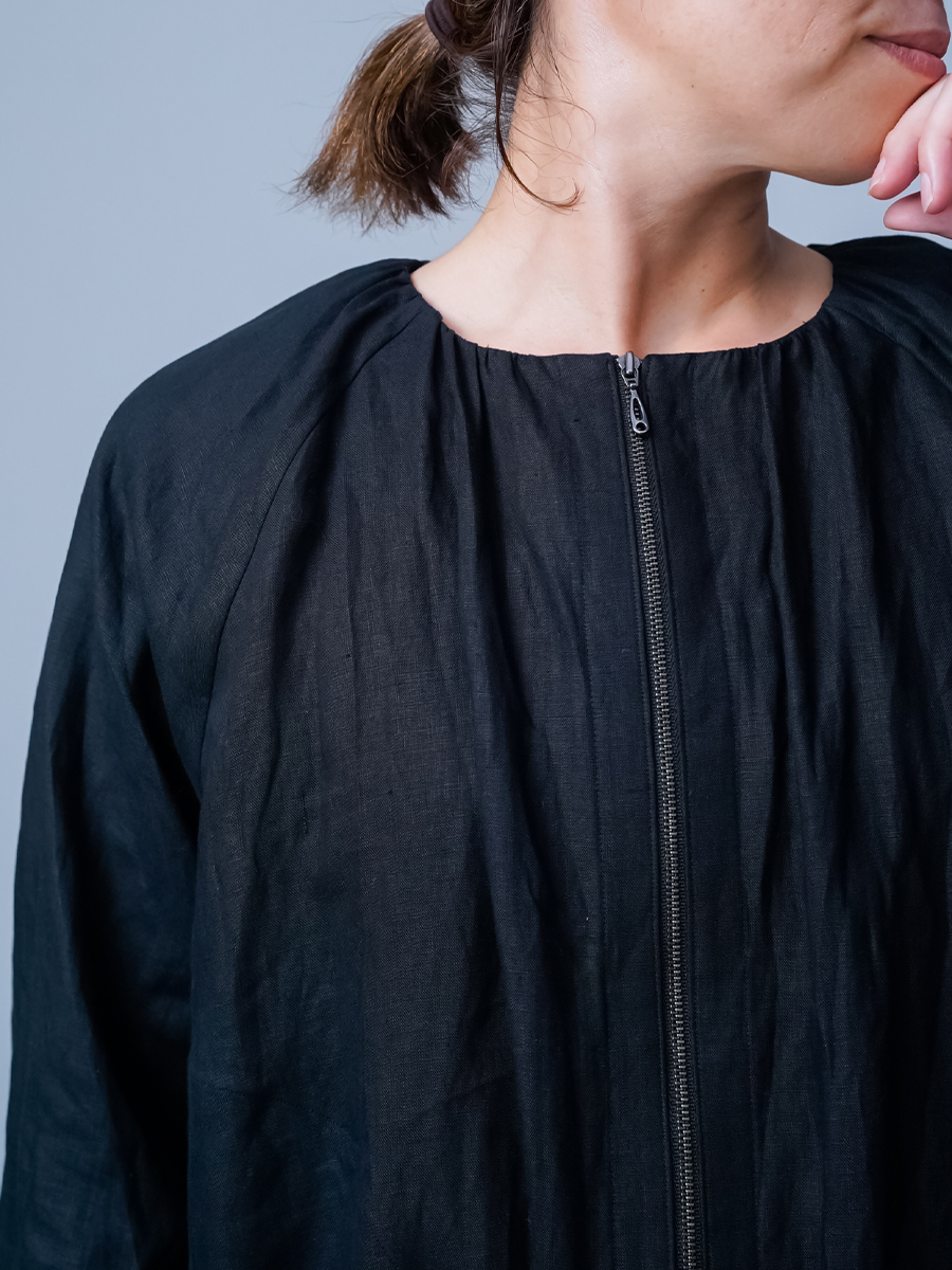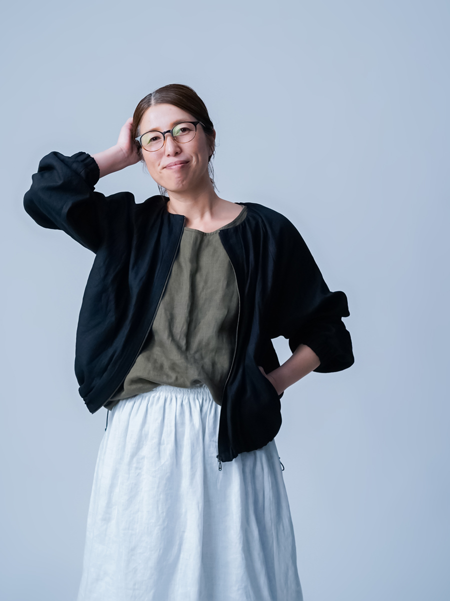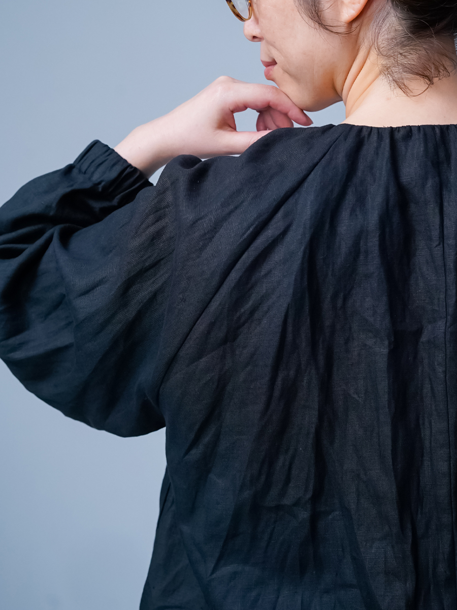 ショート丈なので、ワンピースやタブリエ、ボリュームのあるボトムスともバランスよく合わせられ、コーデに迷わないのが嬉しいポイントです。前回に比べ生地に少し厚みがある分、首回りのギャザーが調整され、より大人っぽくカッコよく仕上がった印象です。それに腰回りもふわっと立体的に見えるのでスッキリパンツを穿いた時お尻が協調されません。季節の変わり目の体温調整や、忙しい朝でも頼りになる一枚ですね。着丈はおしりの1/3、袖丈は手首まで。見た目のバランスもよく、シルエットがすっきりしているので、どんなコーデにも自然に馴染みます。