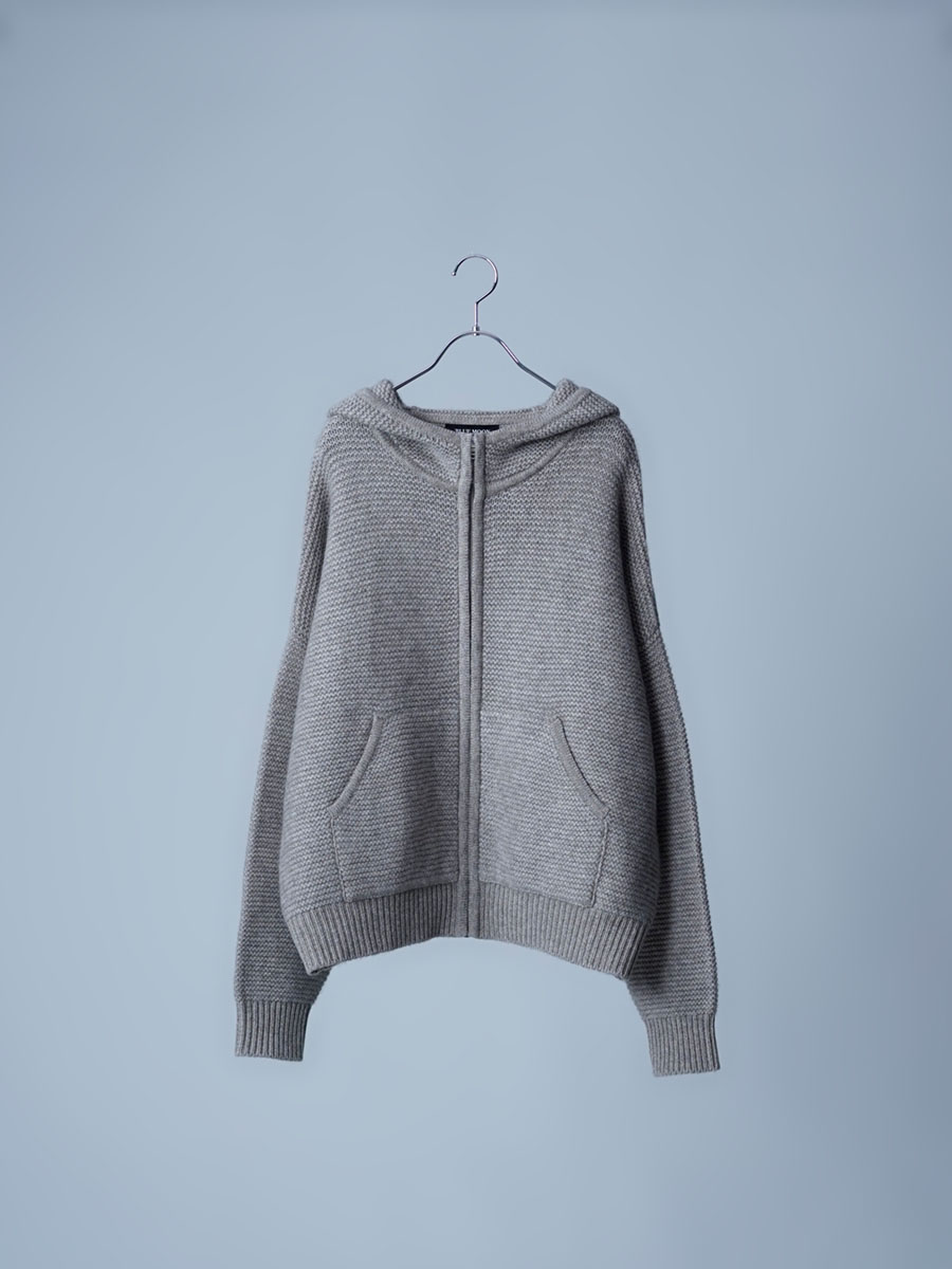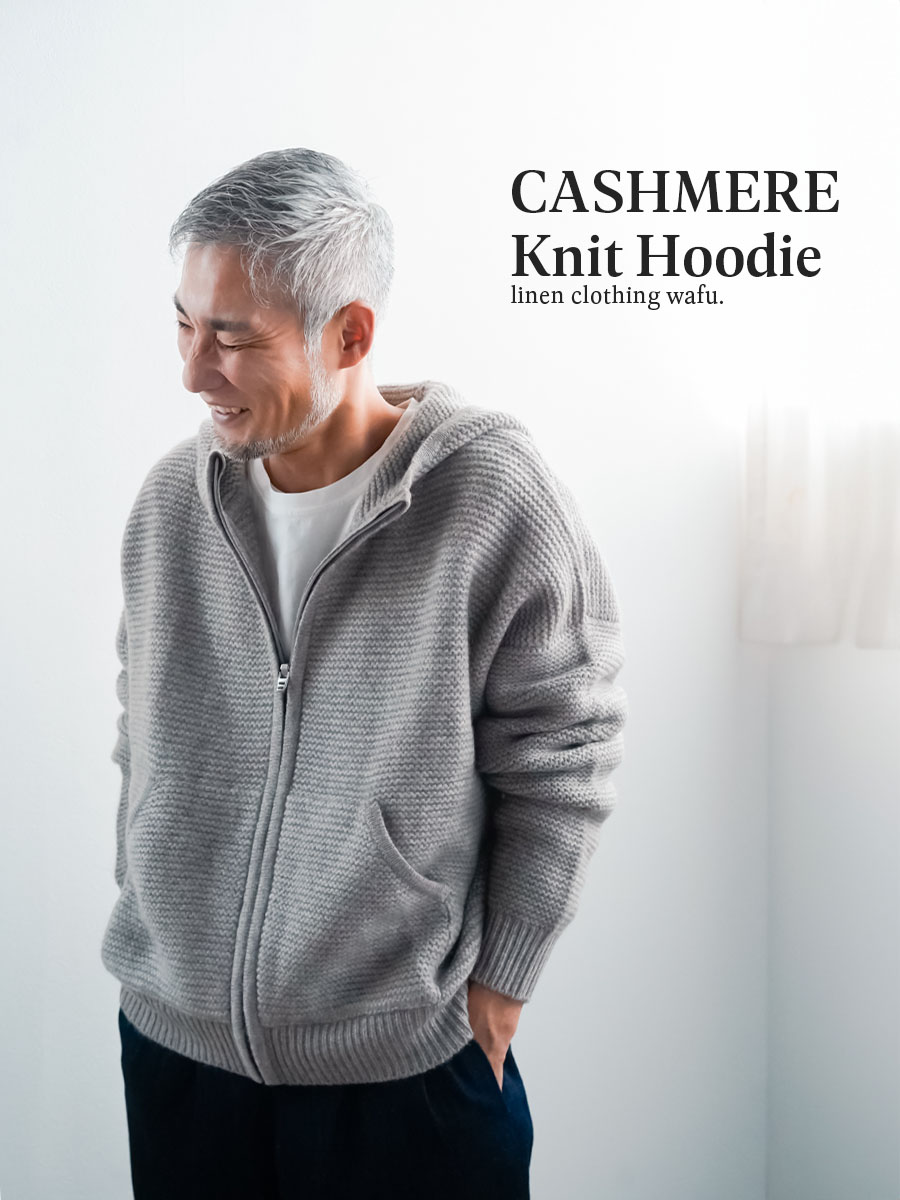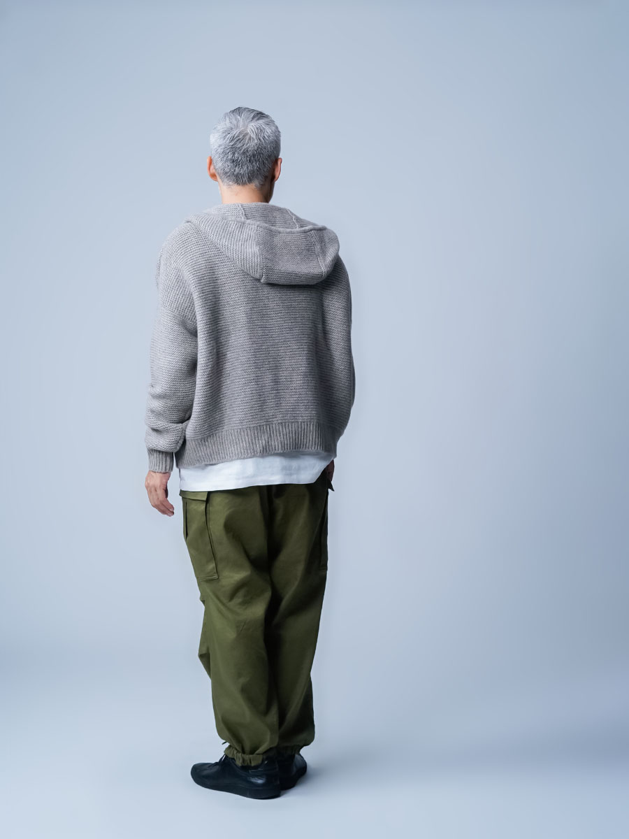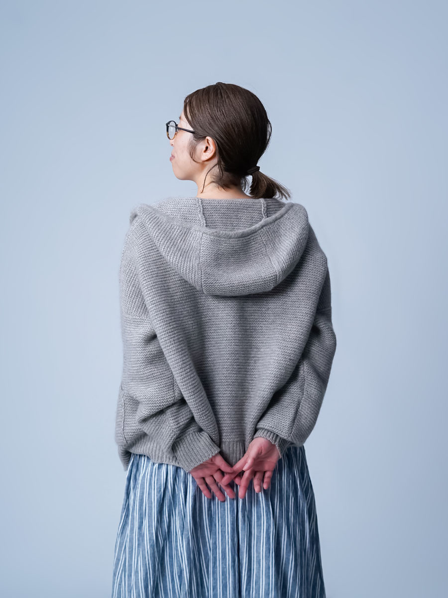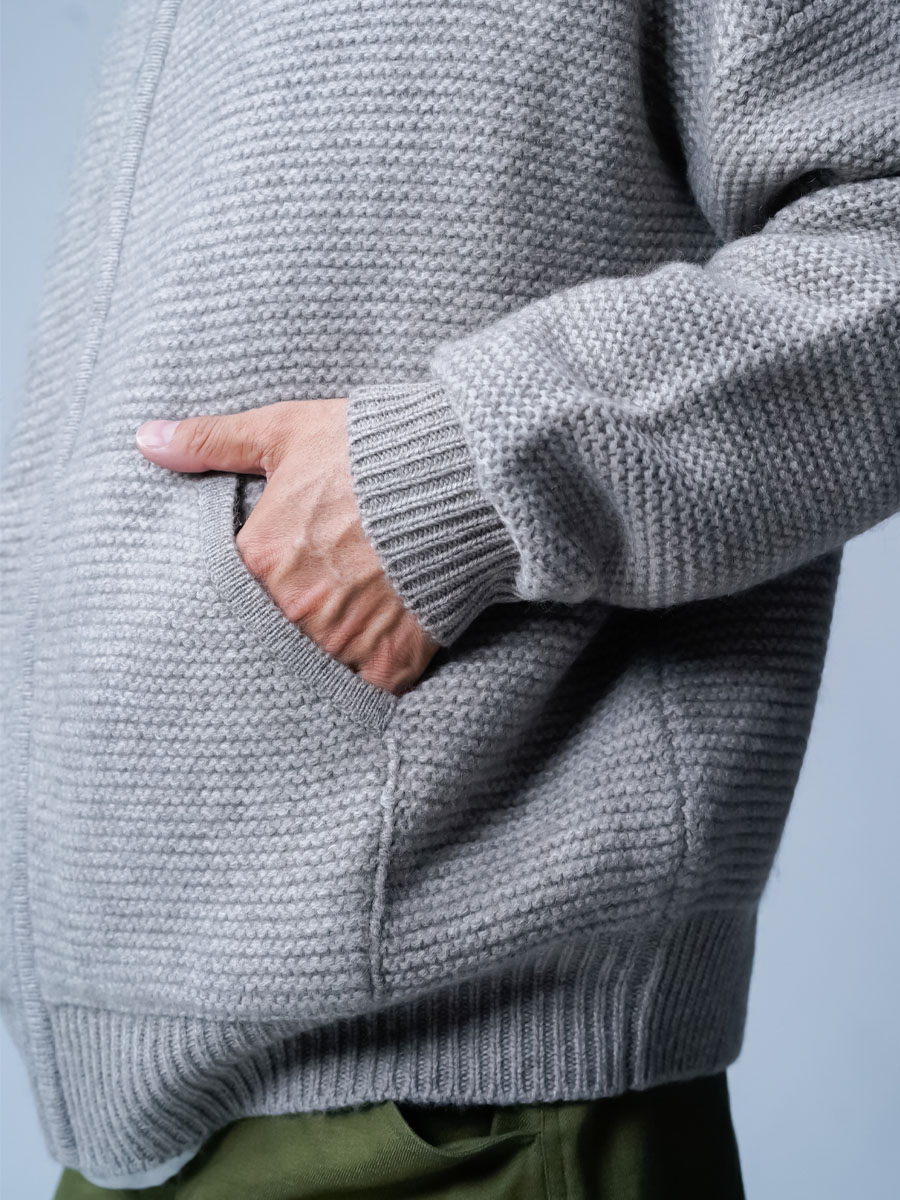 ヤクとカシミヤの混紡なんて、まず見たことがありません。持った瞬間手から感じる優しい温かさと赤ちゃんの肌みたいなキメの細かい肌あたりです。指先が喜ぶほどのなめらかさです。羽織った瞬間から全てが初めての感覚です。この未体験ゾーンぜひ皆さんにも体感してほしいです。着丈はお尻に掛かるくらい、身幅はたっぷりしているので中に着る事も可能です。袖丈は手の甲が隠れます。