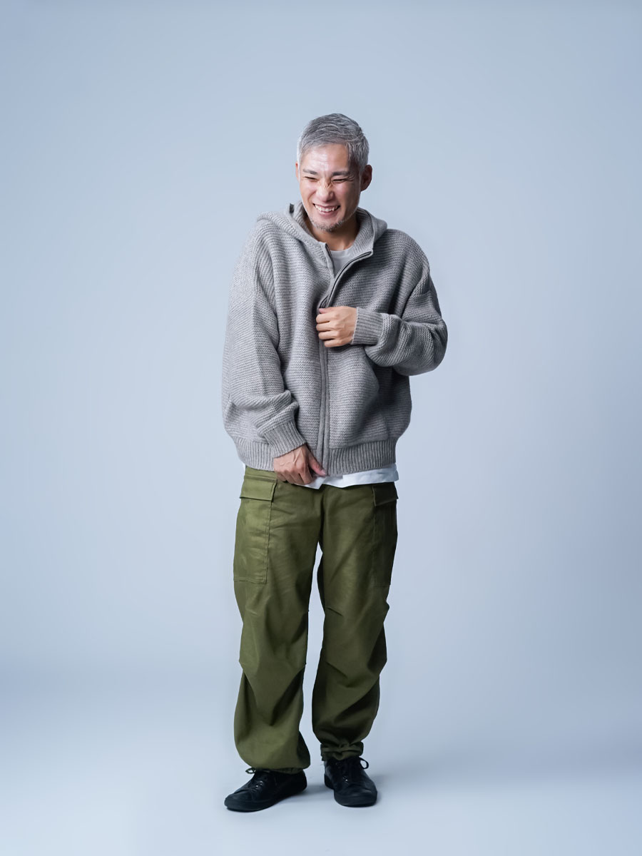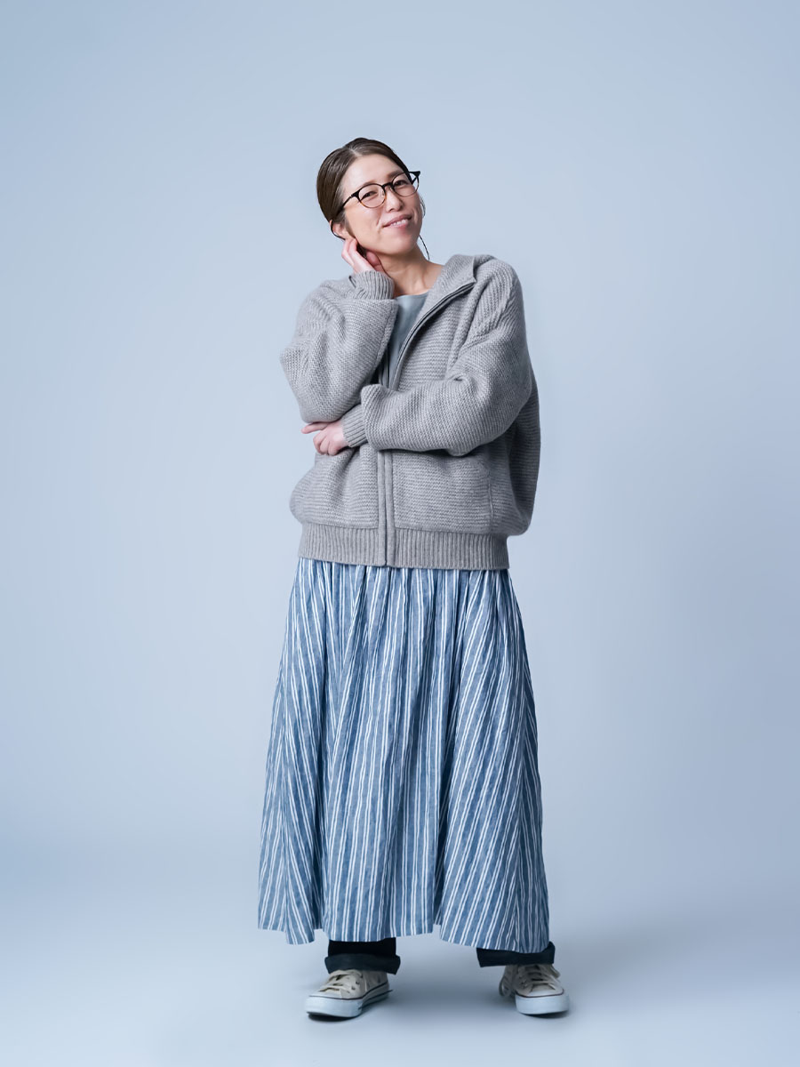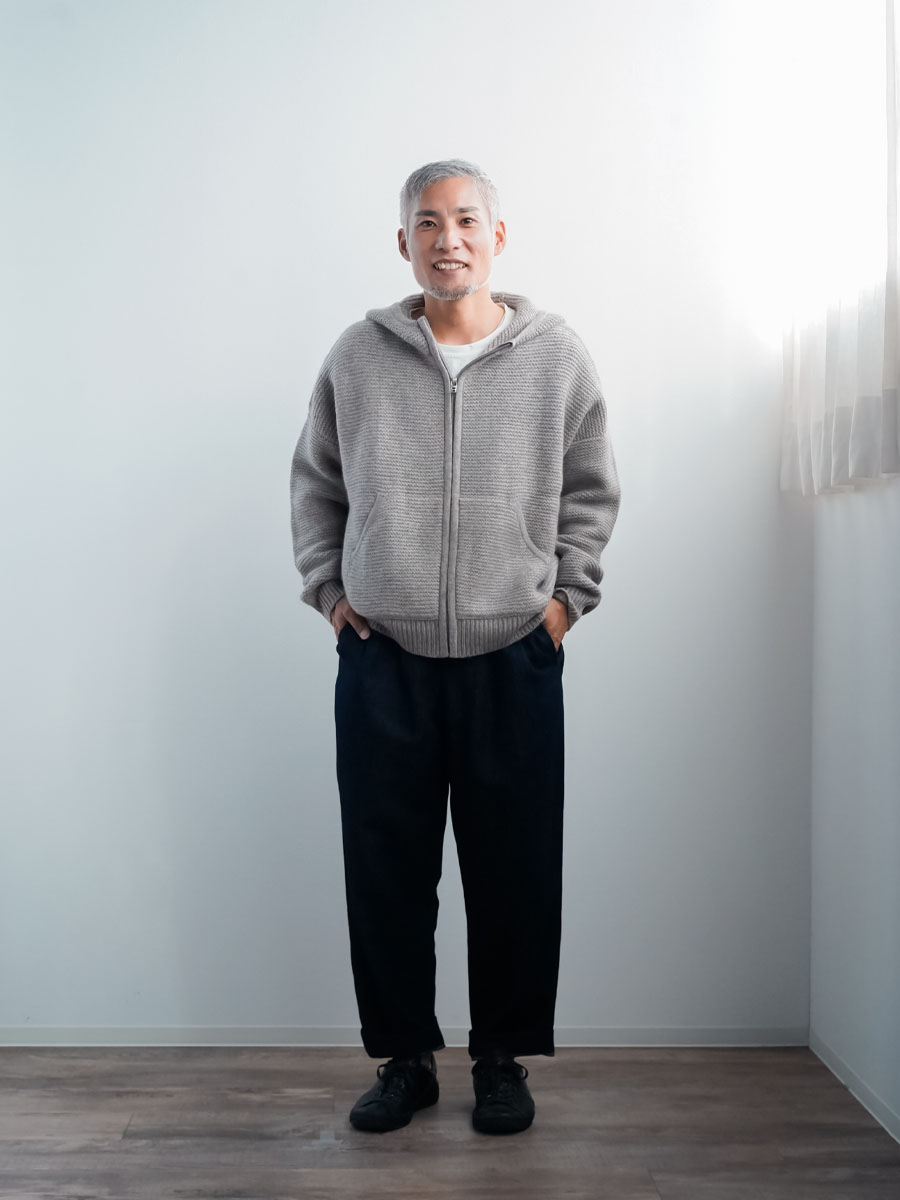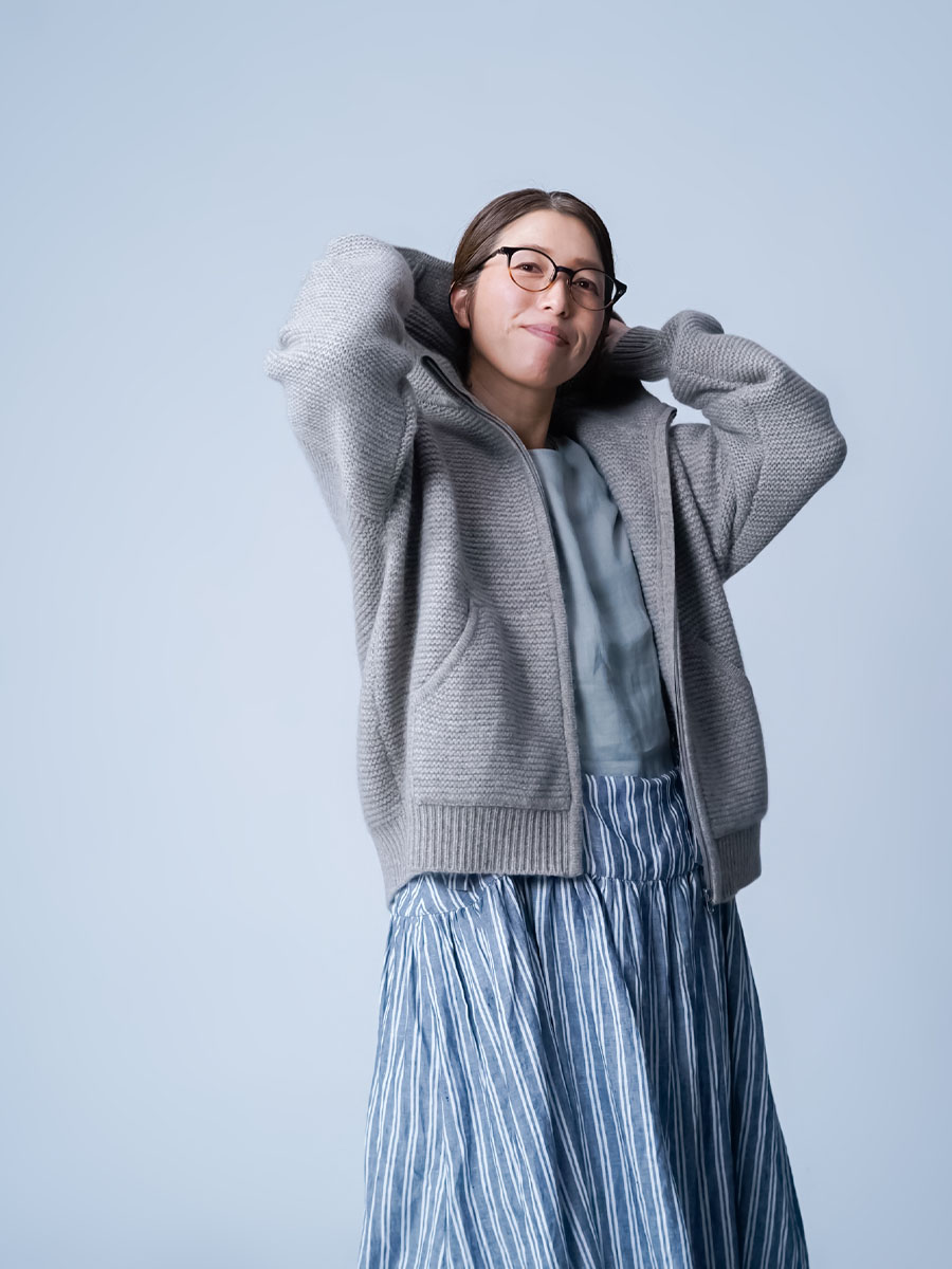 ちょうどいいサイズ感です。着丈はちょうど腰くらい。袖は手首くらいです。身幅には充分なゆとりがあるので、中に色々着こんでも大丈夫そうです。見た目は結構ボリュームがあり重そうなのですが、着るとその軽さに驚きます。着心地もなめらかで、これにも驚かされました。何しろヤク×カシミヤの組み合わせはなんて体験したことがないので、それも仕方ないと思いますが。ぜひ皆さんにも体験して欲しいと思います。