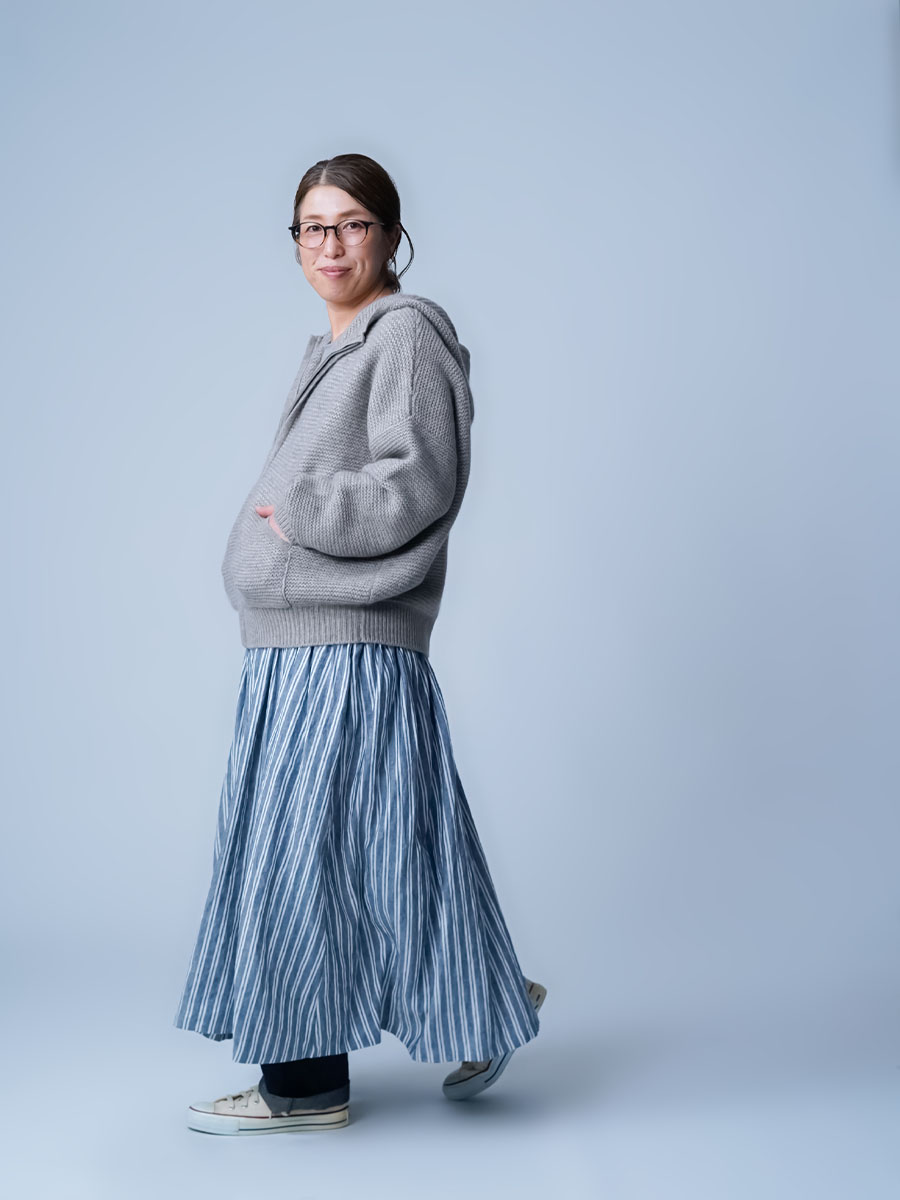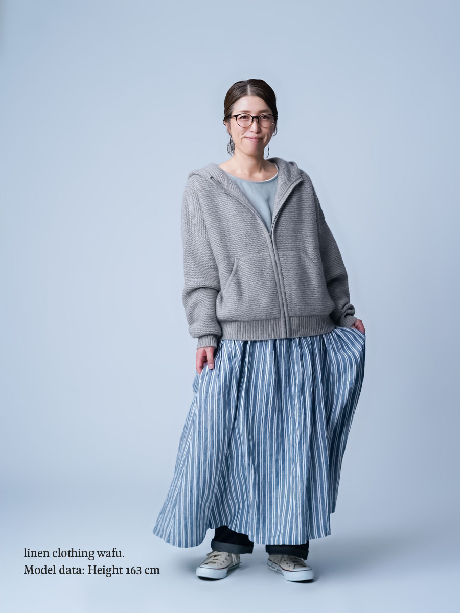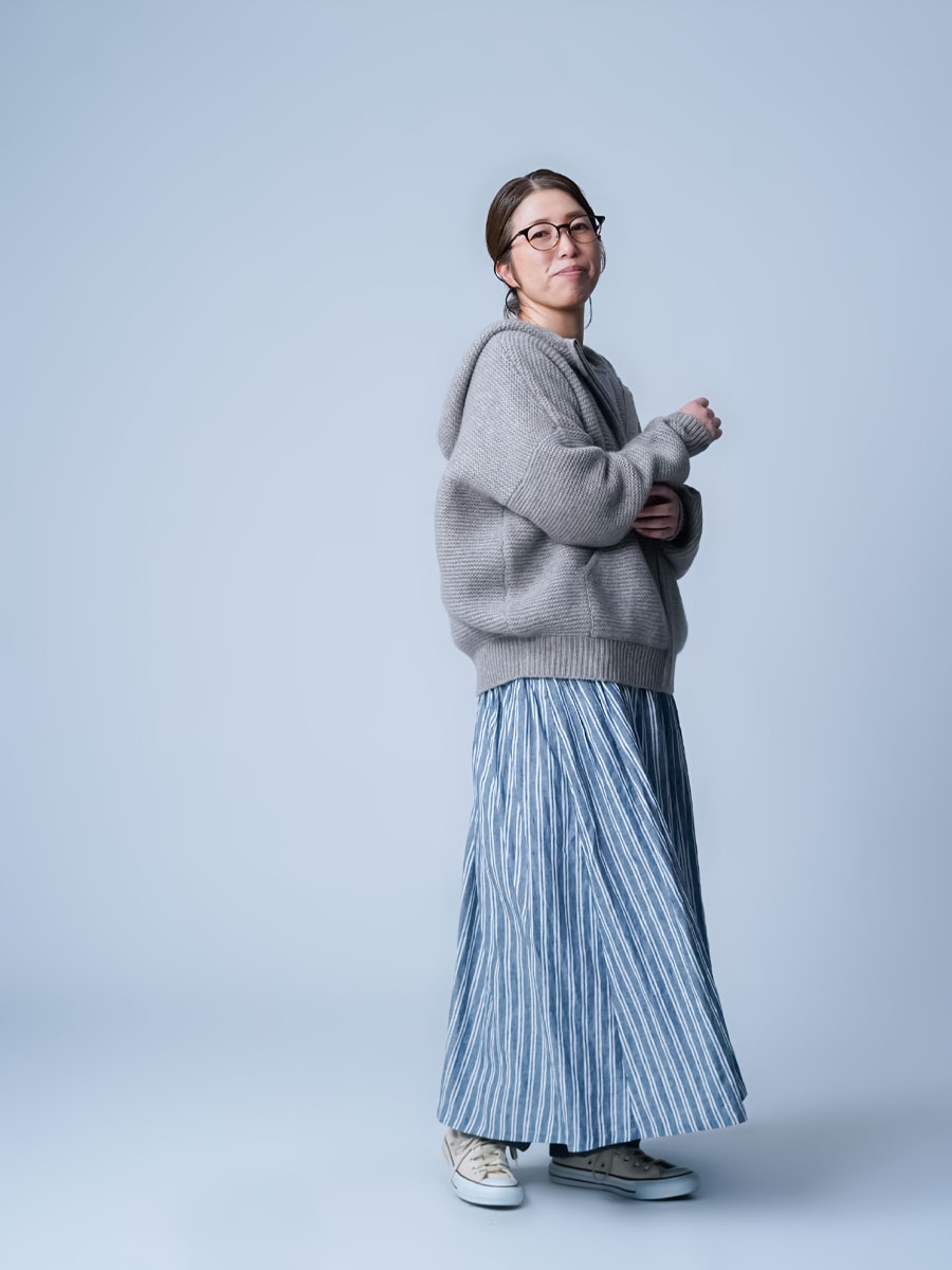 ニットのパーカーなのでカジュアル過ぎない感じがよいですね。着丈はおしりが隠れるくらい。袖丈は指先が袖のリブ編みの切替部分くらい。暖かく心地の良いしっかりとした重みがあります。ゆったりしてますが、すごく大きい印象はなくパートナーと共有できそうです。