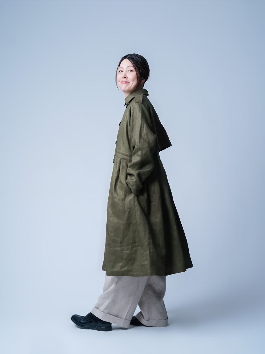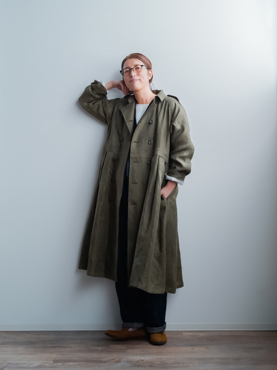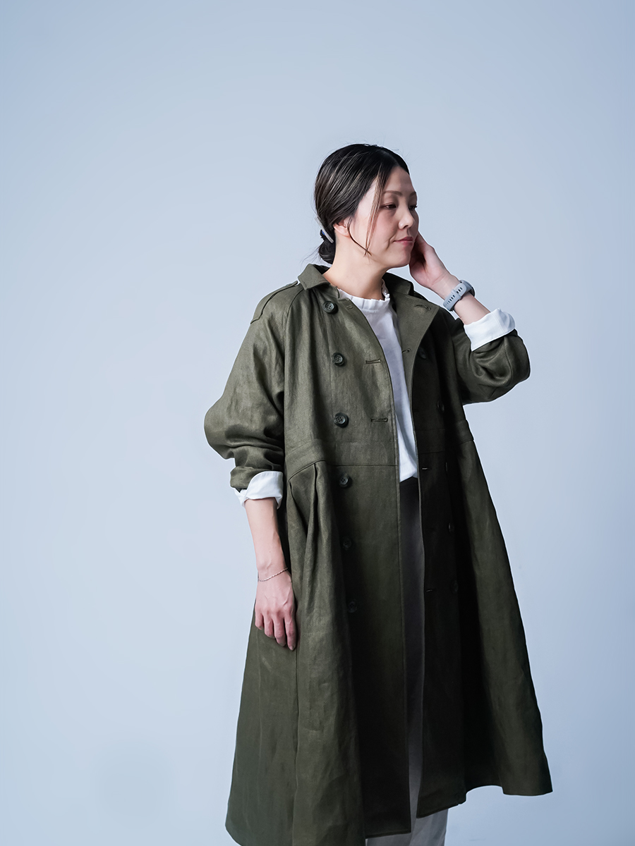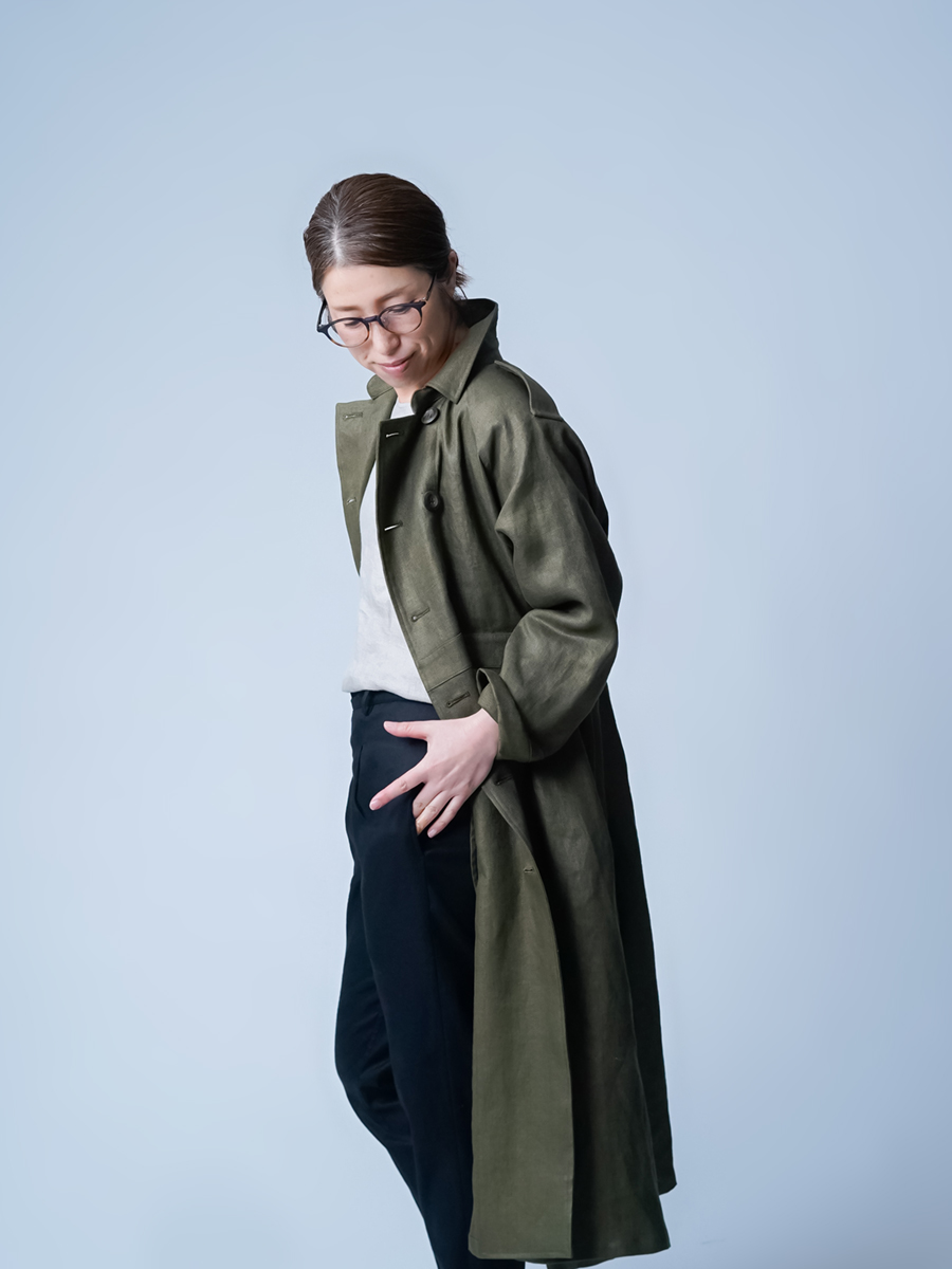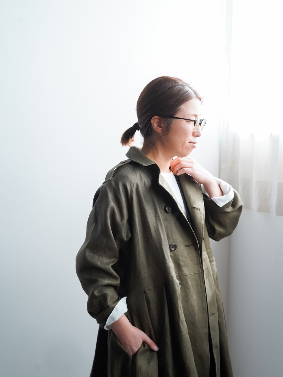 私はMサイズを選びました。トレンチらしい、きりっとしたカッコよさの中にリネンのしなやかさが光る一着です。全体的にゆとりがあり、インナーを重ねてももたつかず、季節をまたいで長く楽しめます。襟まわりにはしっかり芯が入っているので、襟を立ててもきちんと自立、少し抜いて着ると自然な抜け感が出て、そこがまた好みです。着丈は脛あたり。動くたびにリネンがふわっと揺れて上品ですね。肩幅は全く気にならず、胸まわりもボタンをすべて留めてもゆとりがあり、厚手のニットを中に着ても干渉しない頼もしさです。
