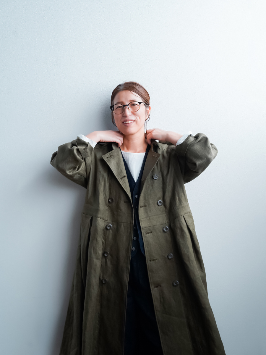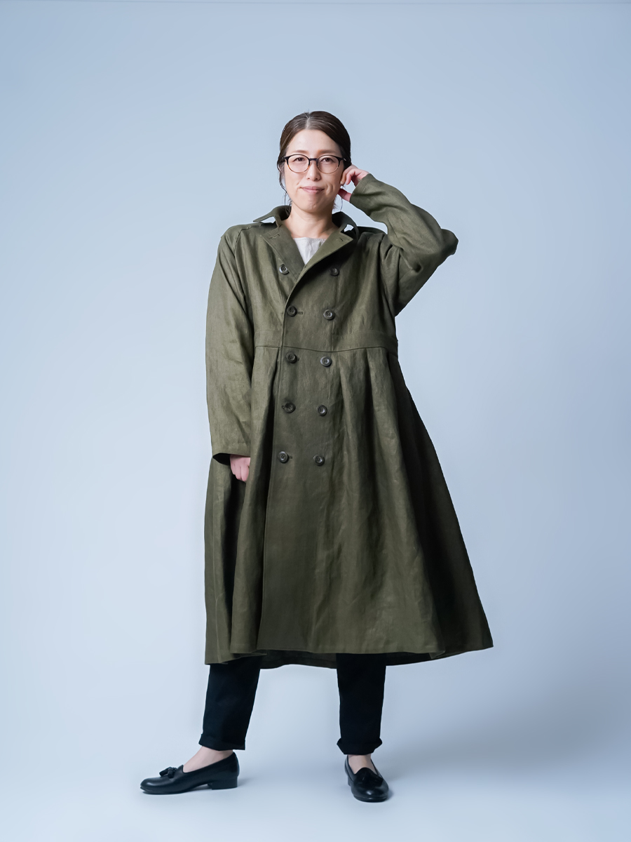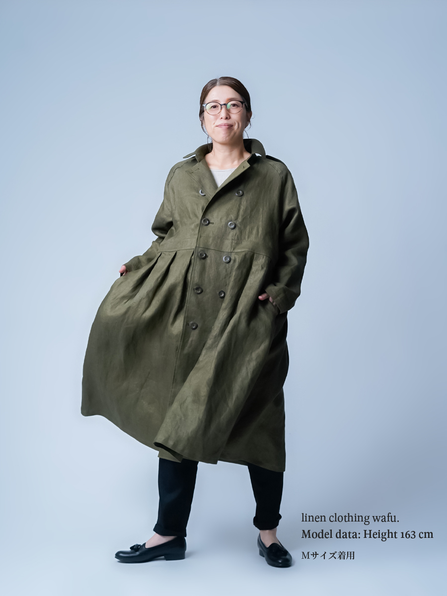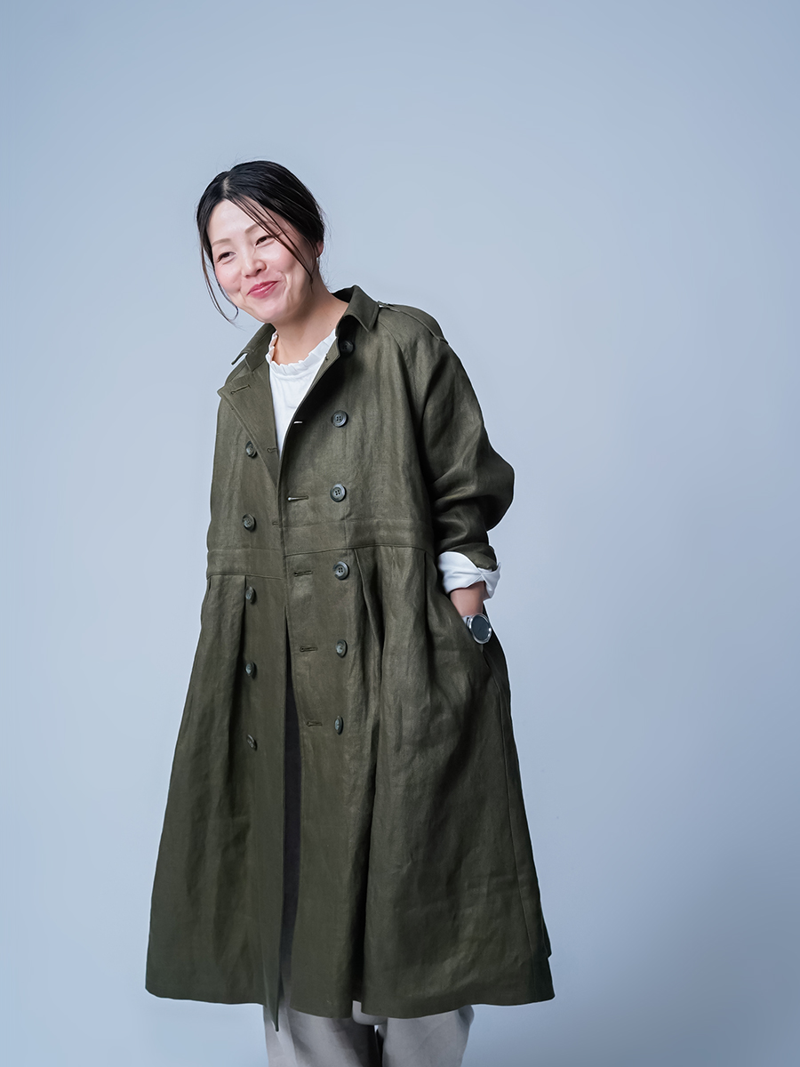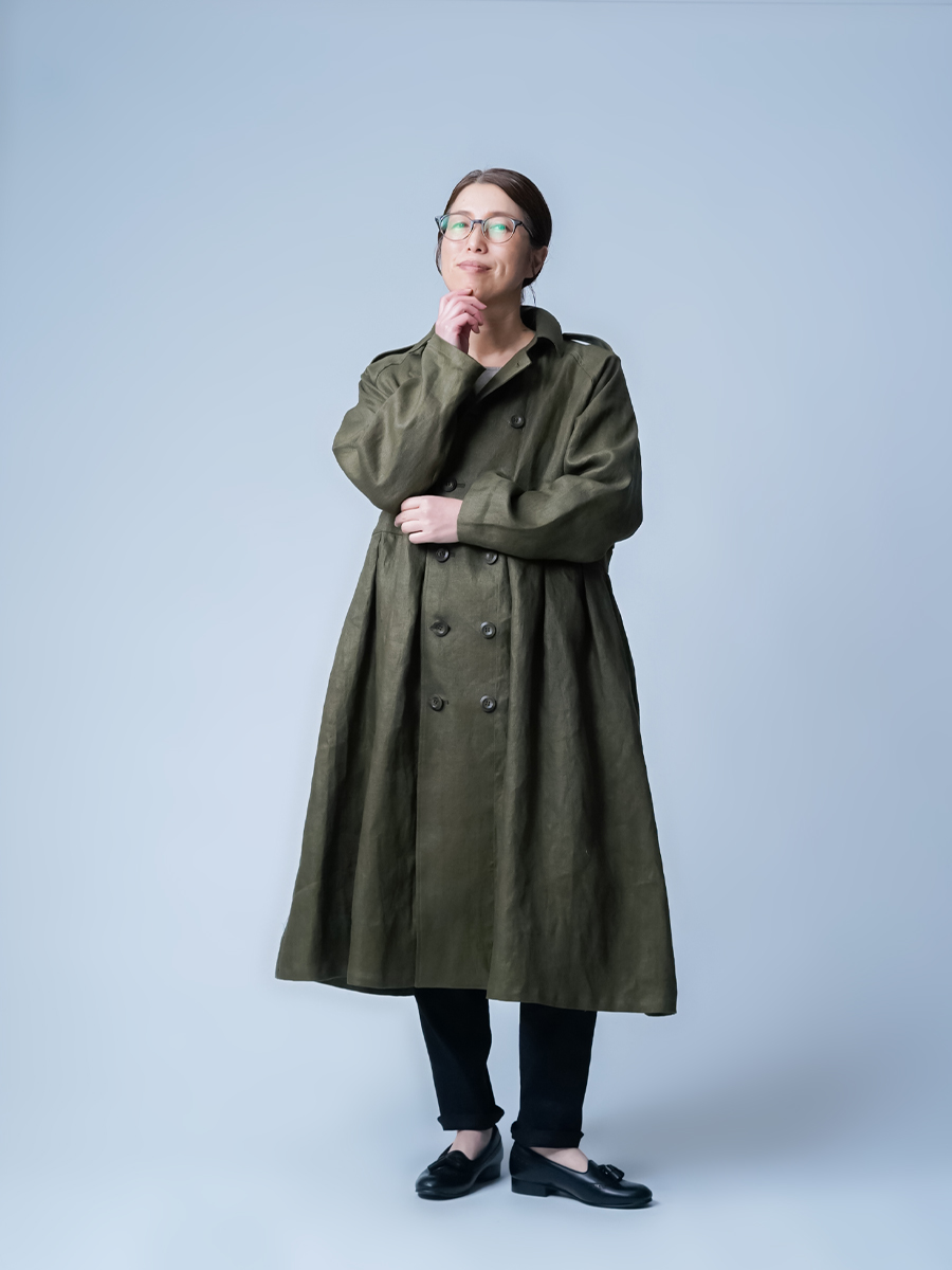 私はMサイズを選びました。トレンチらしい、きりっとしたカッコよさの中にリネンのしなやかさが光る一着です。全体的にゆとりがあり、インナーを重ねてももたつかず、季節をまたいで長く楽しめます。襟まわりにはしっかり芯が入っているので、襟を立ててもきちんと自立、少し抜いて着ると自然な抜け感が出て、そこがまた好みです。着丈は脛あたり。動くたびにリネンがふわっと揺れて上品ですね。肩幅は全く気にならず、胸まわりもボタンをすべて留めてもゆとりがあり、厚手のニットを中に着ても干渉しない頼もしさです。
