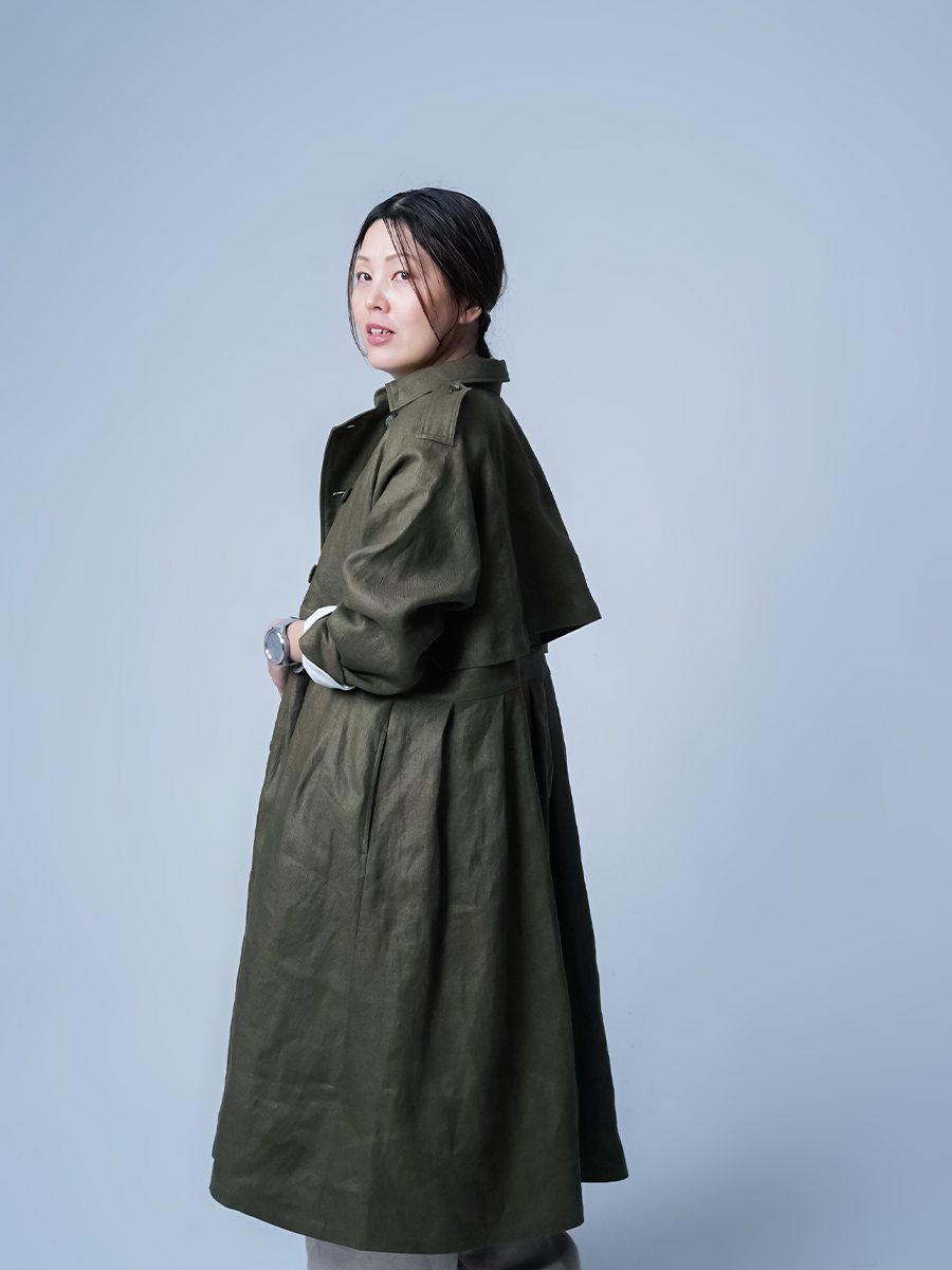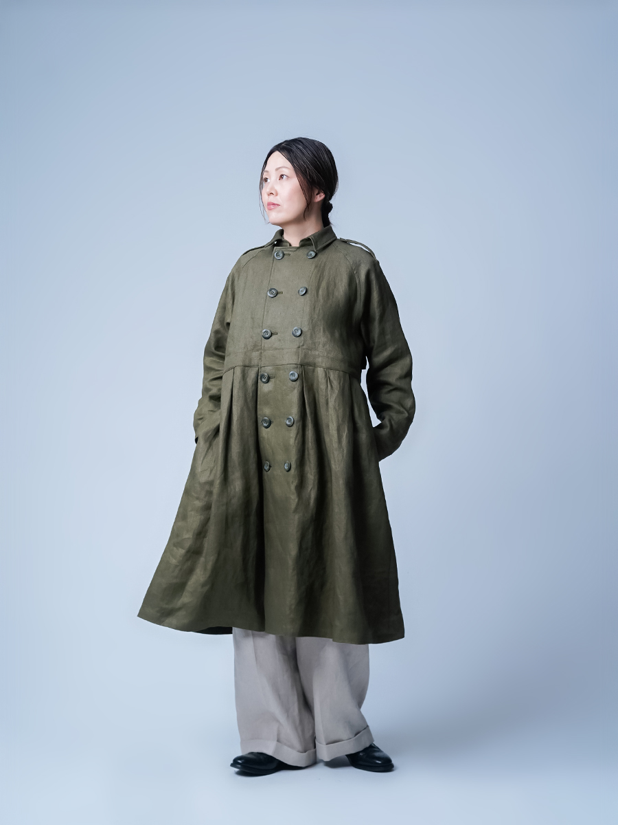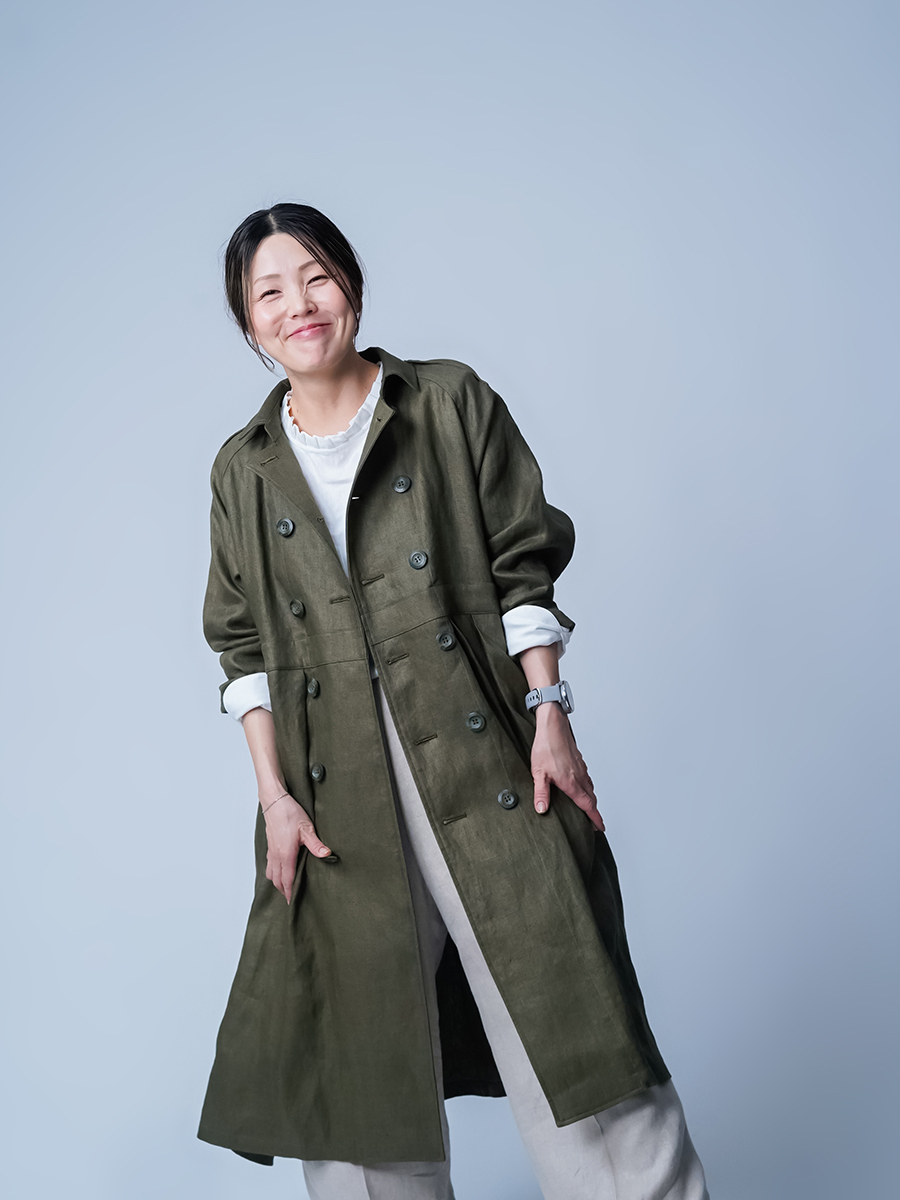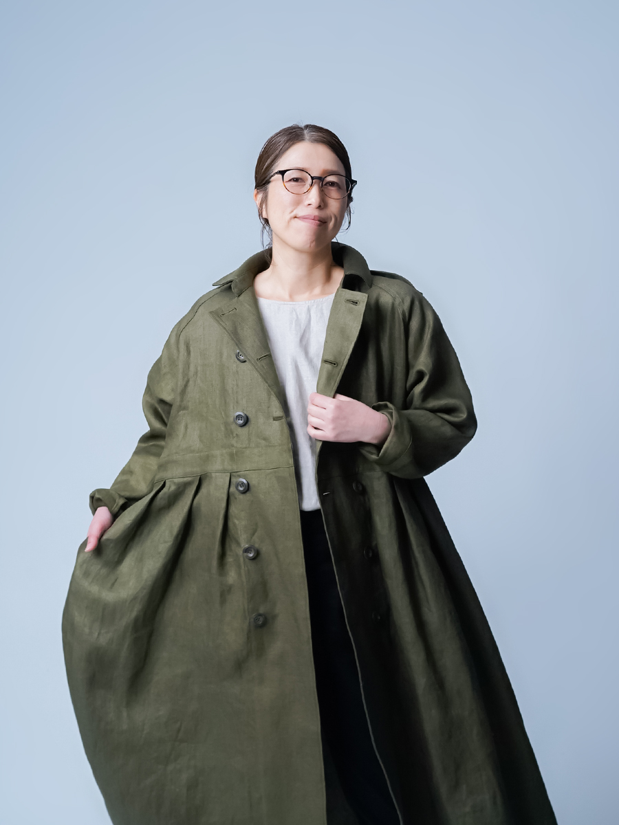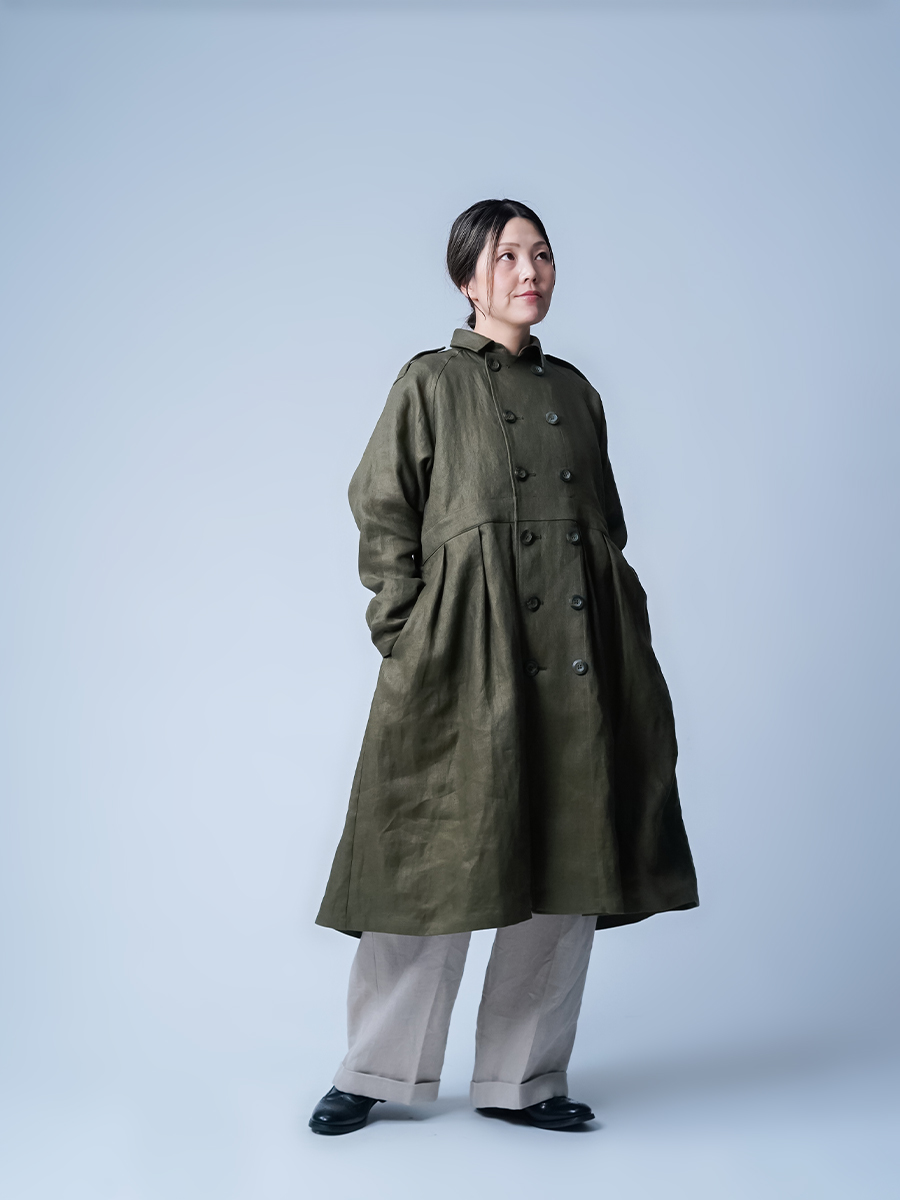 私はMサイズを選びました。トレンチらしい、きりっとしたカッコよさの中にリネンのしなやかさが光る一着です。全体的にゆとりがあり、インナーを重ねてももたつかず、季節をまたいで長く楽しめます。襟まわりにはしっかり芯が入っているので、襟を立ててもきちんと自立、少し抜いて着ると自然な抜け感が出て、そこがまた好みです。着丈は脛あたり。動くたびにリネンがふわっと揺れて上品ですね。肩幅は全く気にならず、胸まわりもボタンをすべて留めてもゆとりがあり、厚手のニットを中に着ても干渉しない頼もしさです。