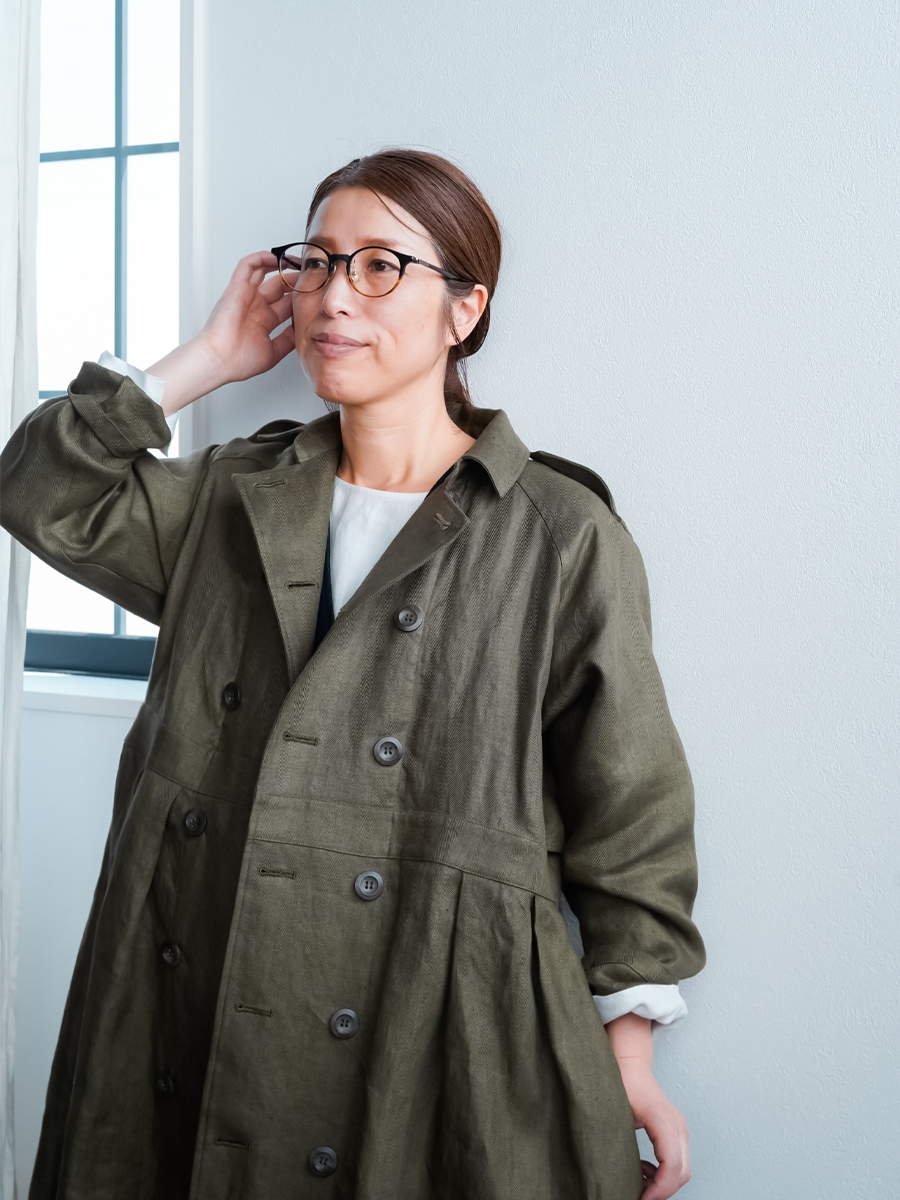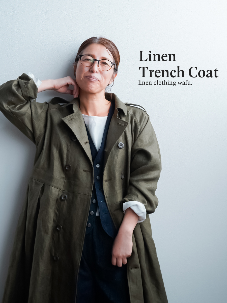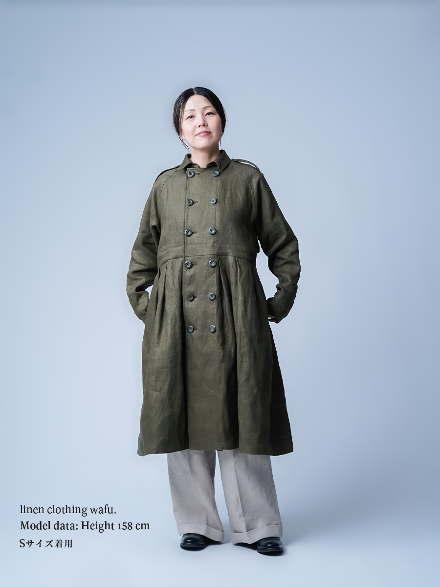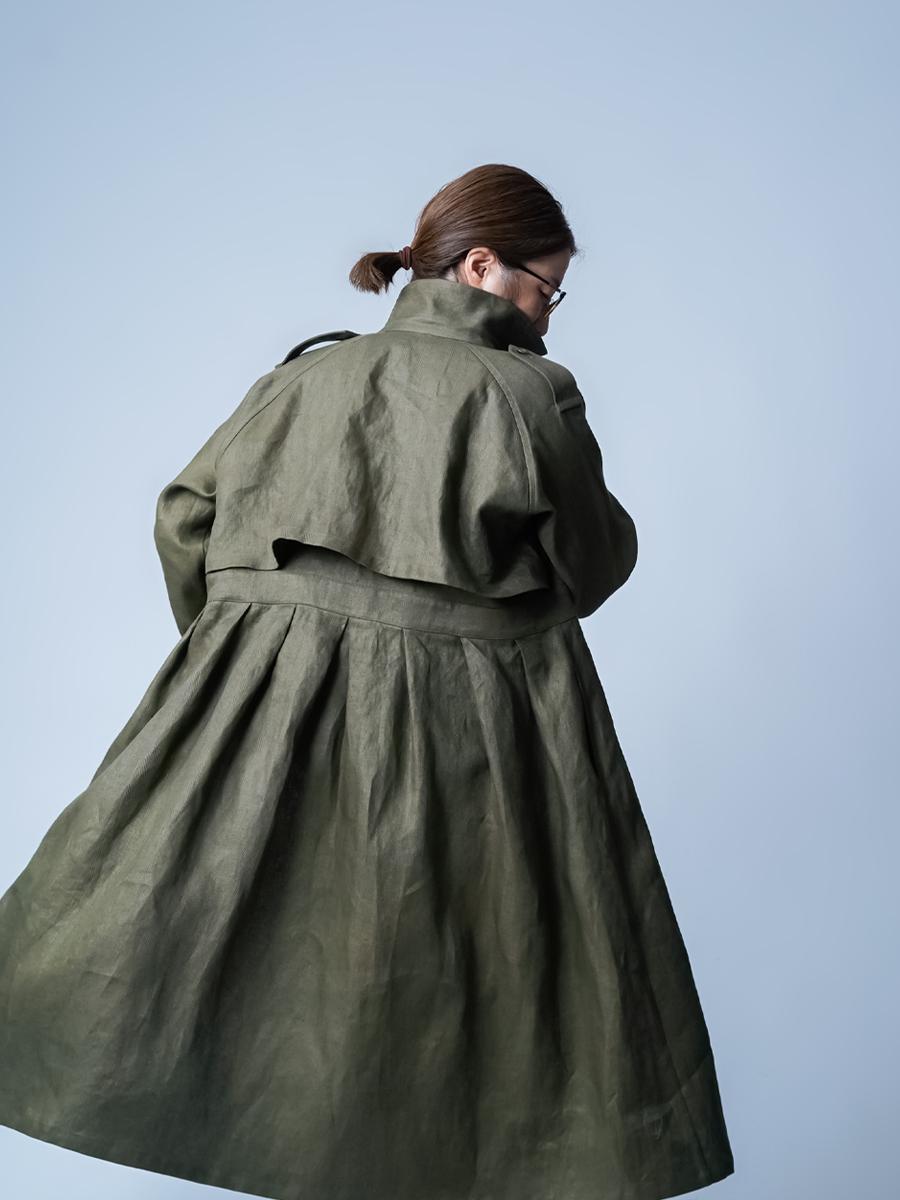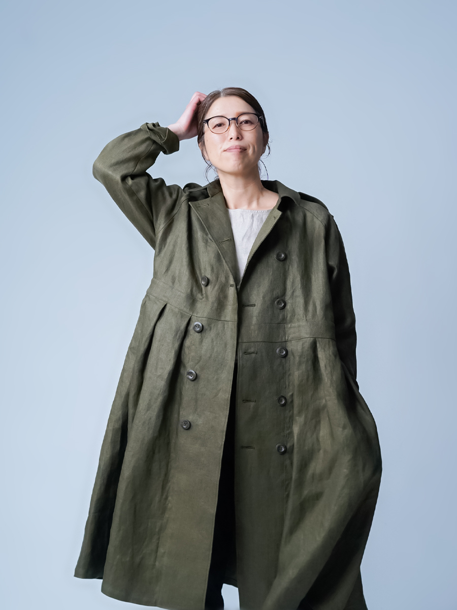 私はMサイズを選びました。トレンチらしい、きりっとしたカッコよさの中にリネンのしなやかさが光る一着です。全体的にゆとりがあり、インナーを重ねてももたつかず、季節をまたいで長く楽しめます。襟まわりにはしっかり芯が入っているので、襟を立ててもきちんと自立、少し抜いて着ると自然な抜け感が出て、そこがまた好みです。着丈は脛あたり。動くたびにリネンがふわっと揺れて上品ですね。肩幅は全く気にならず、胸まわりもボタンをすべて留めてもゆとりがあり、厚手のニットを中に着ても干渉しない頼もしさです。