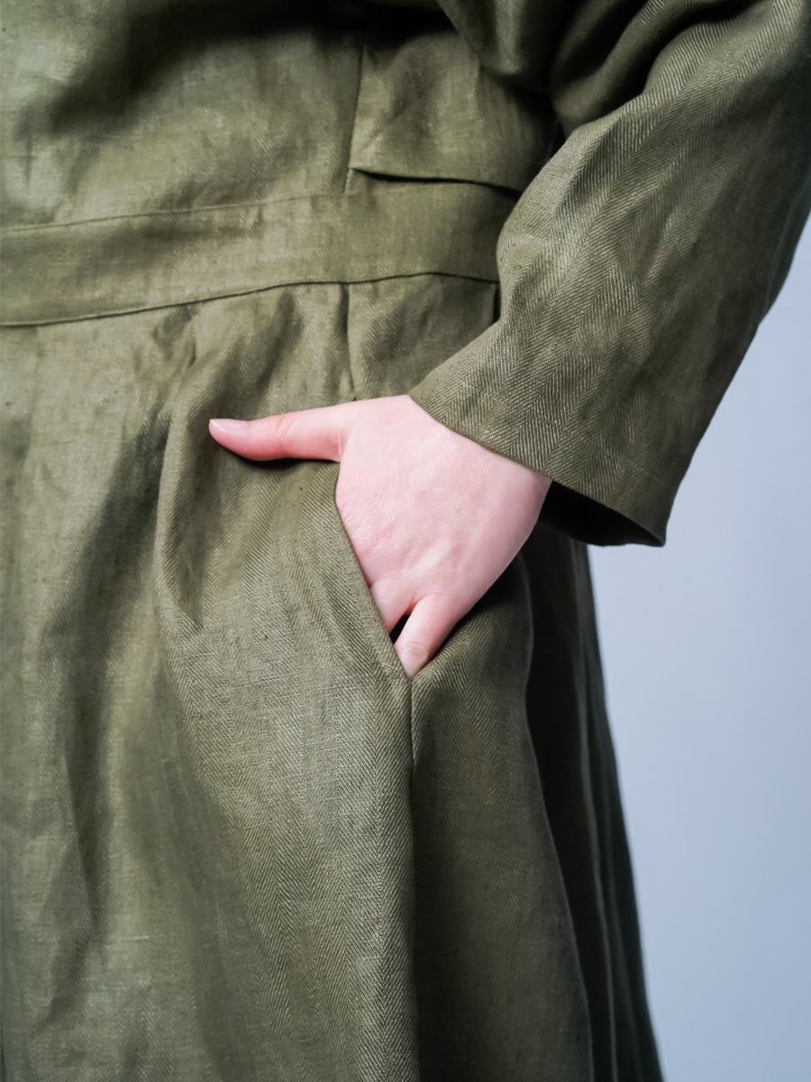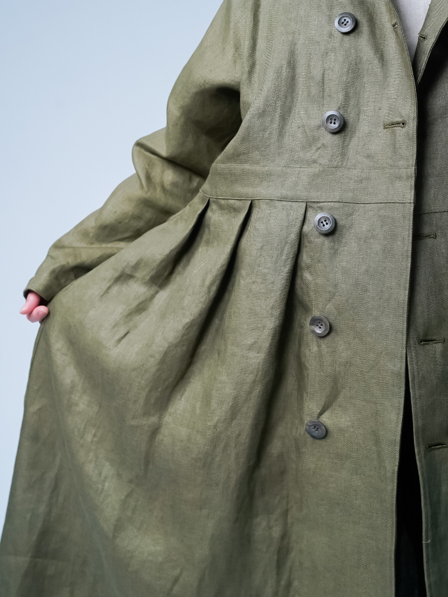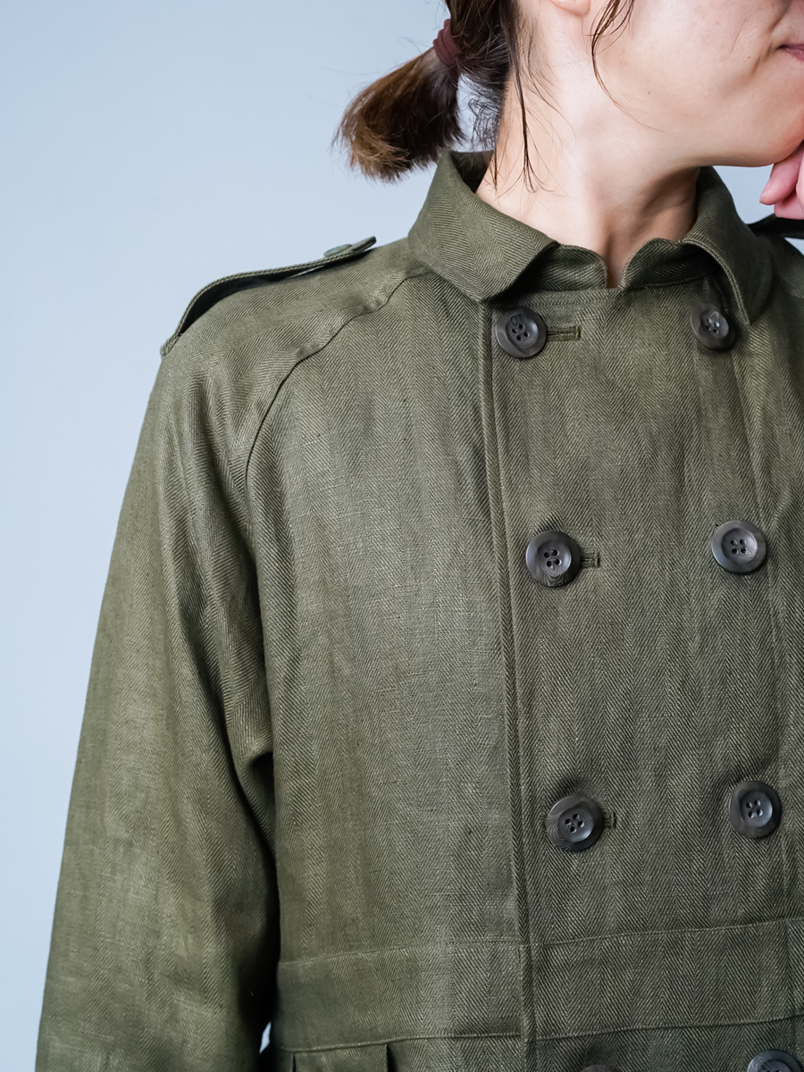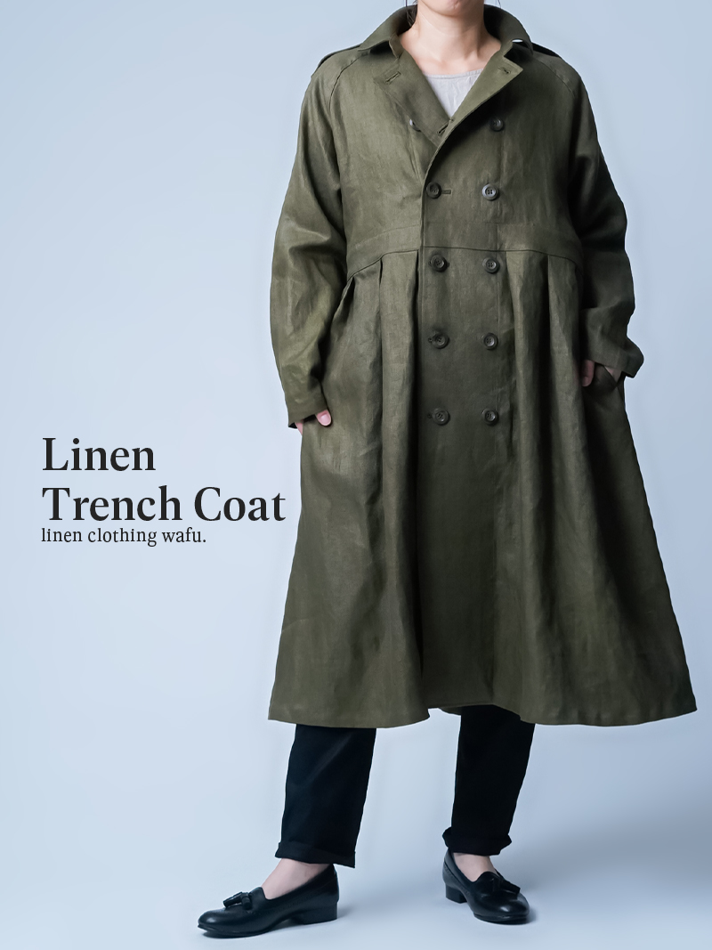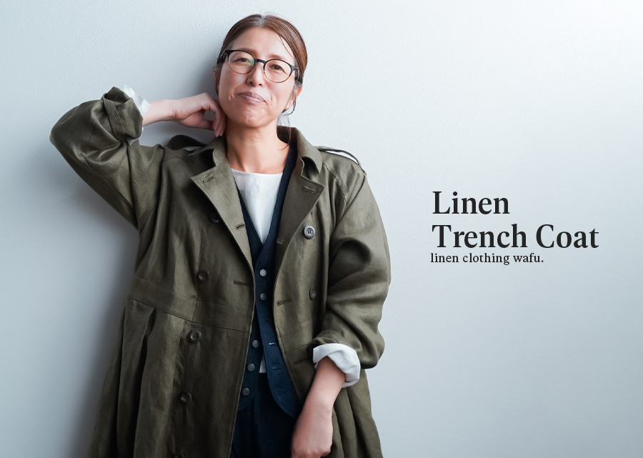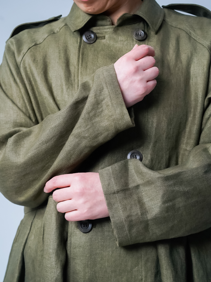 私はMサイズを選びました。トレンチらしい、きりっとしたカッコよさの中にリネンのしなやかさが光る一着です。全体的にゆとりがあり、インナーを重ねてももたつかず、季節をまたいで長く楽しめます。襟まわりにはしっかり芯が入っているので、襟を立ててもきちんと自立、少し抜いて着ると自然な抜け感が出て、そこがまた好みです。着丈は脛あたり。動くたびにリネンがふわっと揺れて上品ですね。肩幅は全く気にならず、胸まわりもボタンをすべて留めてもゆとりがあり、厚手のニットを中に着ても干渉しない頼もしさです。