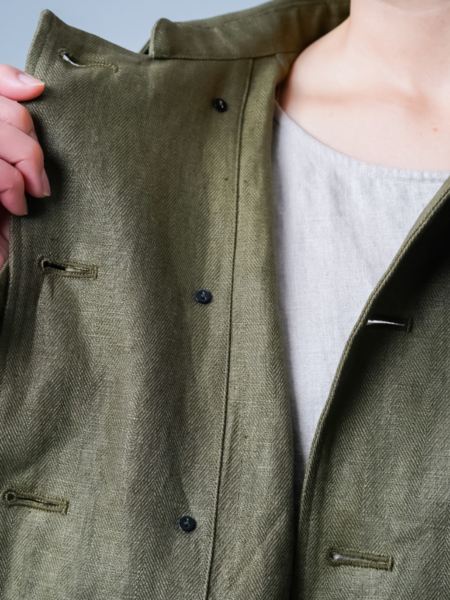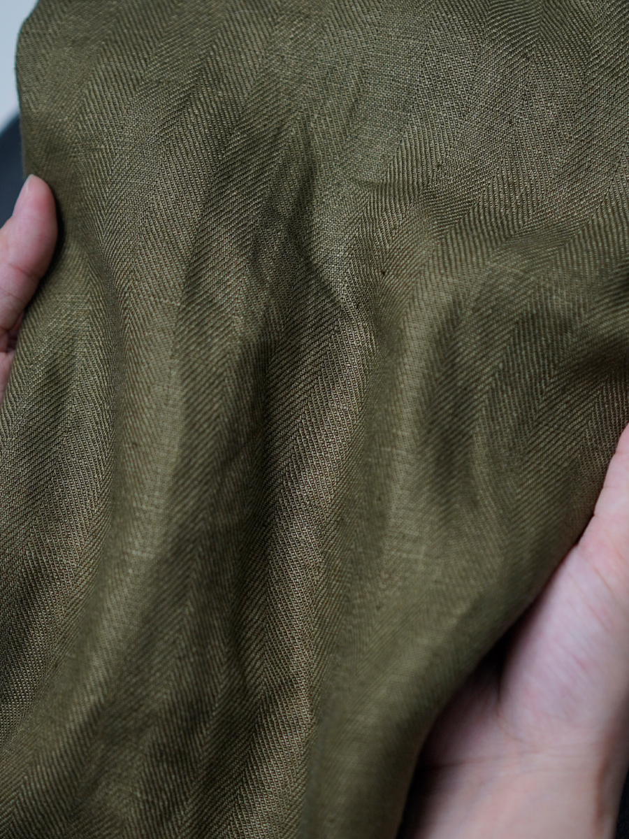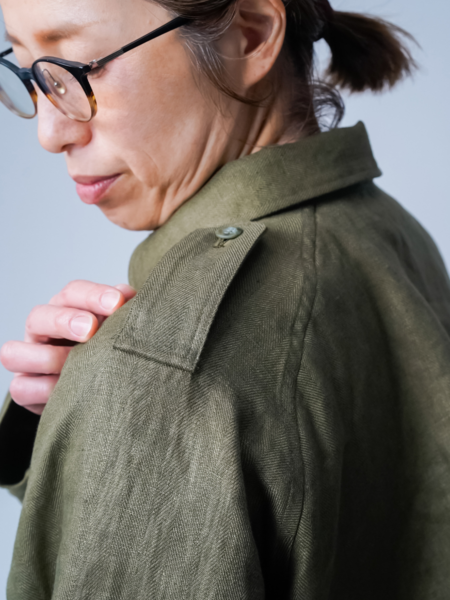 - ※生地工場の生産時期によって色味の濃淡が出ることがございます。セットアップでの着用の場合はご相談下さい。カラーリネンは最初色落ちや生地の性質上、毛羽落ちがある場合がございます。落ち着くまで数回は単品でのお洗濯を。最初は水通しをおすすめします。表面の毛羽立ちがとれて、肌への刺激が極端に少なくなります。リネン特有のネップ、節がございます。