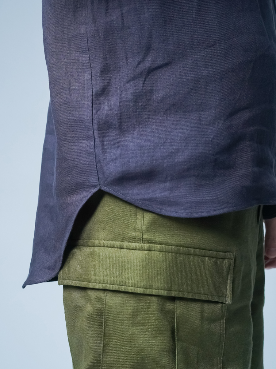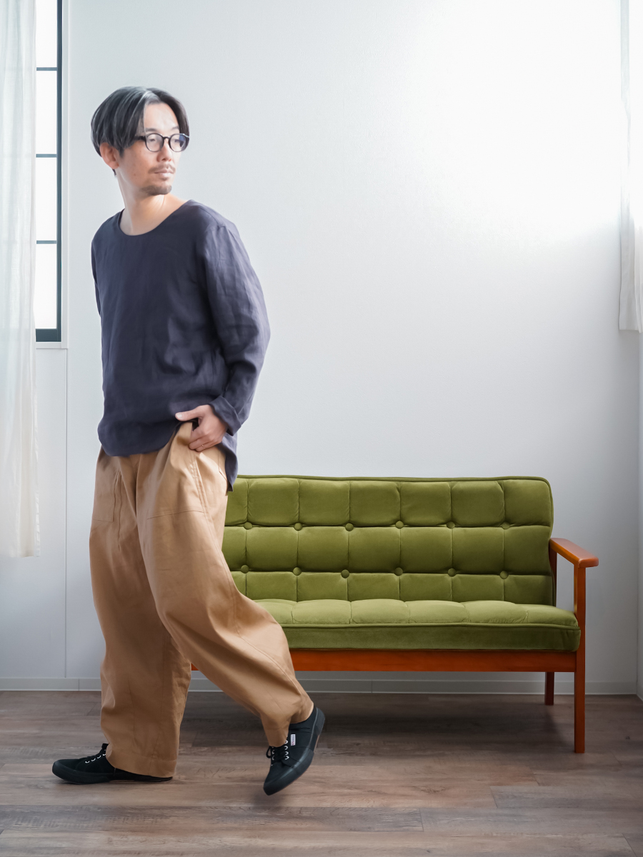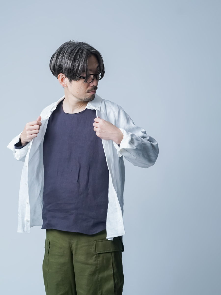 - ※生地工場の生産時期によって色味の濃淡が出ることがございます。セットアップでの着用の場合はご相談下さい。カラーリネンは最初色落ちや生地の性質上、毛羽落ちがある場合がございます。落ち着くまで数回は単品でのお洗濯を。最初は水通しをおすすめします。表面の毛羽立ちがとれて、肌への刺激が極端に少なくなります。リネン特有のネップ、節がございます。