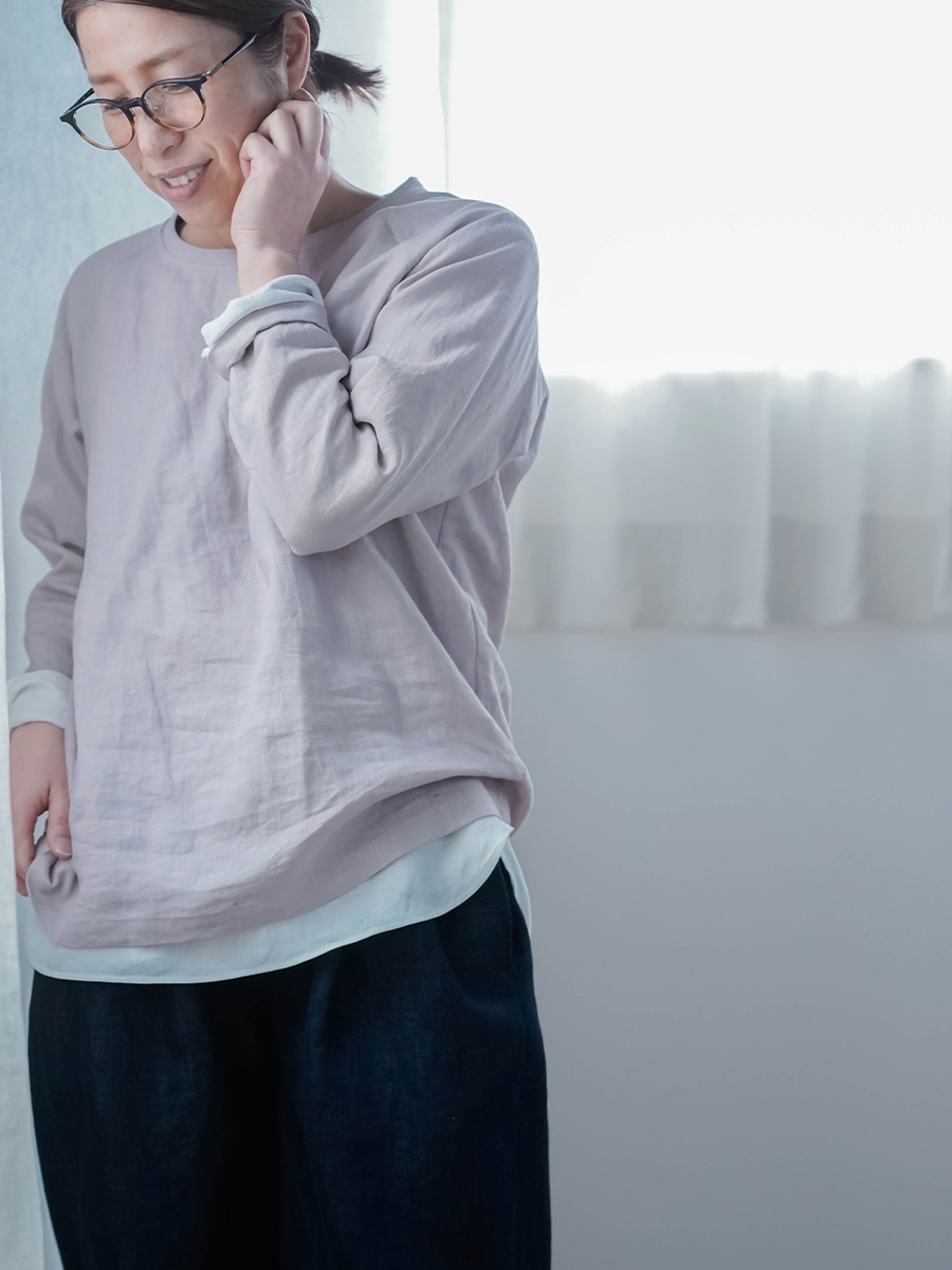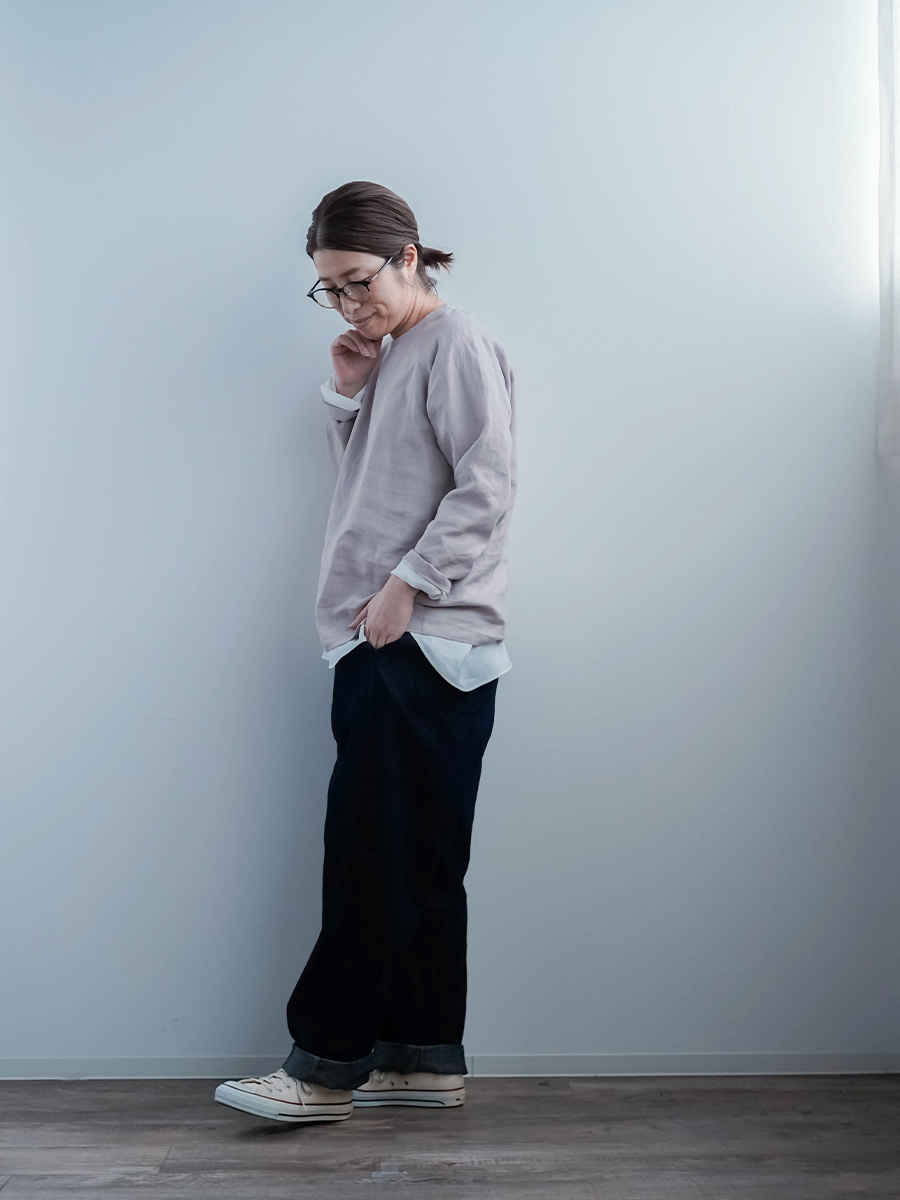 季節の変わり目は気が付けば毎日着ているプレミアムリネン。暑すぎず寒すぎずの体と心が不安になる事はありません。自分の体温で暖められた空気の層ができる感じ、守られてる感じ。これ、ほんとにやみつきになります。そしてこの子はただ快適なだけじゃない。コーデのアクセントとして効かせるのはもちろん、裾をウエストにインしてもモコモコしないところがお気に入りです。インしたいけど、着膨れしたくない問題を解決してくれます。着丈はお尻が隠れます、袖丈は手首下。