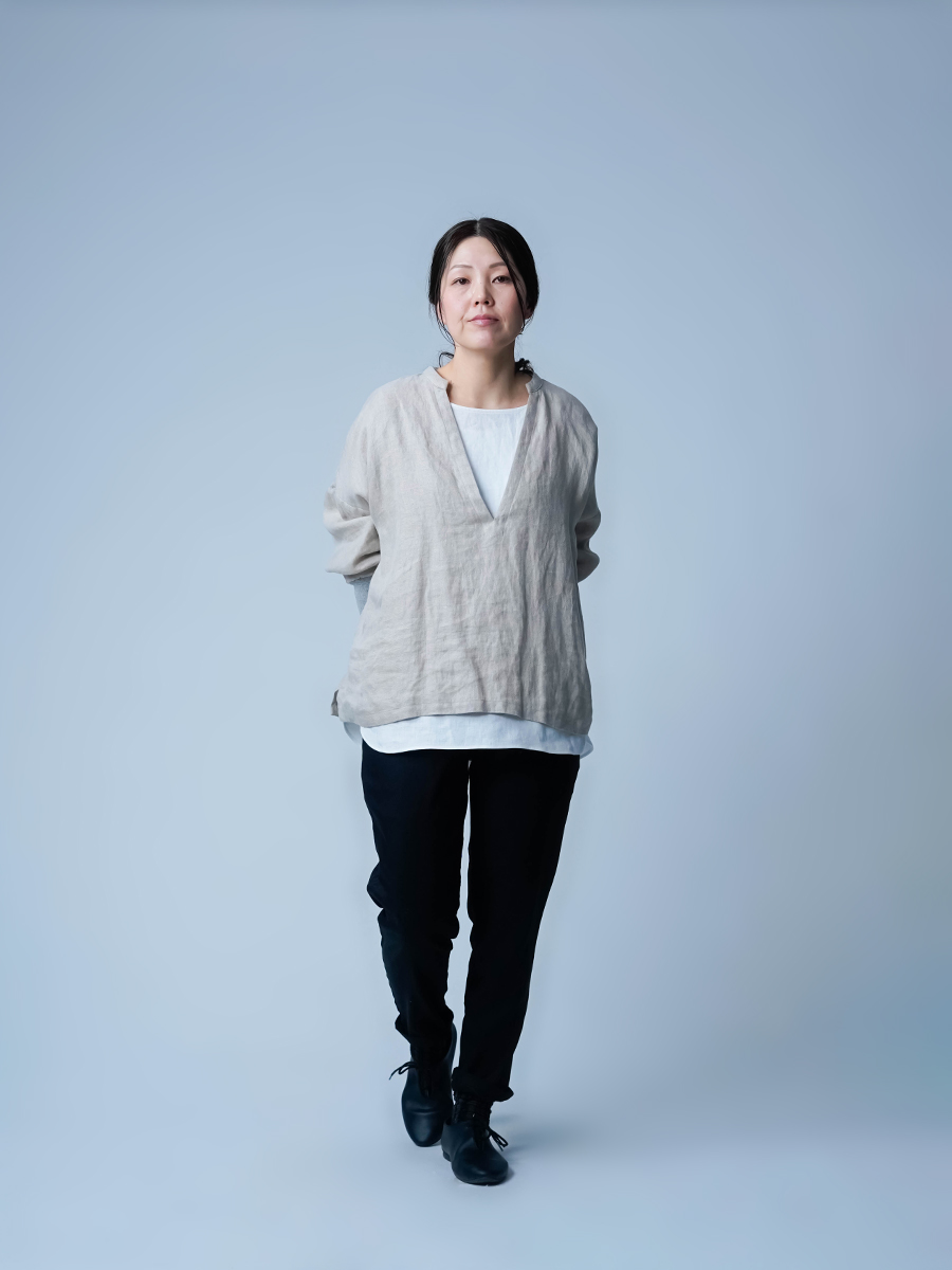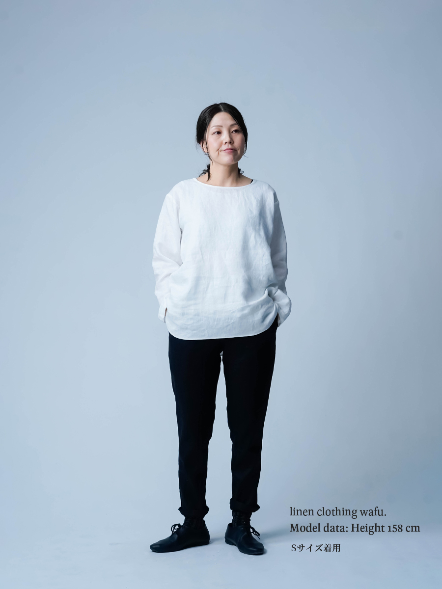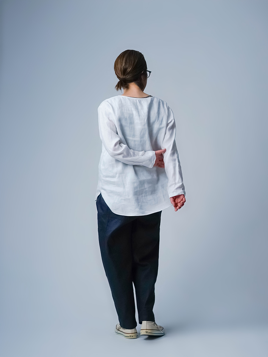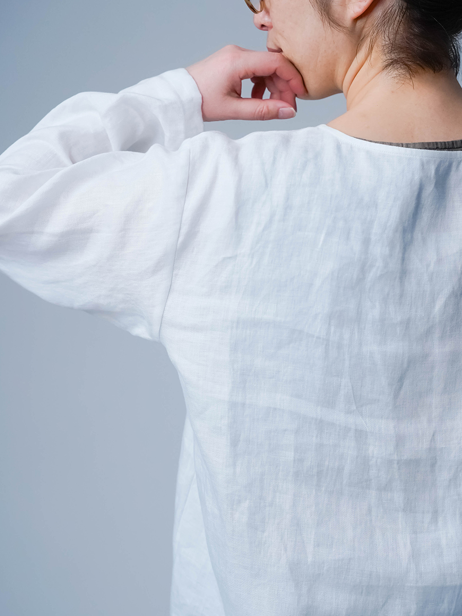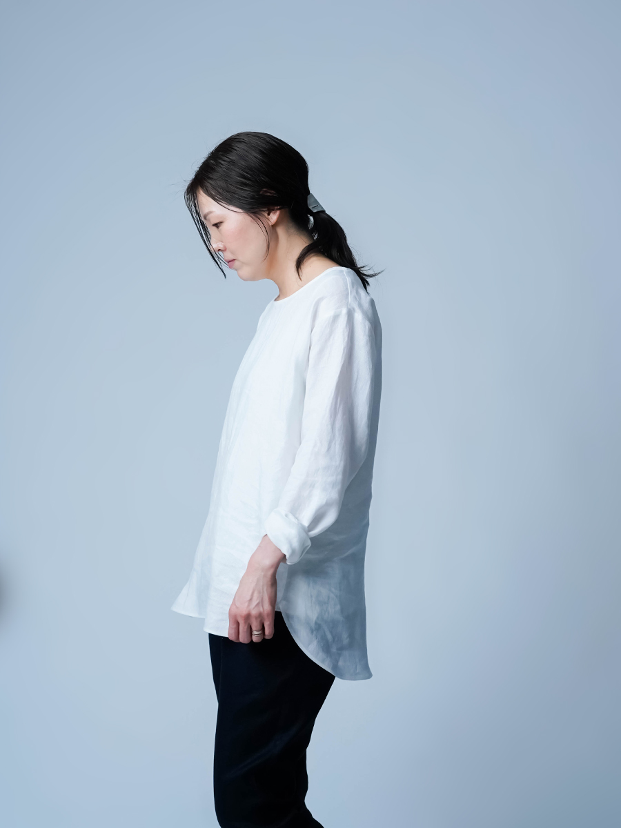 Sサイズちょうどいいです。着るだけで全体の印象がすっと整う、頼もしい一枚だと思います。裾のラウンドが身体のラインに沿ってきれいに落ち、後ろ姿まできちんと見せてくれます。襟元は鎖骨の少し下あたりで開きすぎず、一枚でも着やすいデザイン。やわらかなプレミアムリネンの肌触りが気持ちがいいです。袖丈は手の甲が隠れるくらいで、着丈はおしりがしっかり隠れる長さです