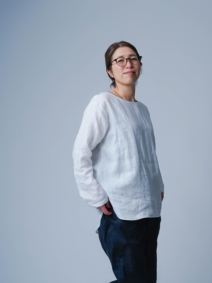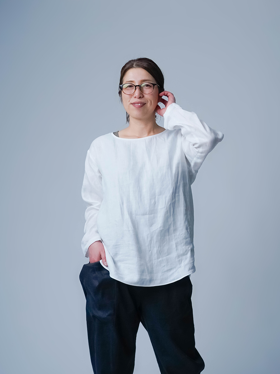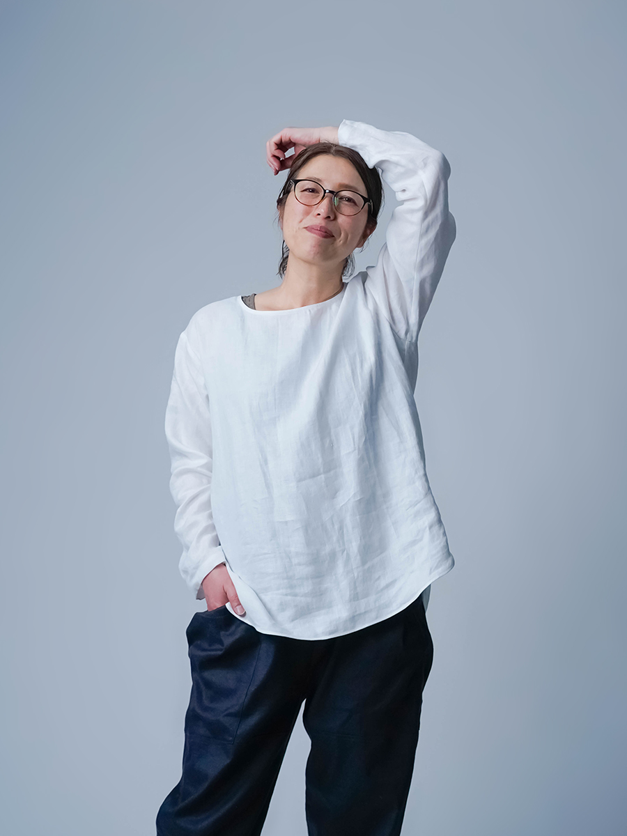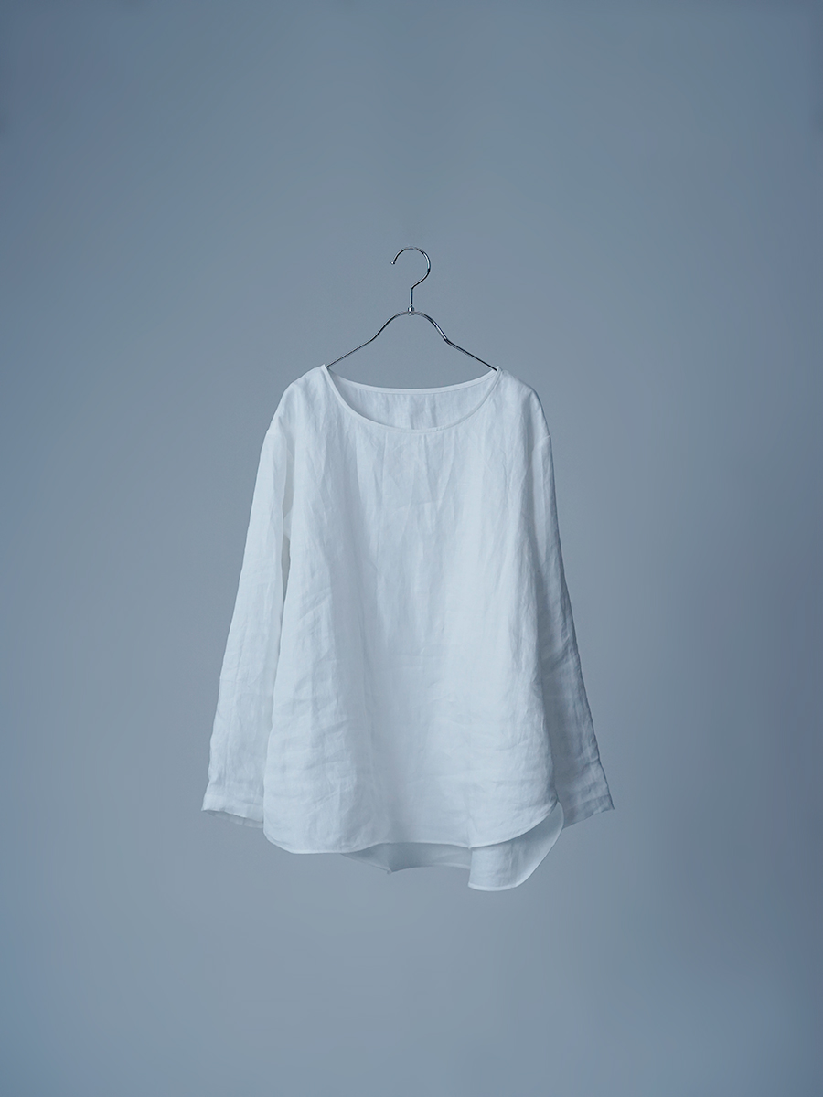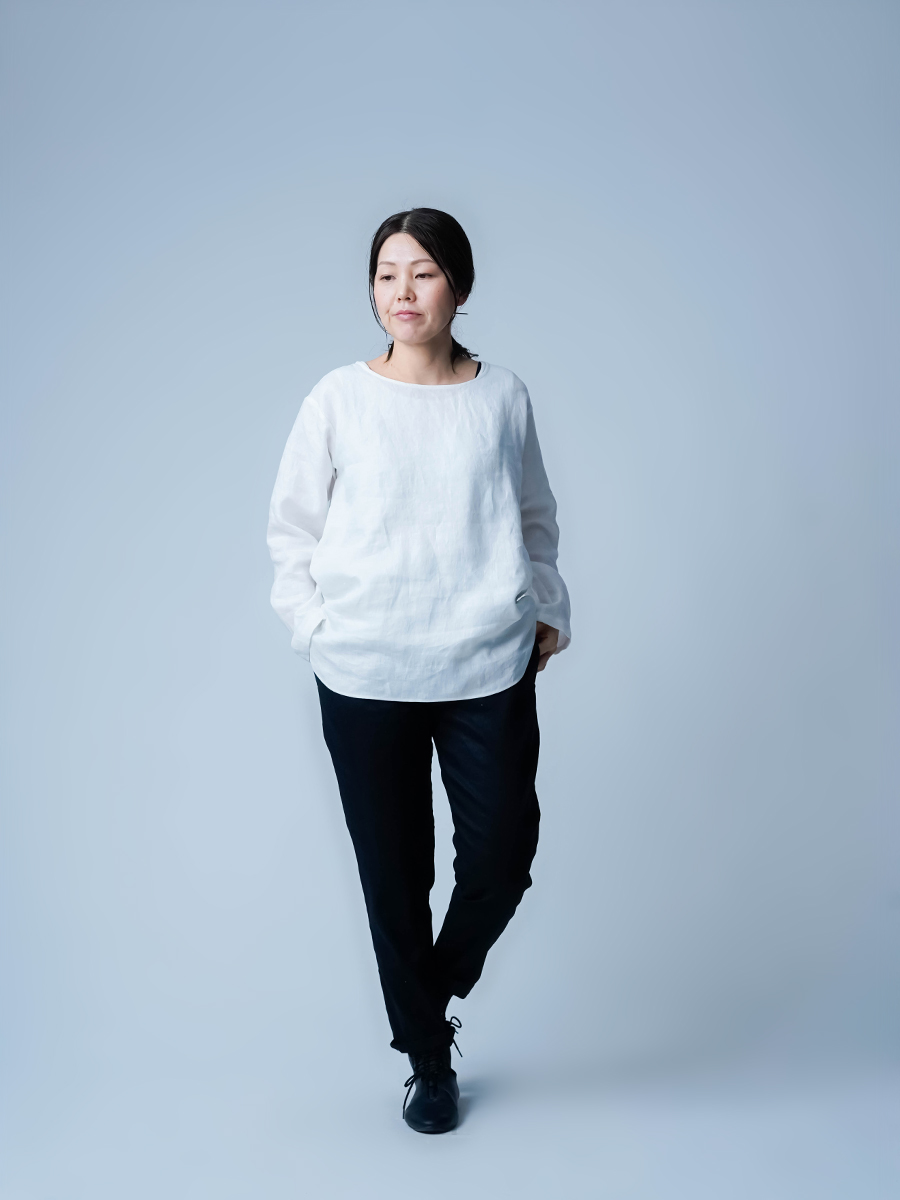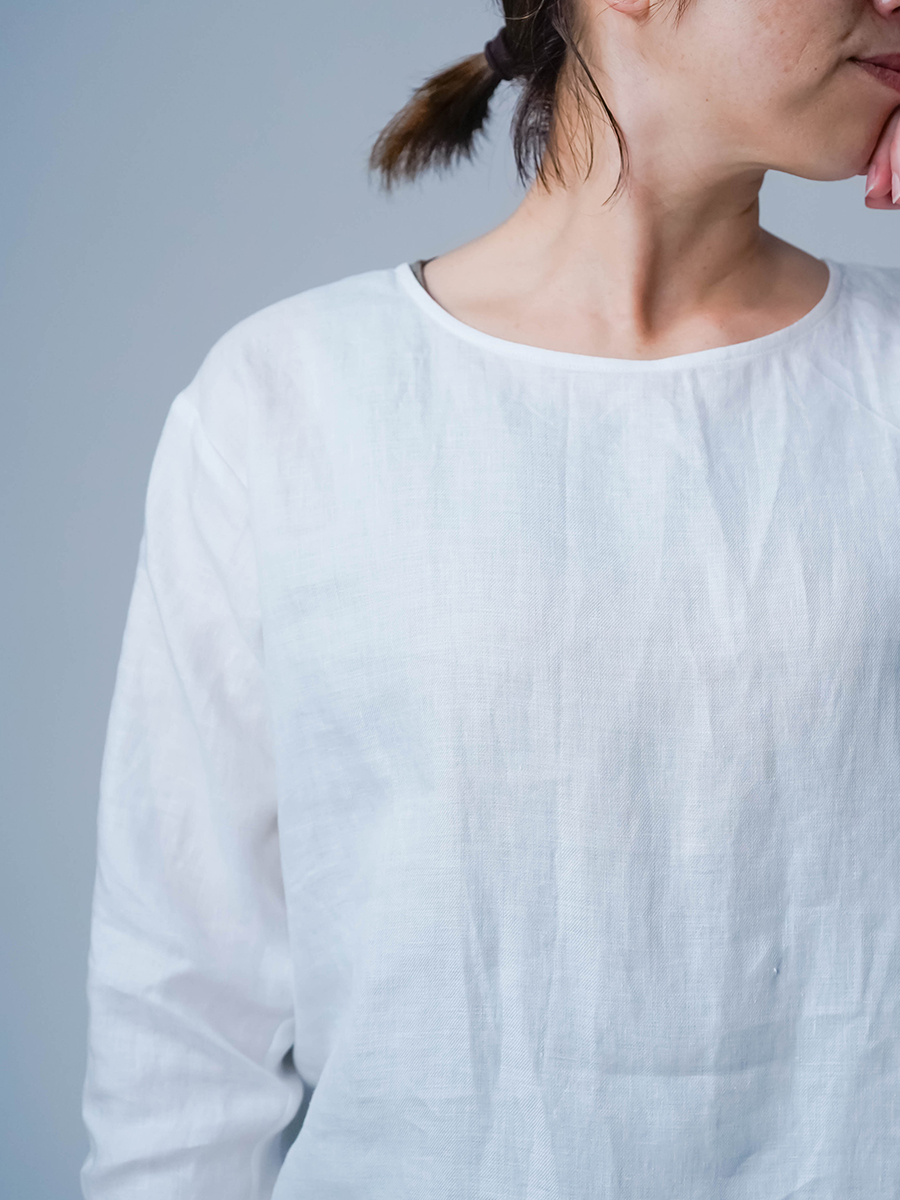 Sサイズちょうどいいです。着るだけで全体の印象がすっと整う、頼もしい一枚だと思います。裾のラウンドが身体のラインに沿ってきれいに落ち、後ろ姿まできちんと見せてくれます。襟元は鎖骨の少し下あたりで開きすぎず、一枚でも着やすいデザイン。やわらかなプレミアムリネンの肌触りが気持ちがいいです。袖丈は手の甲が隠れるくらいで、着丈はおしりがしっかり隠れる長さです