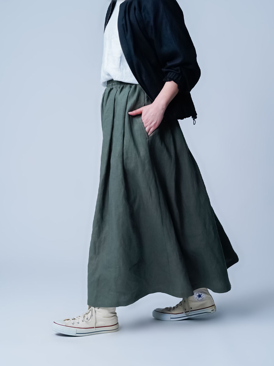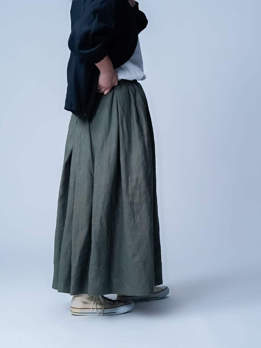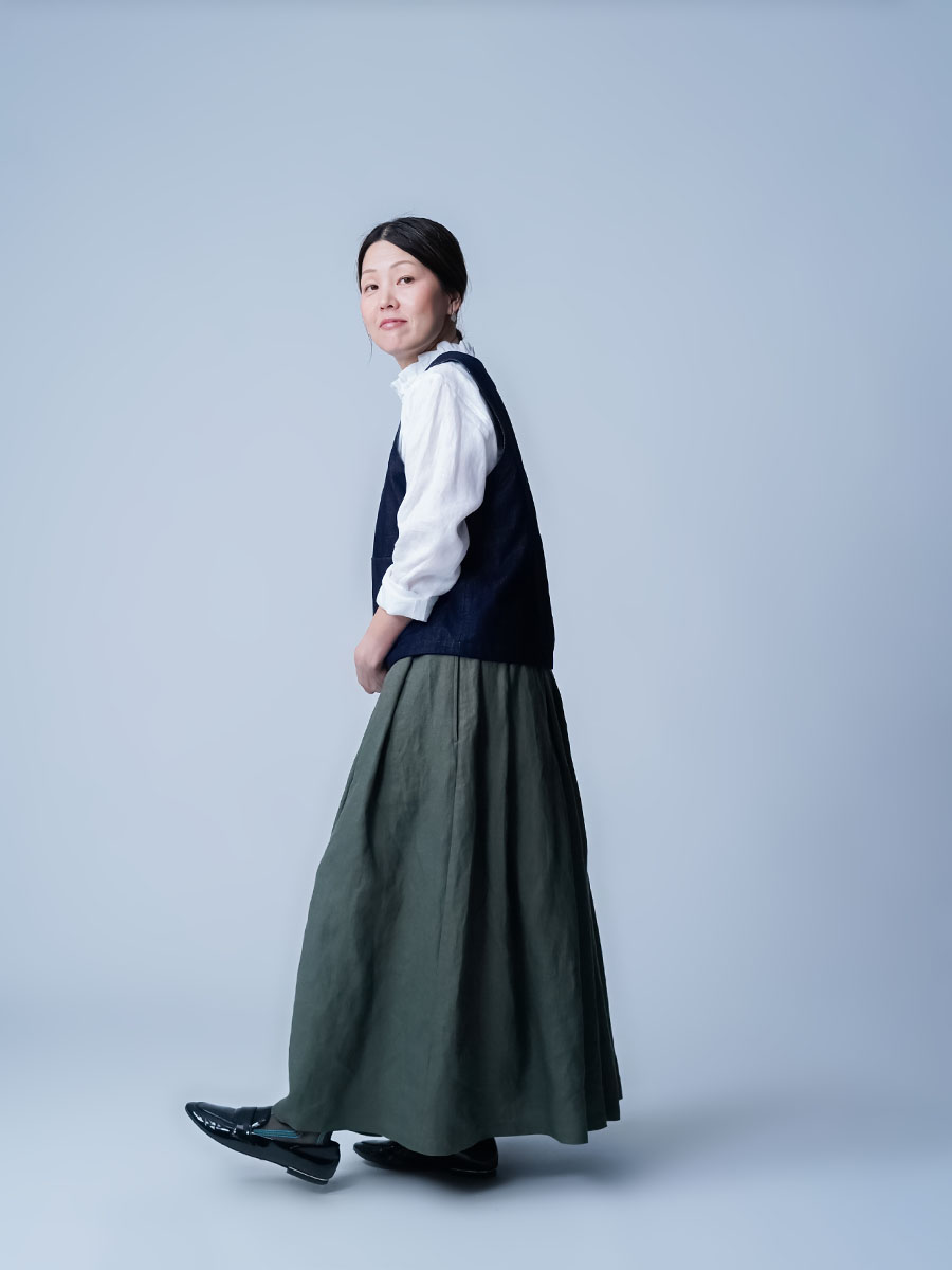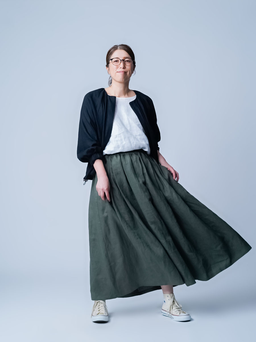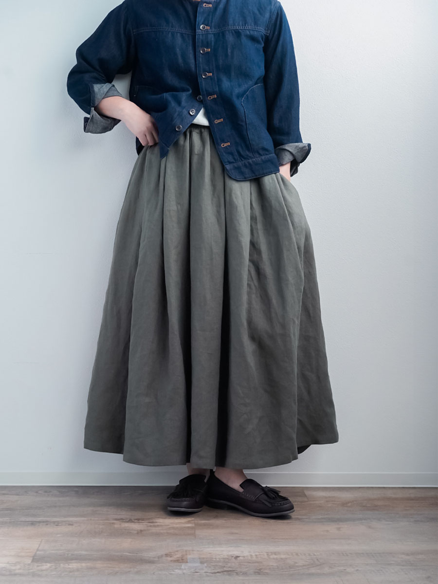 タックの深さと数で生まれるボリューム感は、まさに圧巻の一言です。冬はジャケットなど、上半身にボリュームのあるものを着ることが多くなりますが、このスカートなら羽織りものに負けない存在感になります。穿くだけで全体のバランスがスッと整います。しかもふんわりと広がるのに重たく見えないところがポイント、私にとって、まさに背伸びしない理想のスカートです。着丈はくるぶしから約5cm上、ウエストはちょうどいいフィット感。
