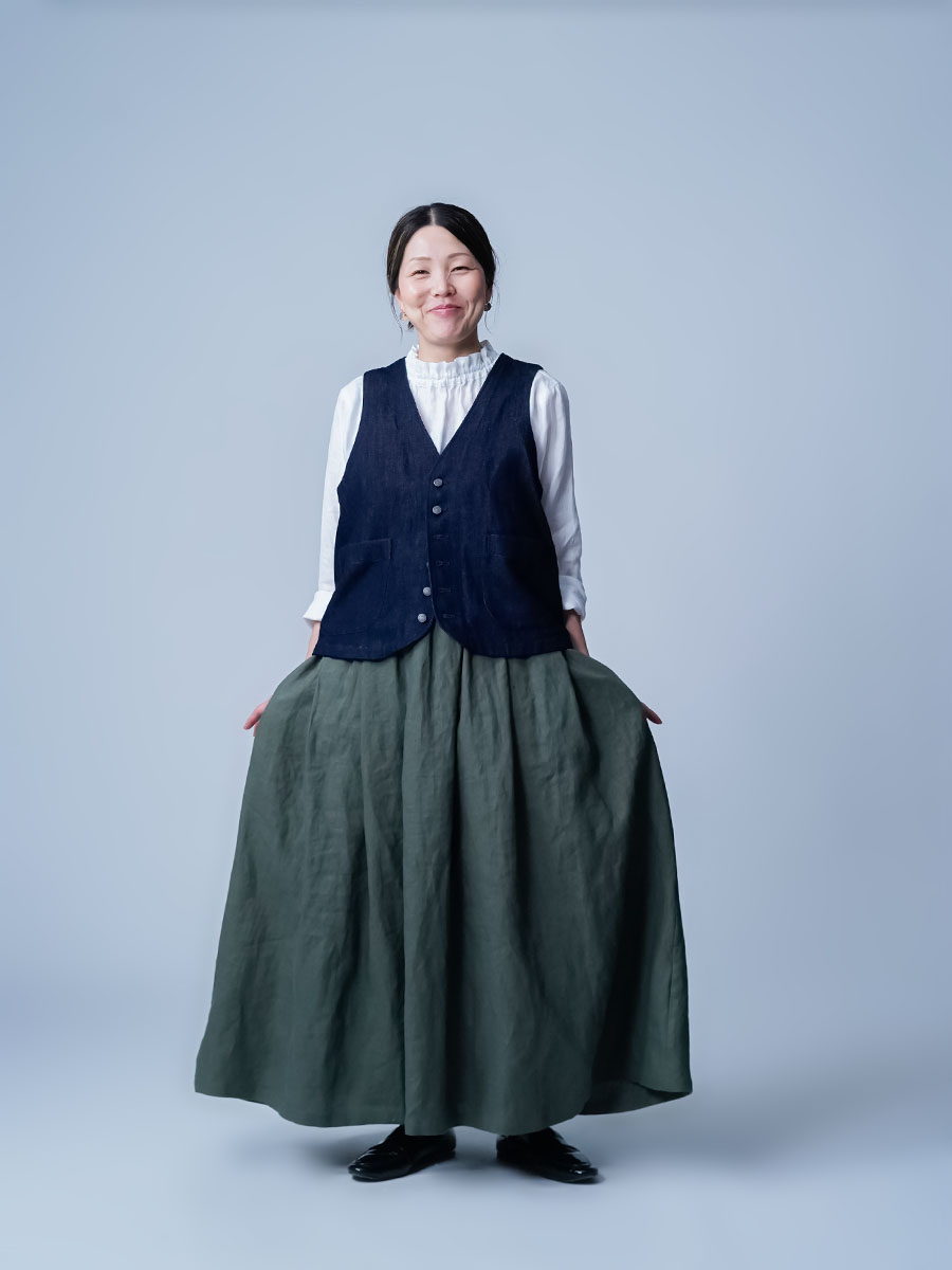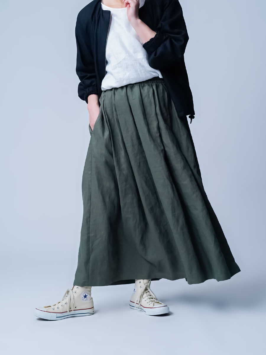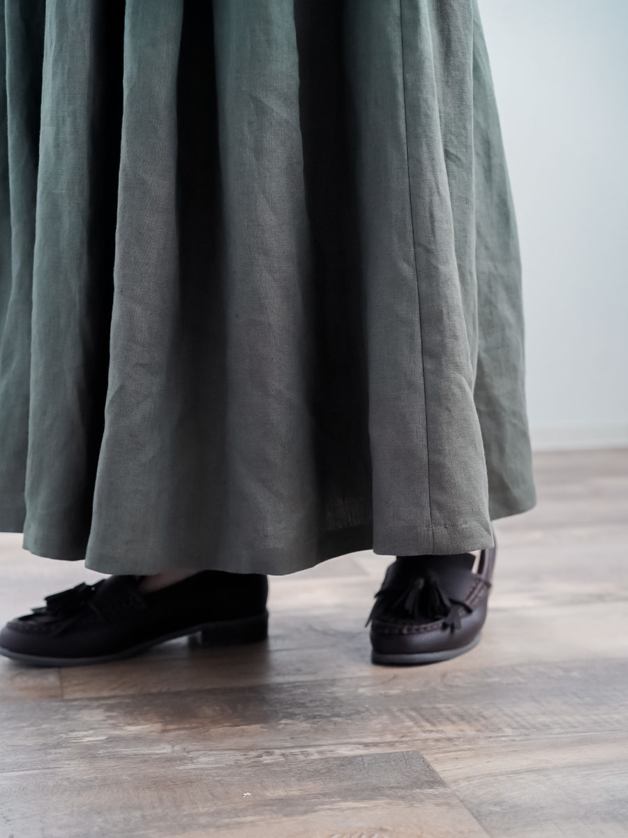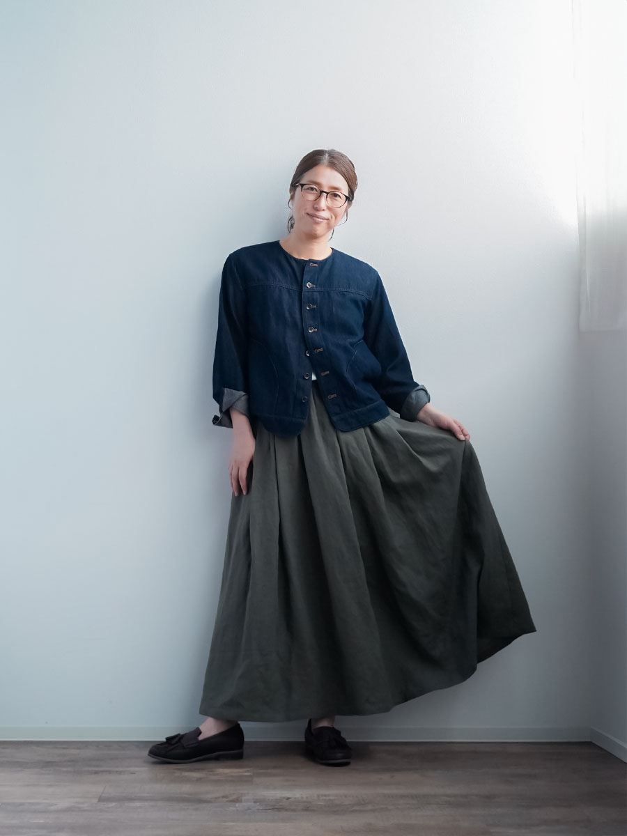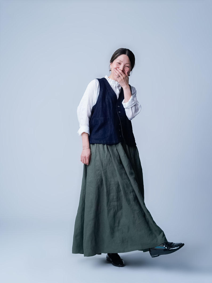 タックの深さと数で生まれるボリューム感は、まさに圧巻の一言です。冬はジャケットなど、上半身にボリュームのあるものを着ることが多くなりますが、このスカートなら羽織りものに負けない存在感になります。穿くだけで全体のバランスがスッと整います。しかもふんわりと広がるのに重たく見えないところがポイント、私にとって、まさに背伸びしない理想のスカートです。着丈はくるぶしから約5cm上、ウエストはちょうどいいフィット感。