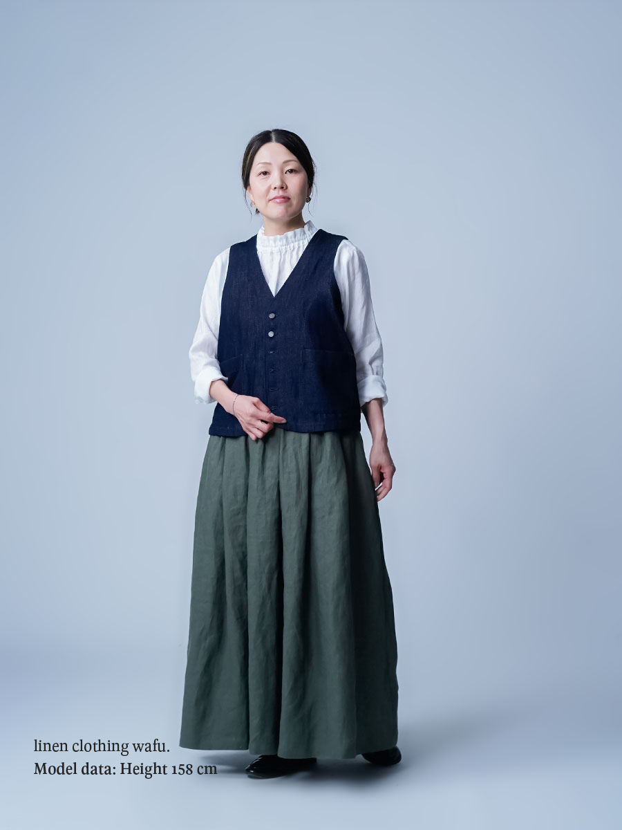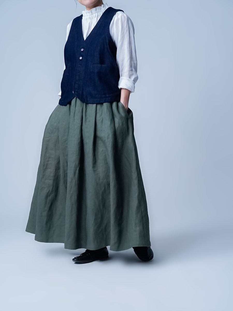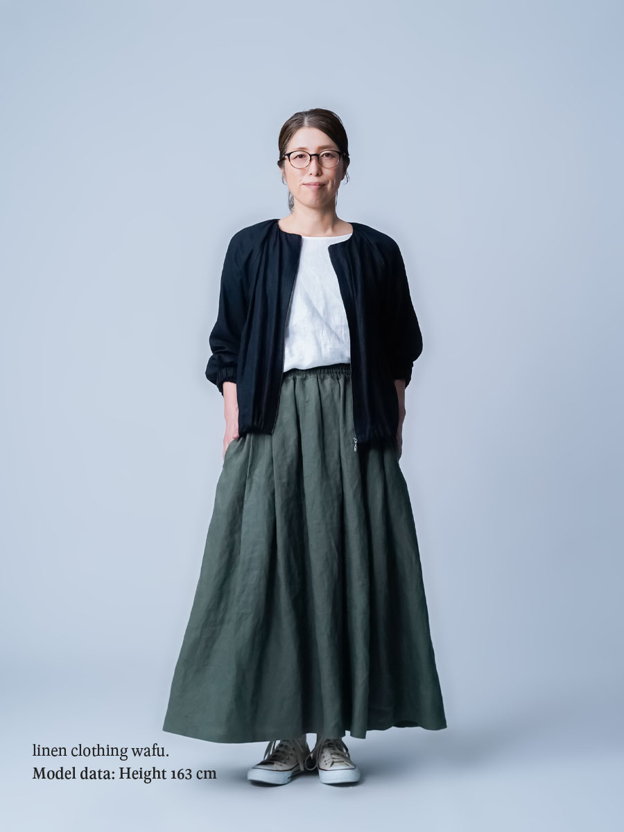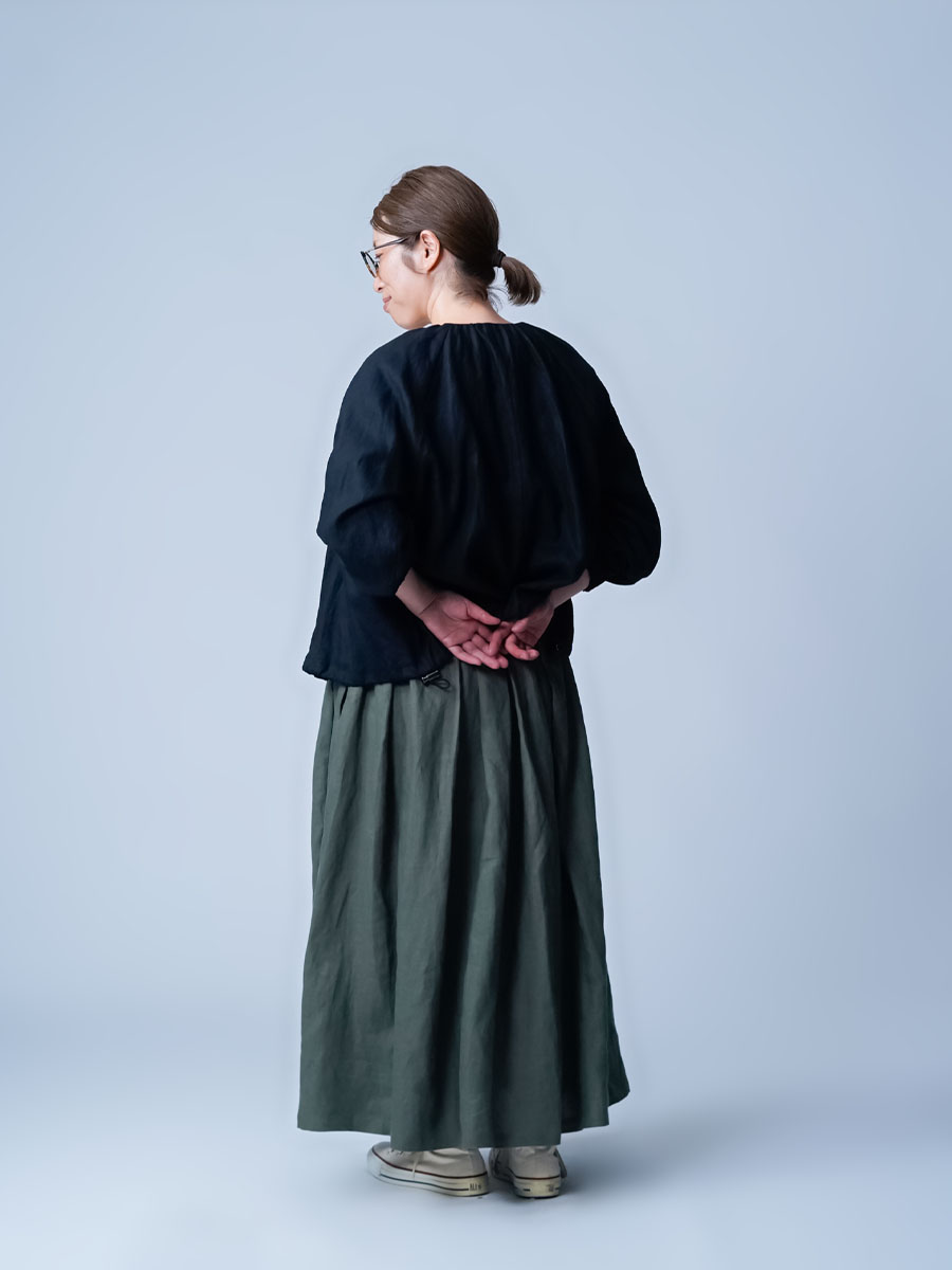 - ※生地工場の生産時期によって色味の濃淡が出ることがございます。セットアップでの着用の場合はご相談下さい。カラーリネンは最初色落ちや生地の性質上、毛羽落ちがある場合がございます。落ち着くまで数回は単品でのお洗濯を。最初は水通しをおすすめします。表面の毛羽立ちがとれて、肌への刺激が極端に少なくなります。リネン特有のネップ、節がございます。