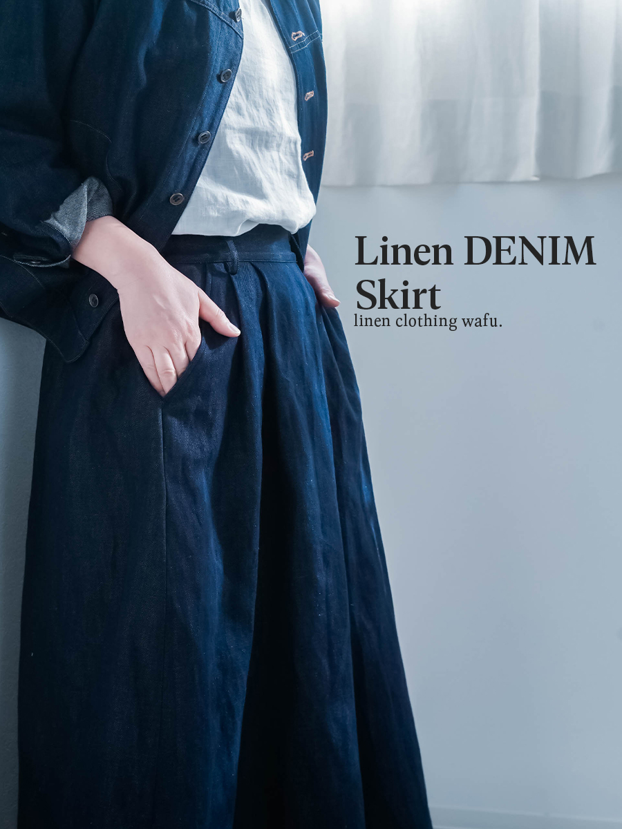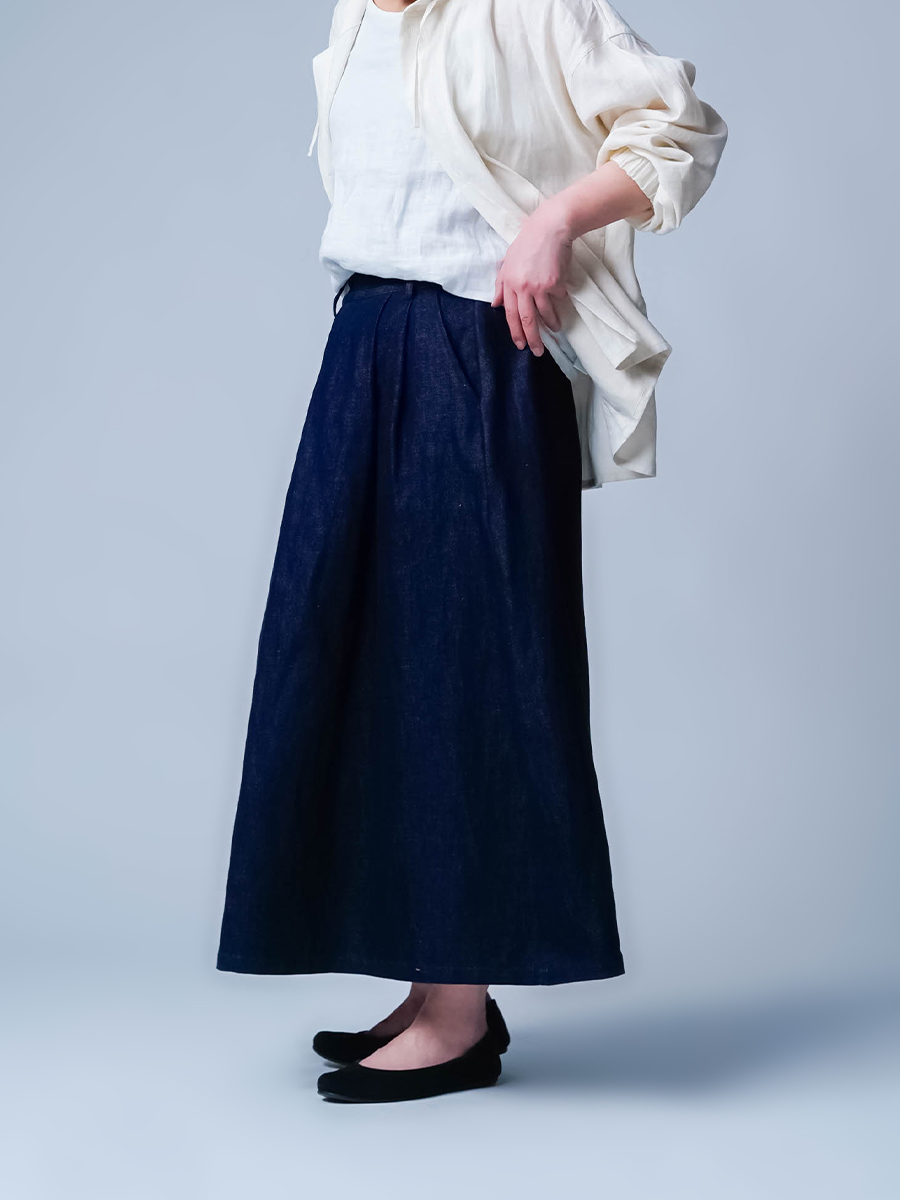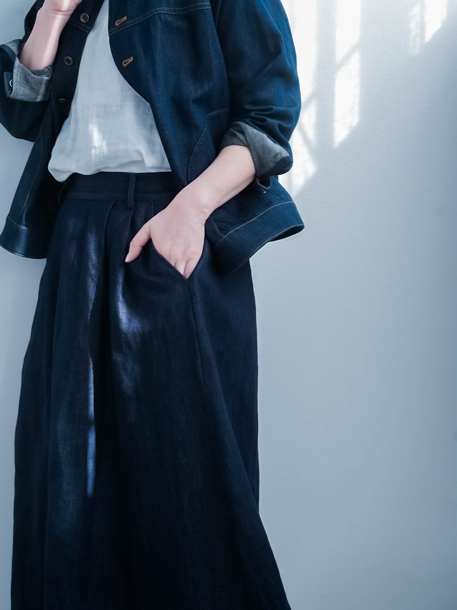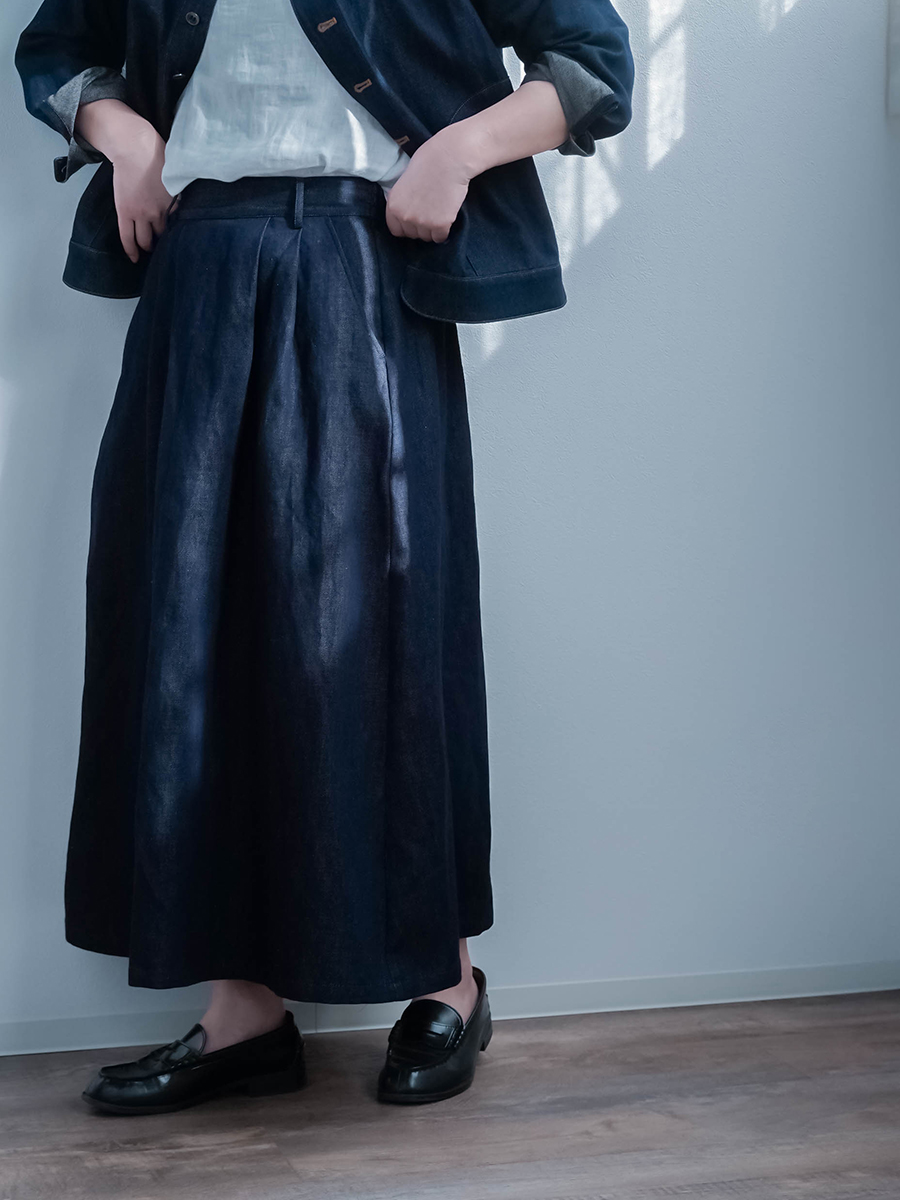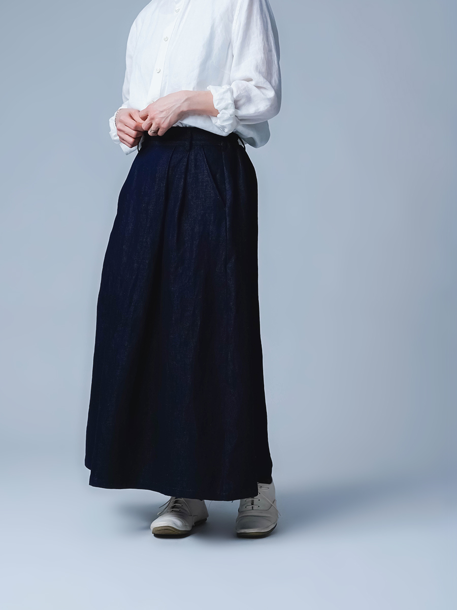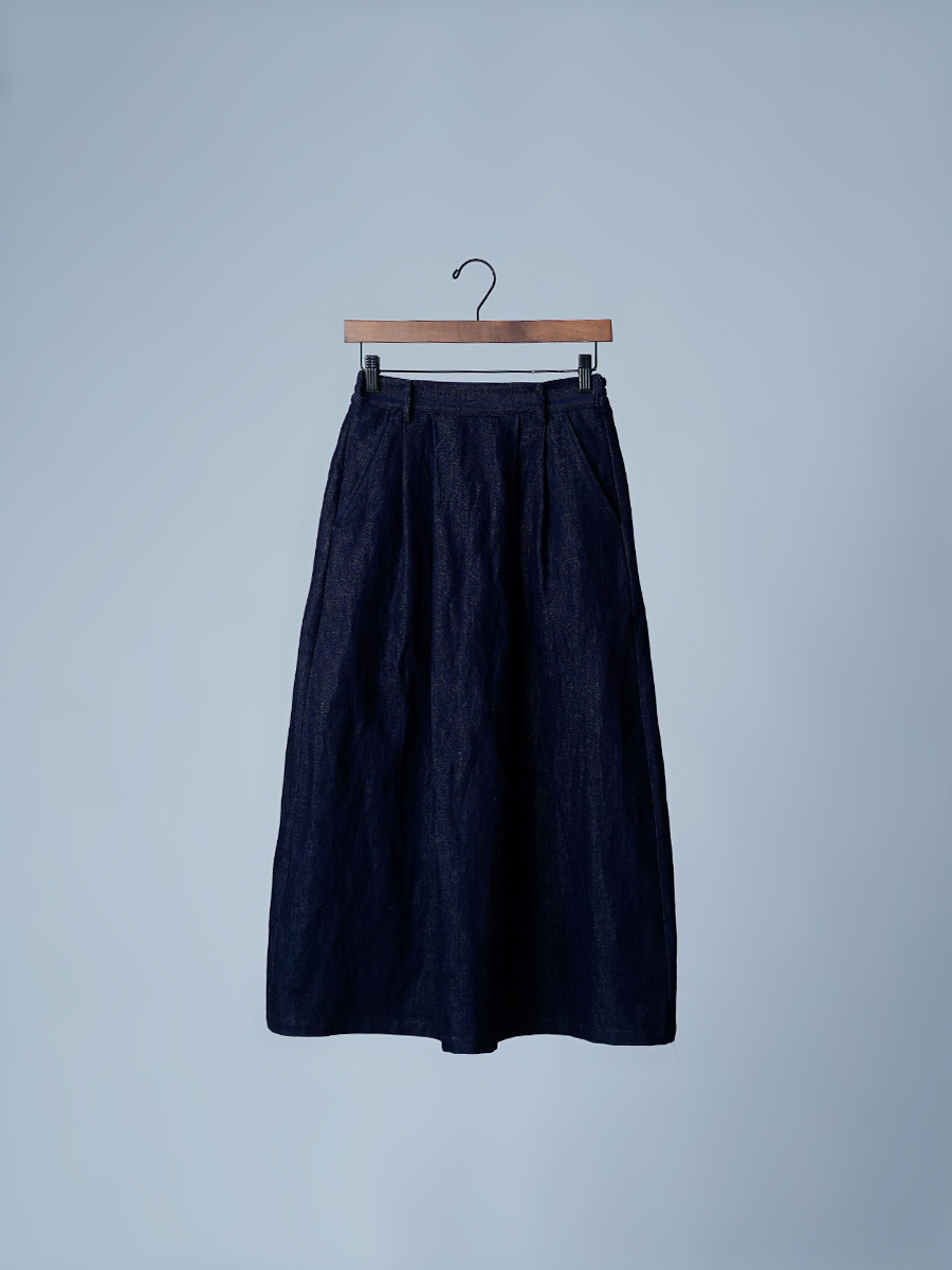 Aラインのシルエットがとてもきれいなデニムスカート。深いタックによって生み出される美しいドレープ。そのドレープによってスタイルアップ効果につながる不思議なスカート。リネンデニムは本当に着心地軽くストレスフリーですので夏でも重宝しますよ!