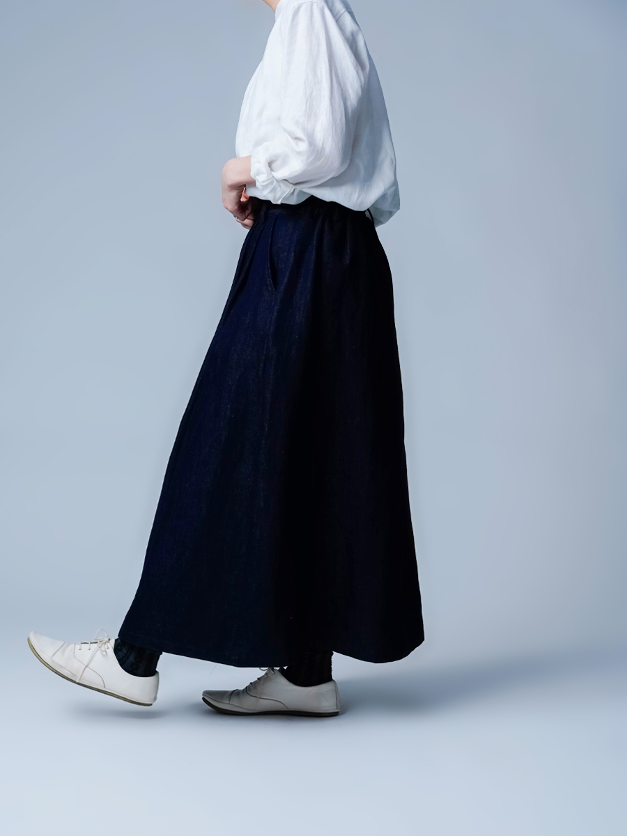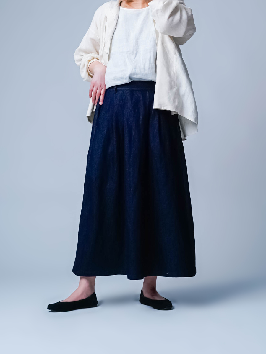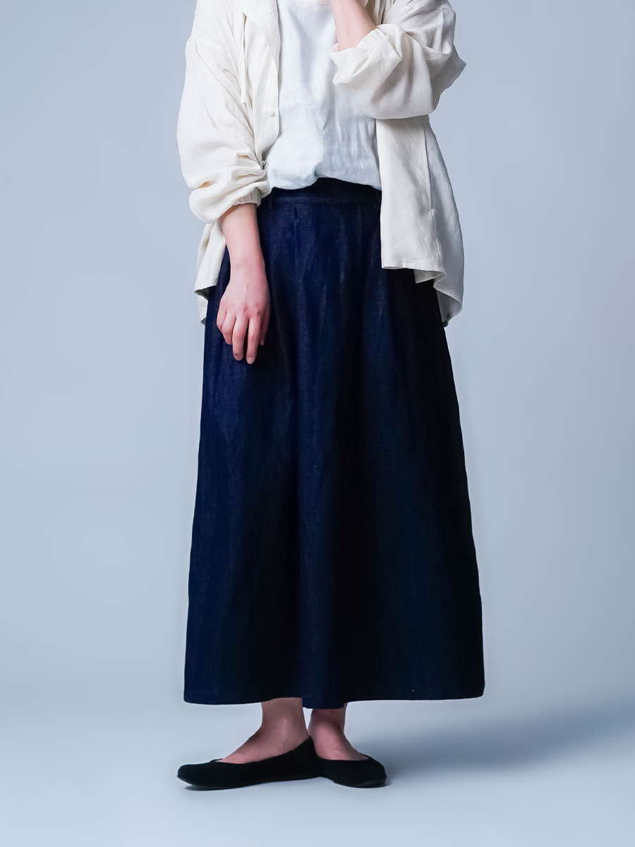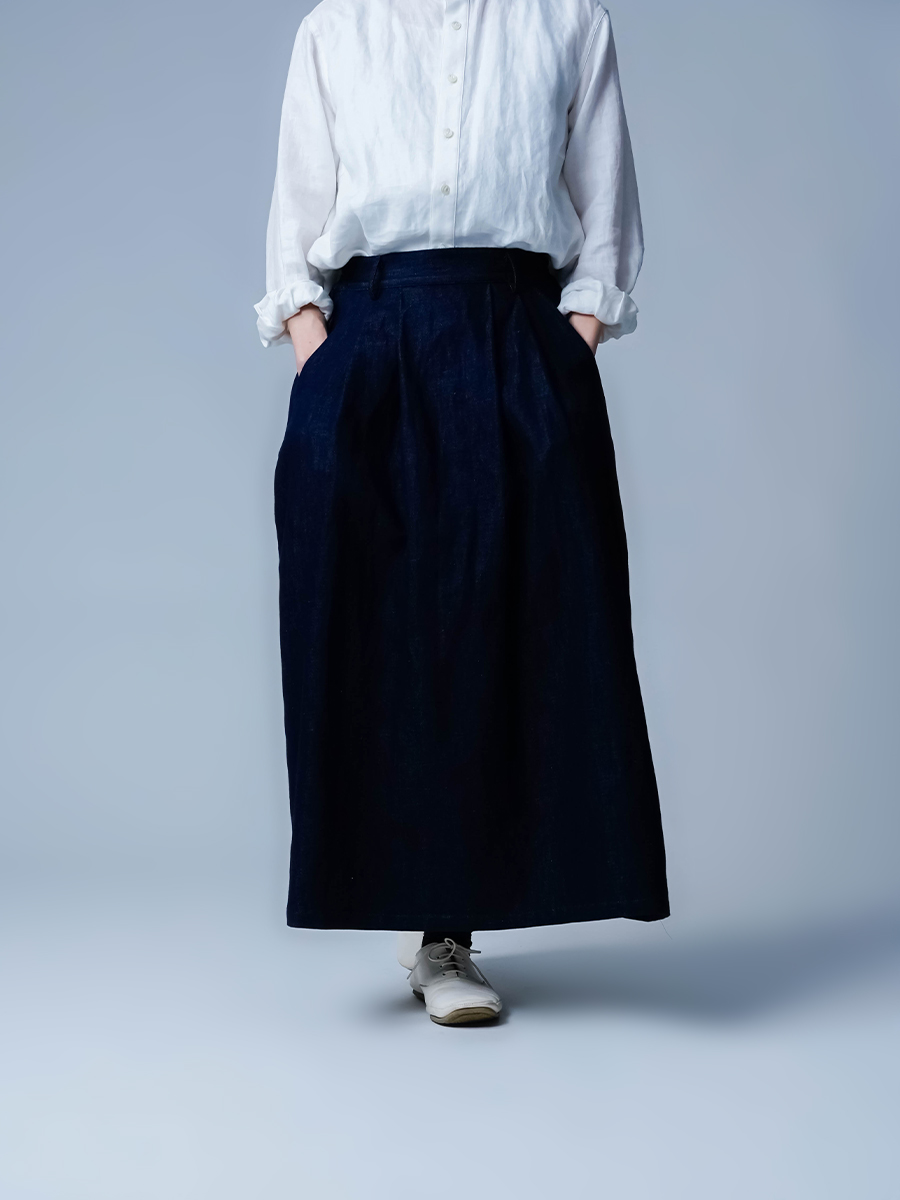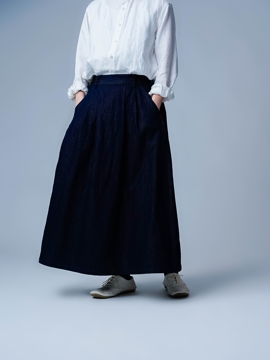 Aラインのシルエットがとてもきれいなデニムスカート。深いタックによって生み出される美しいドレープ。そのドレープによってスタイルアップ効果につながる不思議なスカート。リネンデニムは本当に着心地軽くストレスフリーですので夏でも重宝しますよ!