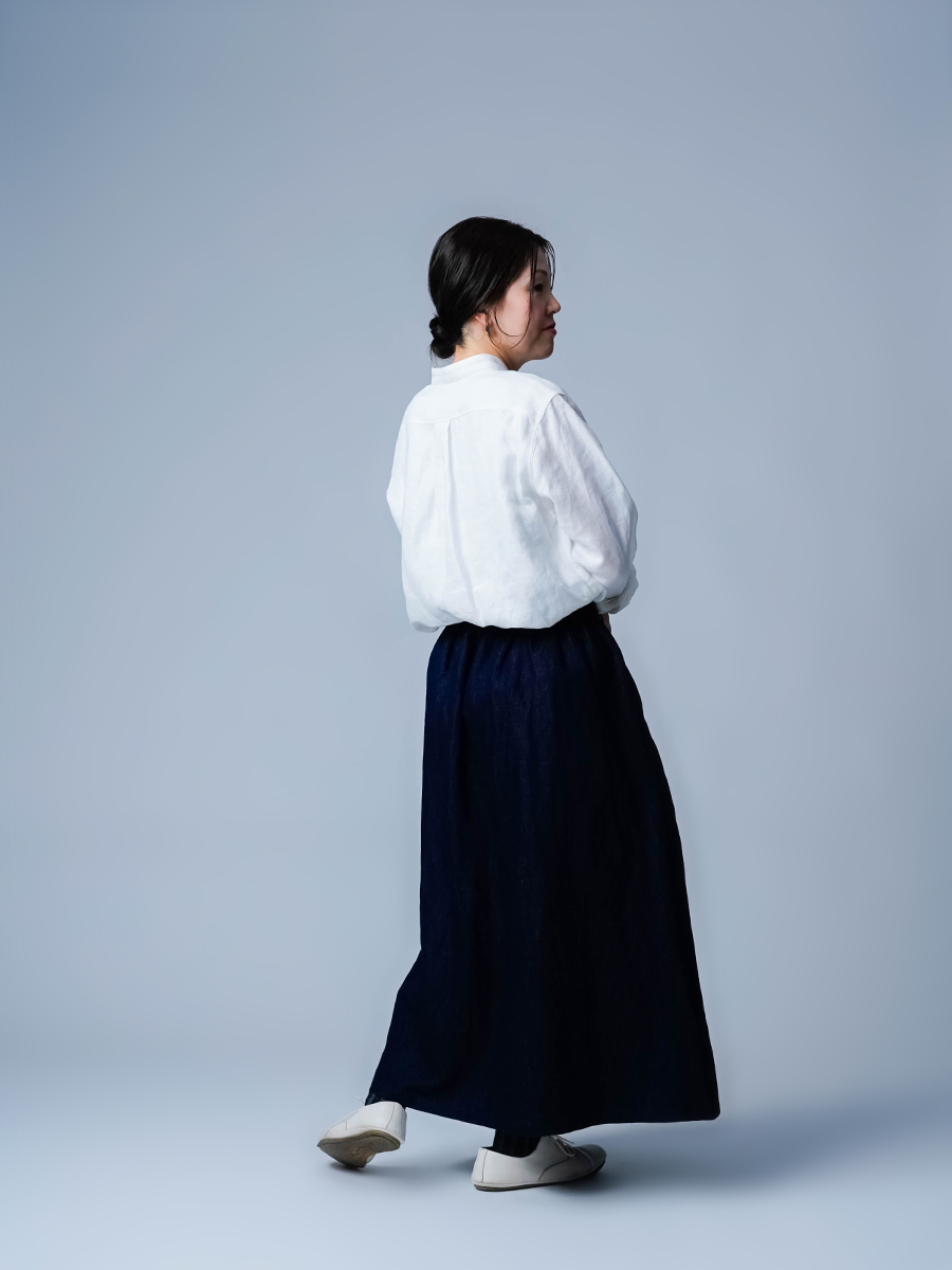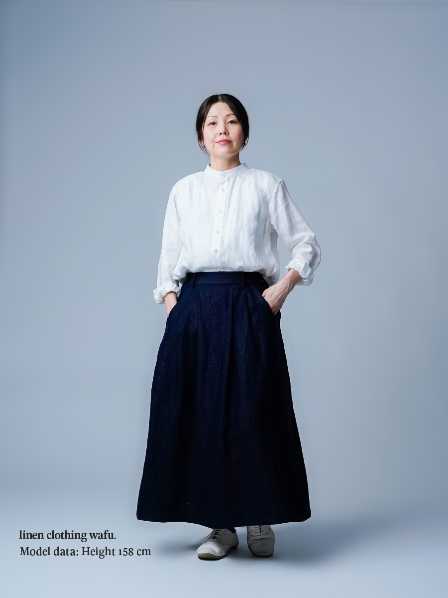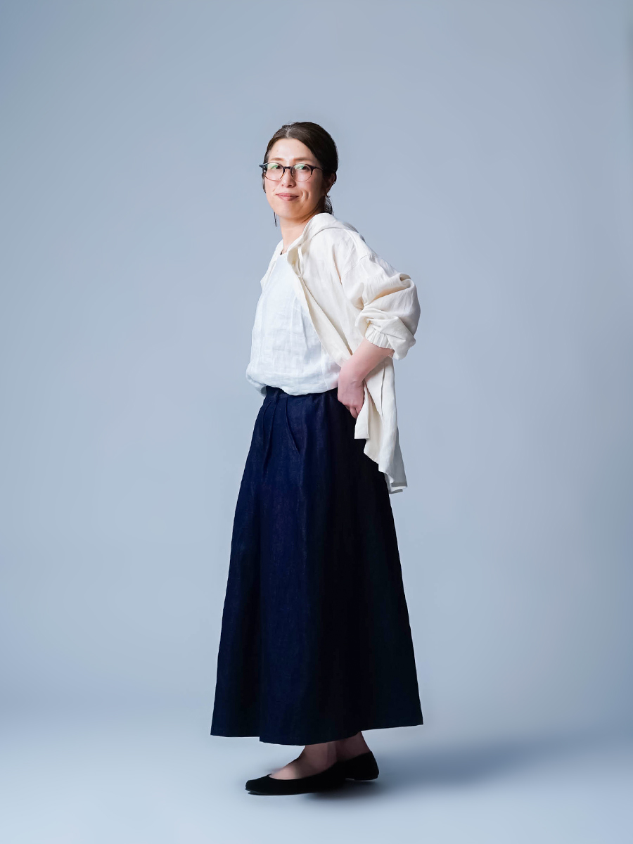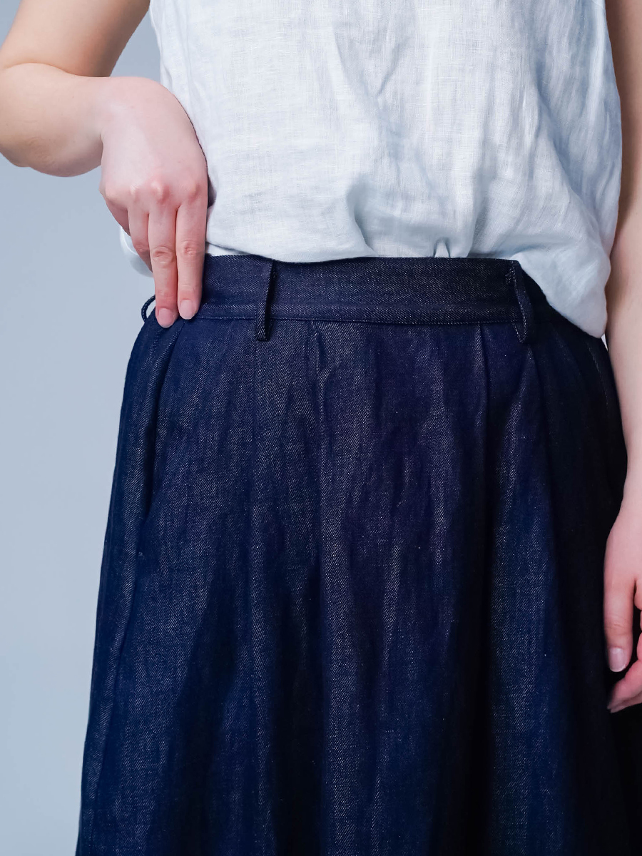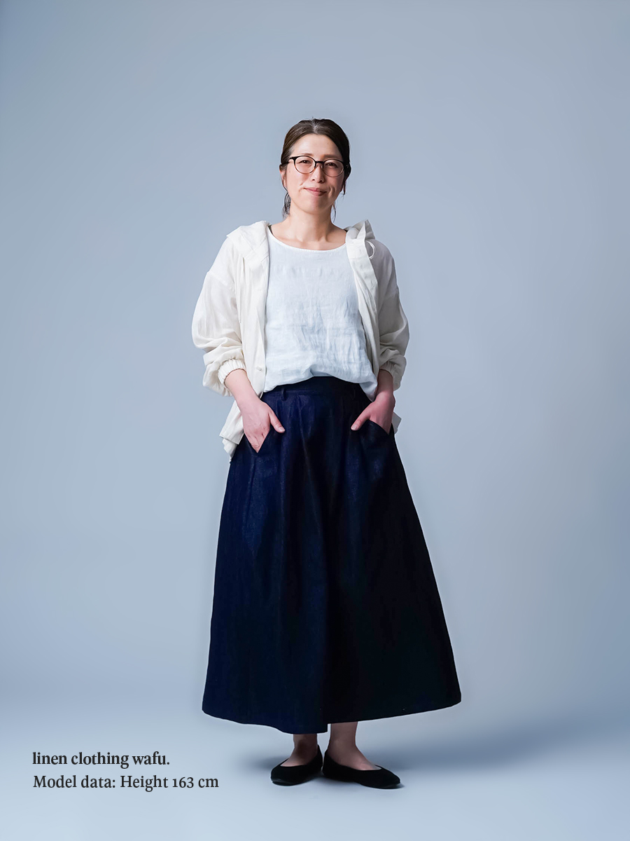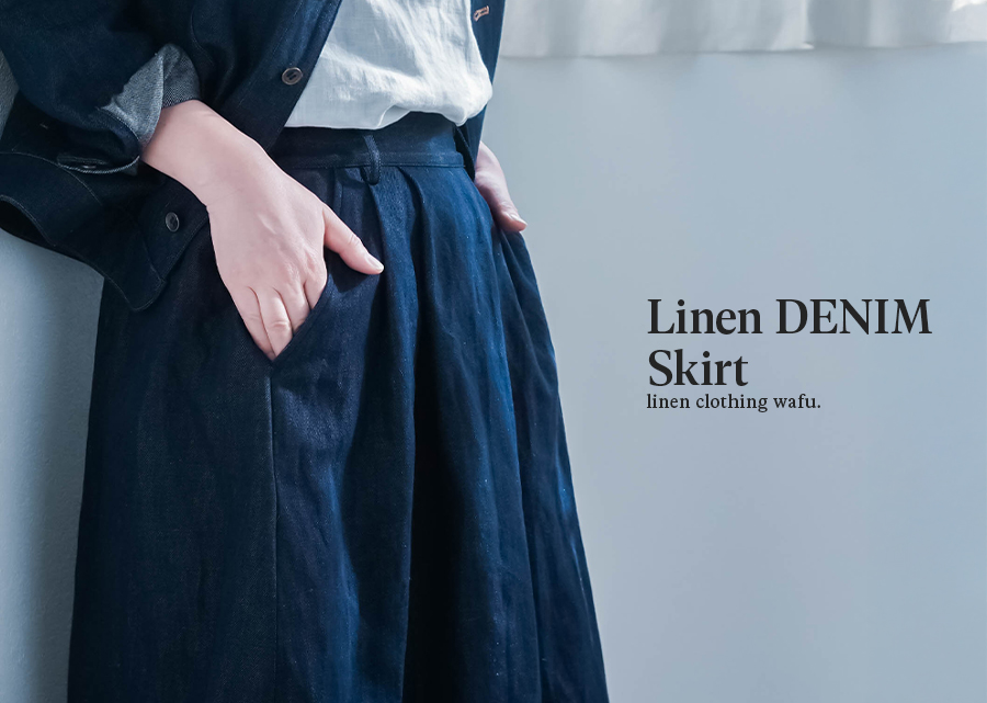 Aラインのシルエットがとてもきれいなデニムスカート。深いタックによって生み出される美しいドレープ。そのドレープによってスタイルアップ効果につながる不思議なスカート。リネンデニムは本当に着心地軽くストレスフリーですので夏でも重宝しますよ!