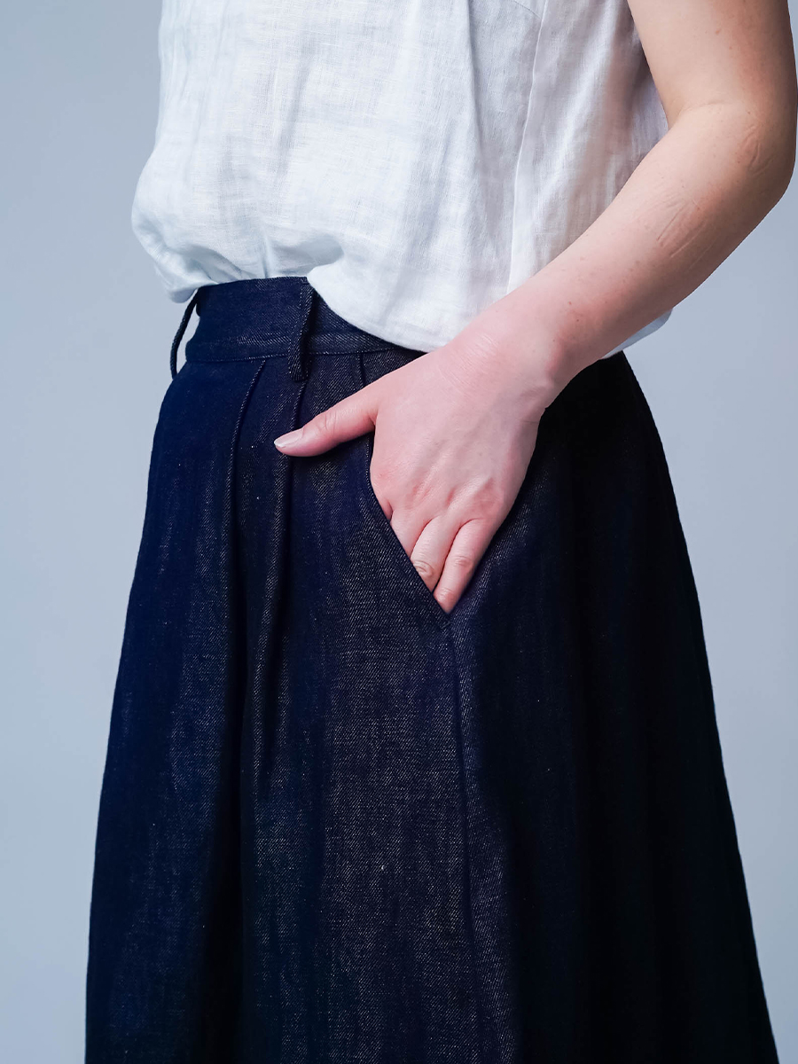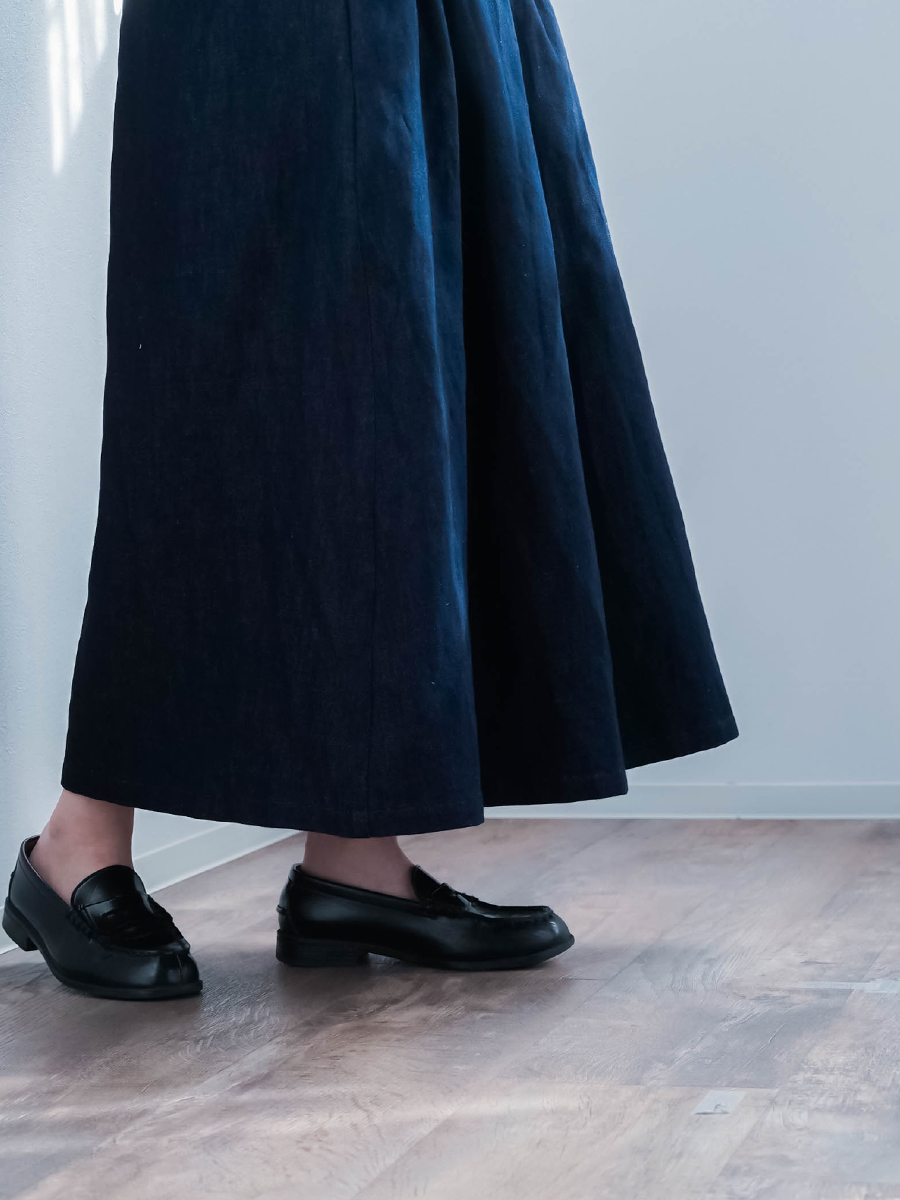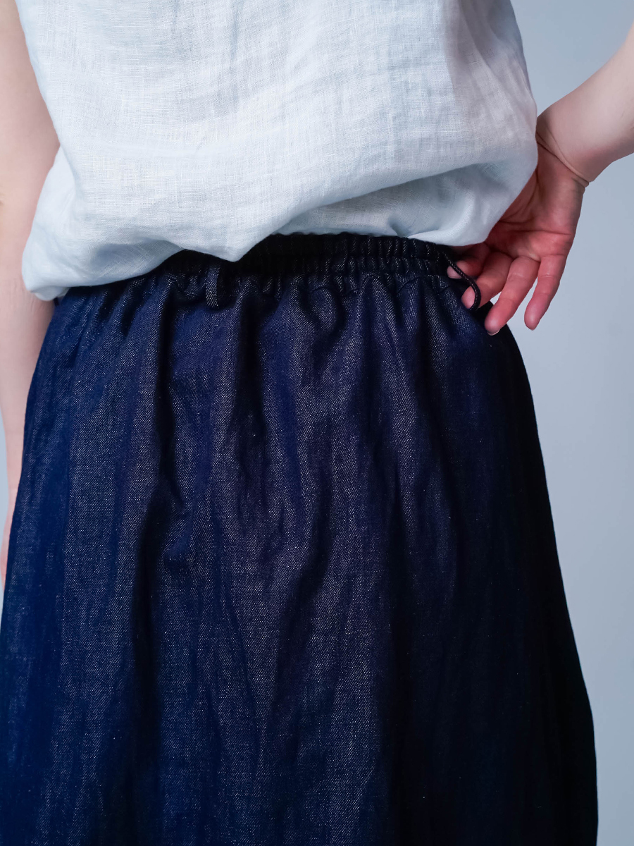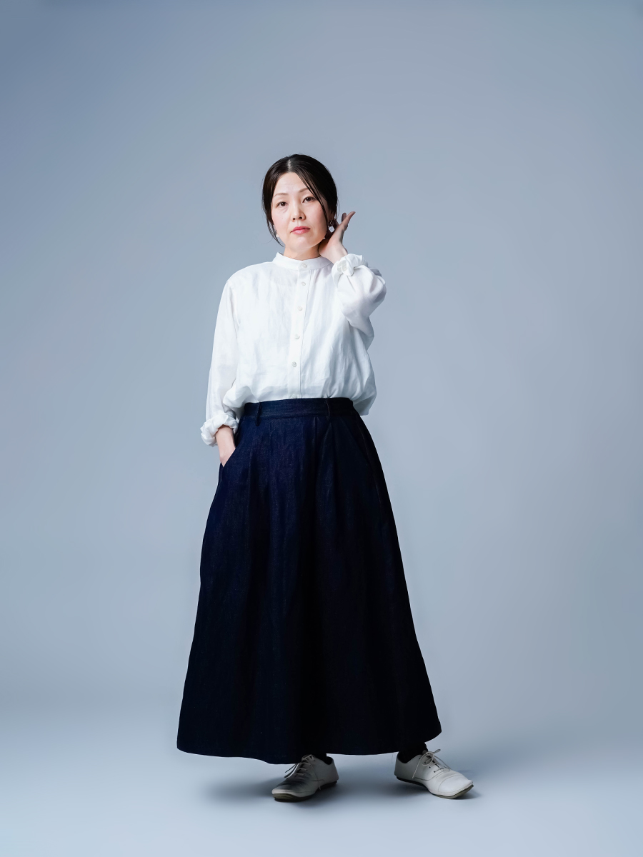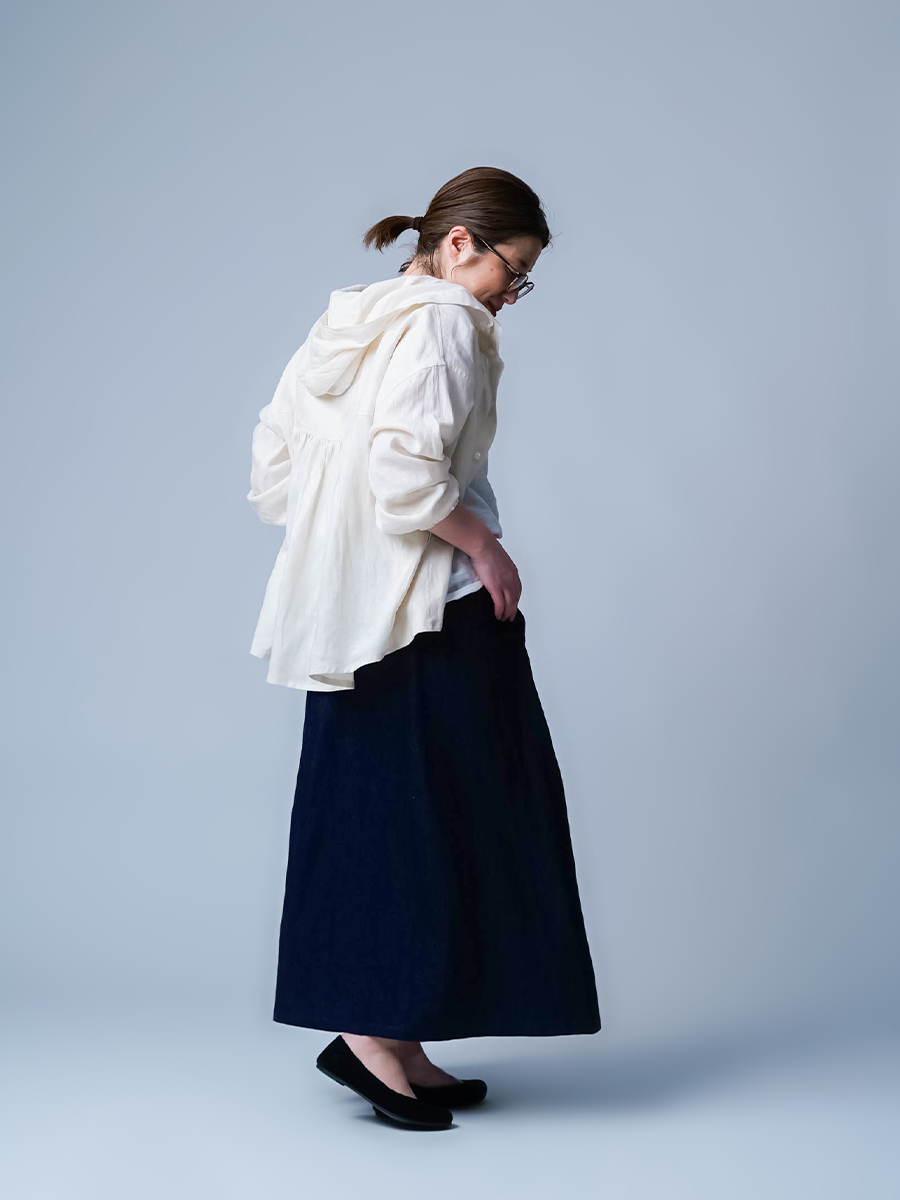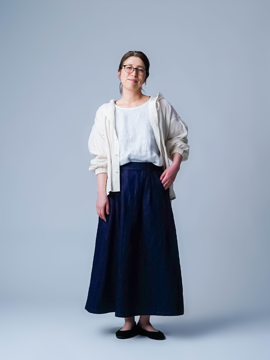 Aラインのシルエットがとてもきれいなデニムスカート。深いタックによって生み出される美しいドレープ。そのドレープによってスタイルアップ効果につながる不思議なスカート。リネンデニムは本当に着心地軽くストレスフリーですので夏でも重宝しますよ!