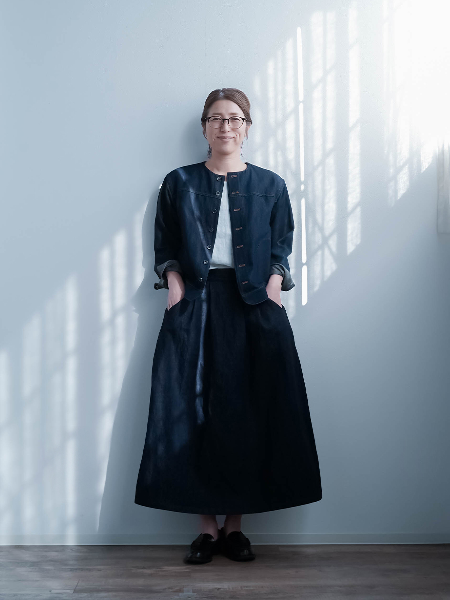 履いていることを忘れてしまいそうなくらい、ふんわりとした軽さ。たっぷりと生地を使っているのに、とても軽やかな履き心地のスカートです。丈はくるぶしの少し上くらいで、足首が見えないほどの少し長めの丈感。落ち着いた雰囲気で、大人っぽく着られます。シンプルなデザインなので、トップスを選ばず合わせやすそうです。デニムのカジュアルさがありながら、上品な印象も楽しめるスカートだと感じました。