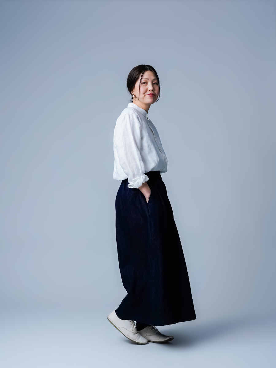 穿いた瞬間に「骨盤のハリ、どこ行った?」と思ってしまう、魔法みたいなスカートです。ポイントは、深めに入ったウエストのタック。ウエストから裾まで縦のラインがすっとできるので、足長効果までついてきます。さらにスラッシュポケットのおかげで、ウエストまわりのハリも目立ちにくく、なんだか本当にぺたんと見えるのです。これはもう、ぜひ一度体感していただきたい一本です。着丈はくるぶしから5cmほど上。