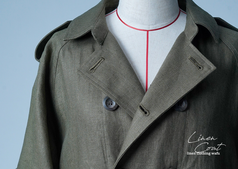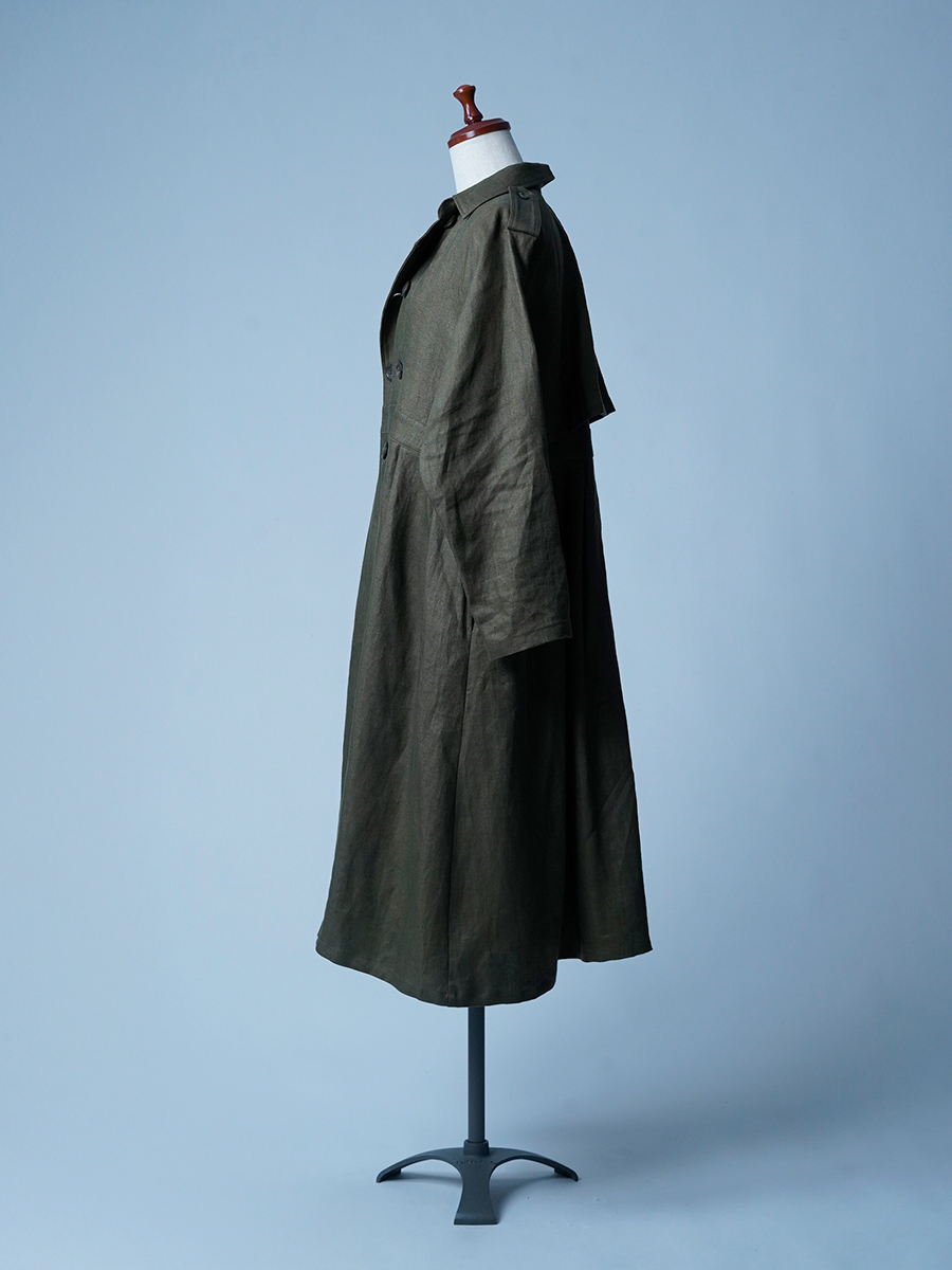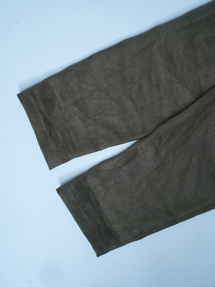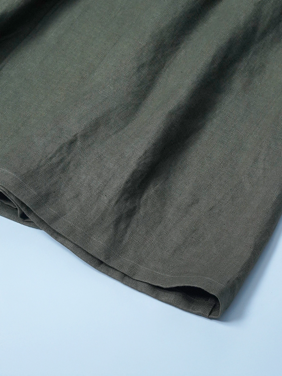 - ※生地工場の生産時期によって色味の濃淡が出ることがございます。セットアップでの着用の場合はご相談下さい。カラーリネンは最初色落ちや生地の性質上、毛羽落ちがある場合がございます。落ち着くまで数回は単品でのお洗濯を。最初は水通しをおすすめします。表面の毛羽立ちがとれて、肌への刺激が極端に少なくなります。リネン特有のネップ、節がございます。