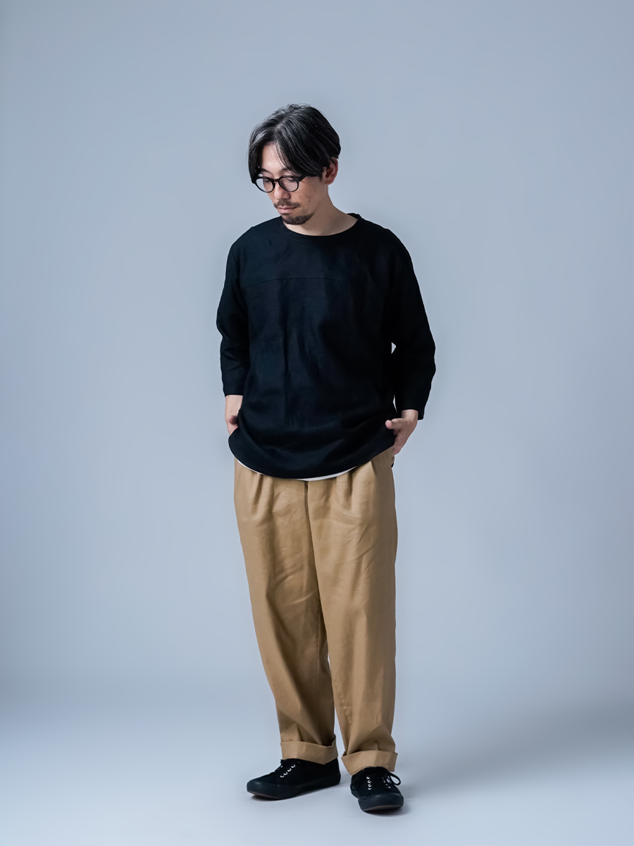 - ※生地工場の生産時期によって色味の濃淡が出ることがございます。セットアップでの着用の場合はご相談下さい。カラーリネンは最初色落ちや生地の性質上、毛羽落ちがある場合がございます。落ち着くまで数回は単品でのお洗濯を。最初は水通しをおすすめします。表面の毛羽立ちがとれて、肌への刺激が極端に少なくなります。リネン特有のネップ、節がございます。