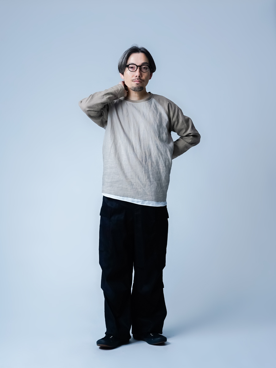 Mサイズが丁度いいサイズ感です。着丈は少しお尻にかかるくらい。袖丈は親指の付け根くらいです。身幅はゆったりとしています。インナーとして着るだけでは、もったいない。トップスとしても大活躍してくれます。程よい力のぬけ具合が、この作品の魅力。着倒して、着倒して、着倒して。それでもまだ着たくなる。いつの間にか必需品になっている魅力がつまった作品です。