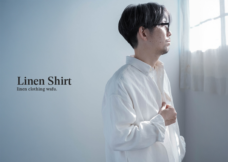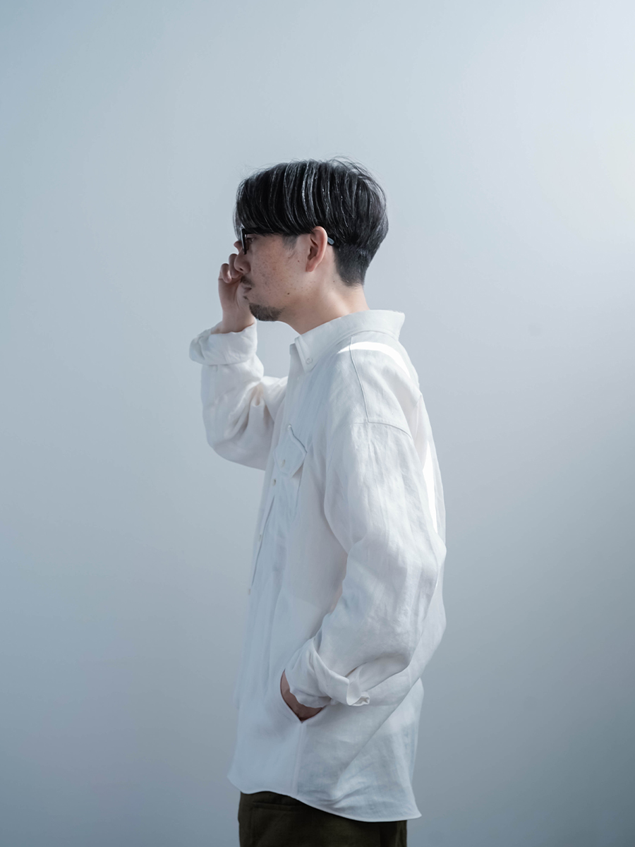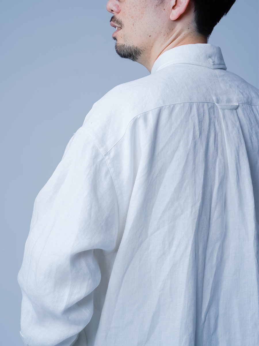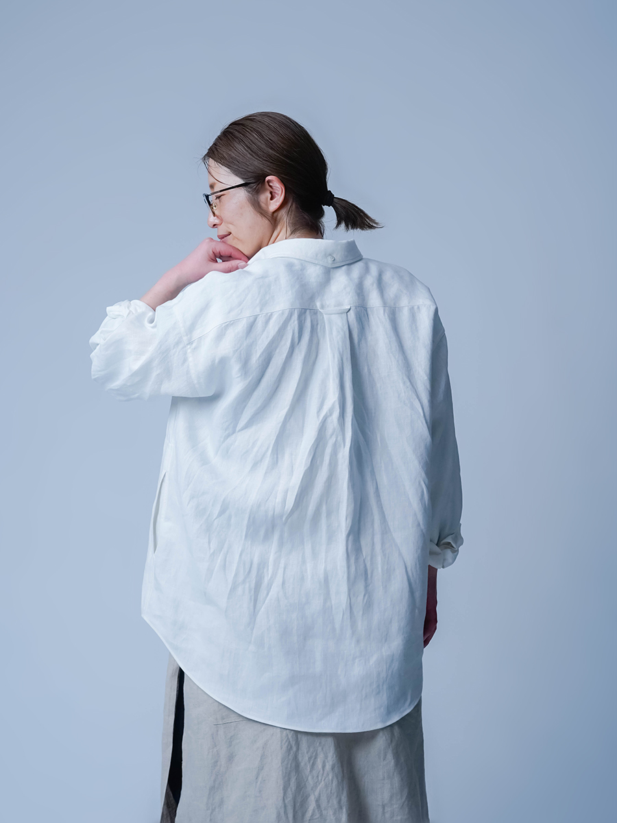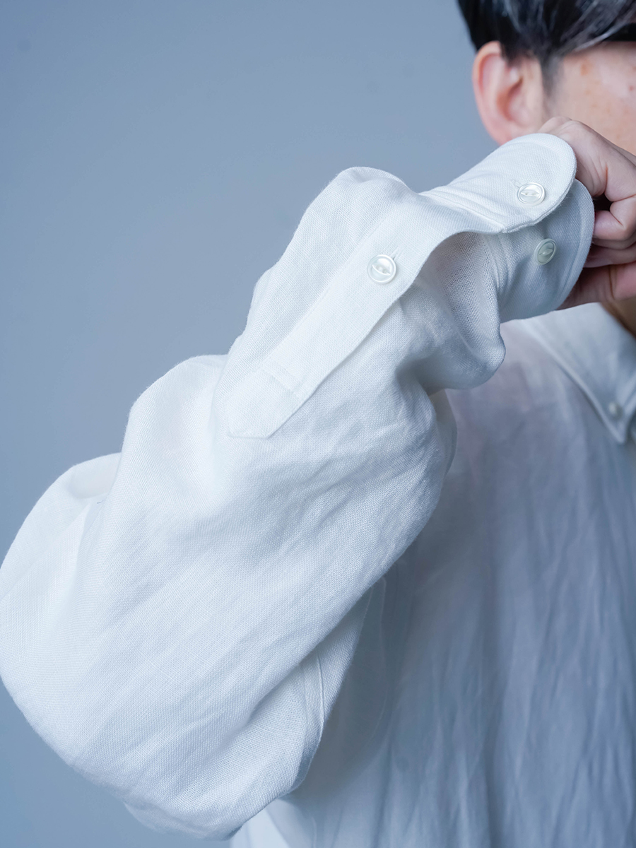 リネンの男女兼用本格ボタンダウンシャツ。