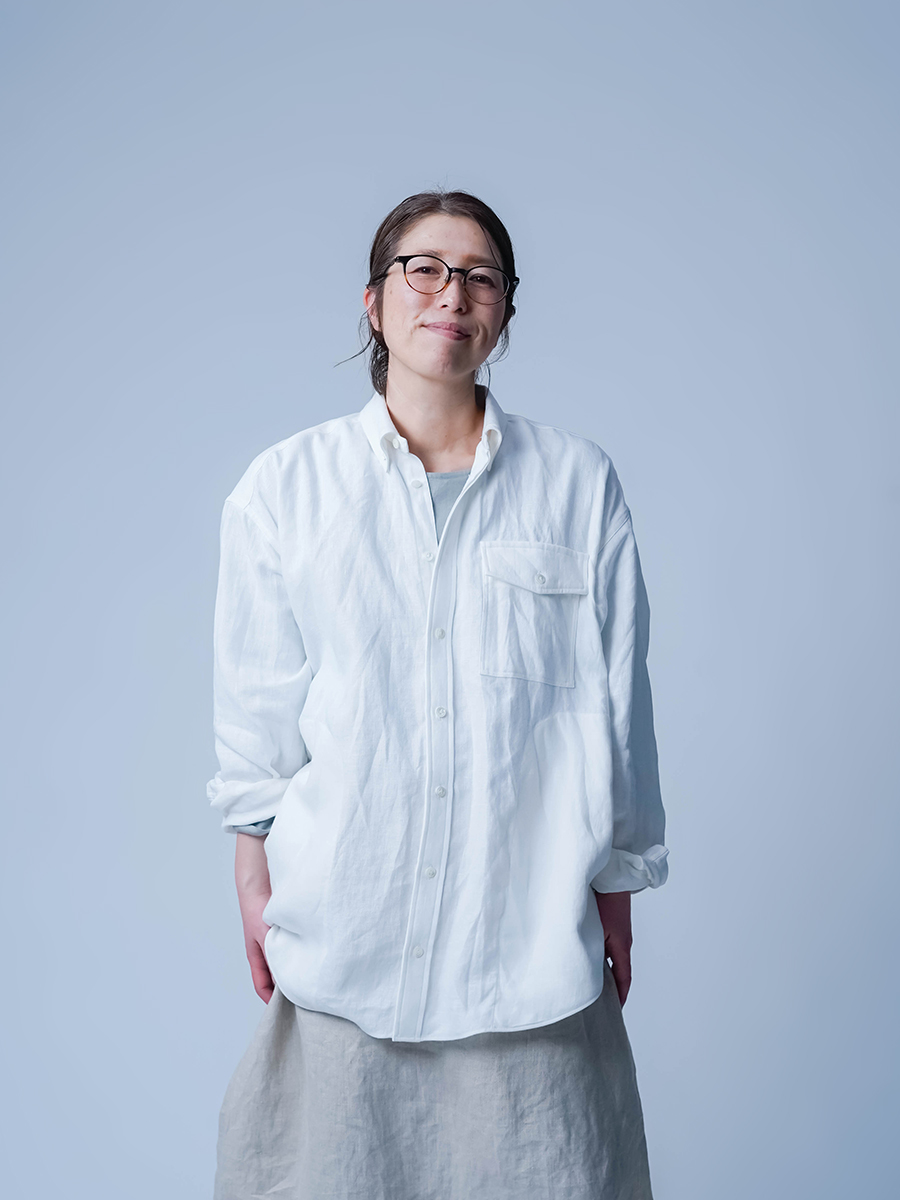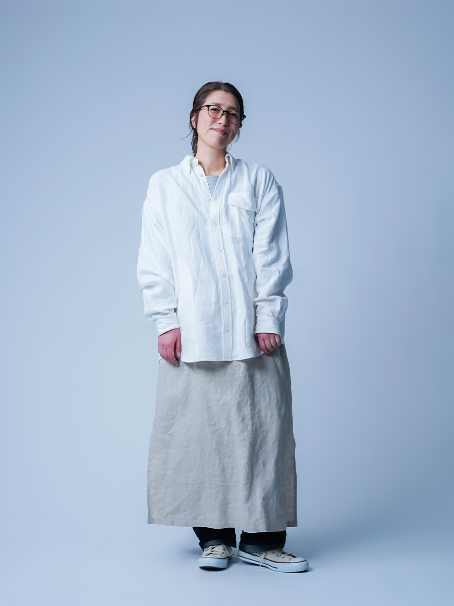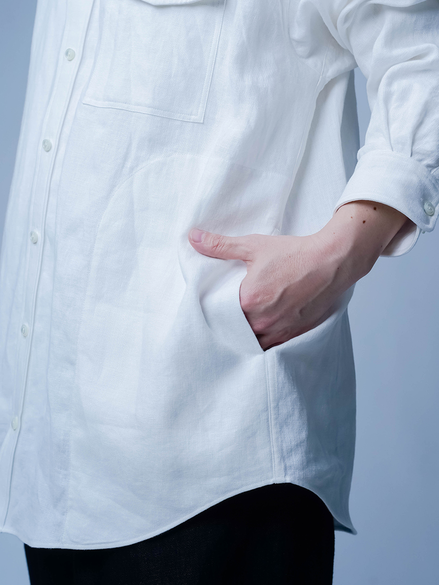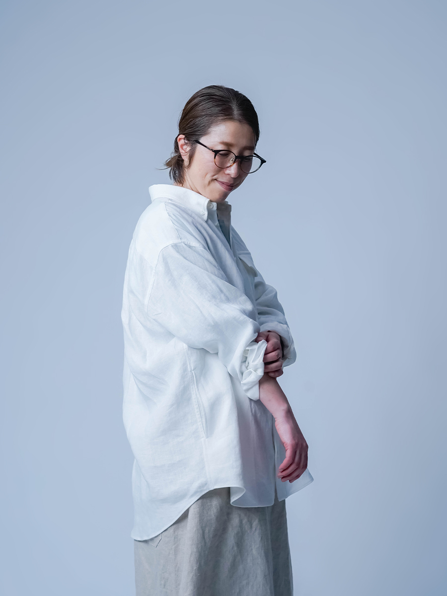 ゆったりとしたサイズ感。肩を落としたオーバーシルエットで、ほどよくメンズライクな雰囲気です。袖は手が隠れるくらいの長さがあります。襟元や胸ポケットには貝ボタンで品があり、シンプルながらも上質感のあるシャツです。 両サイドのポケットが使い勝手がいいので軽やかな羽織として着たいです。
