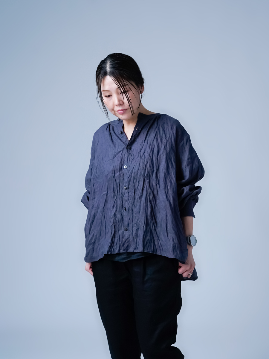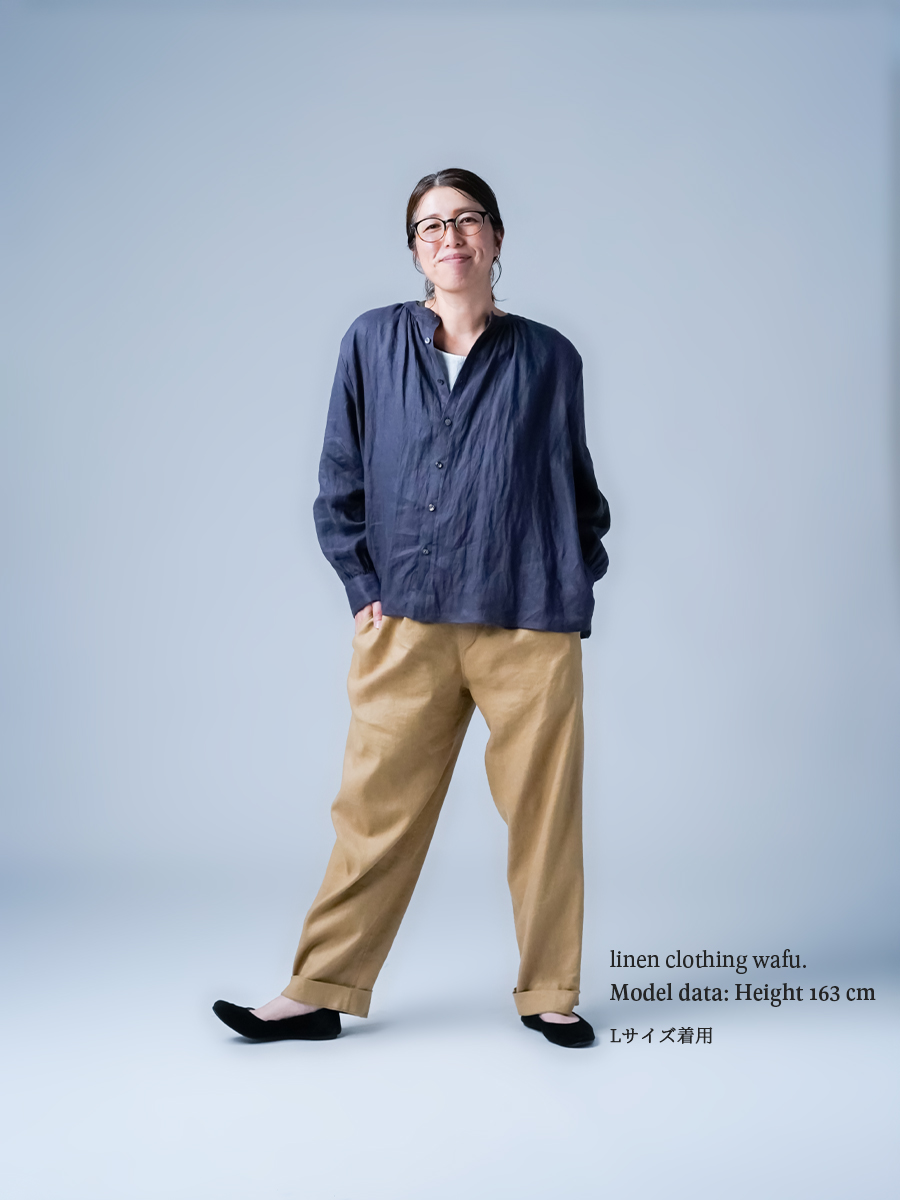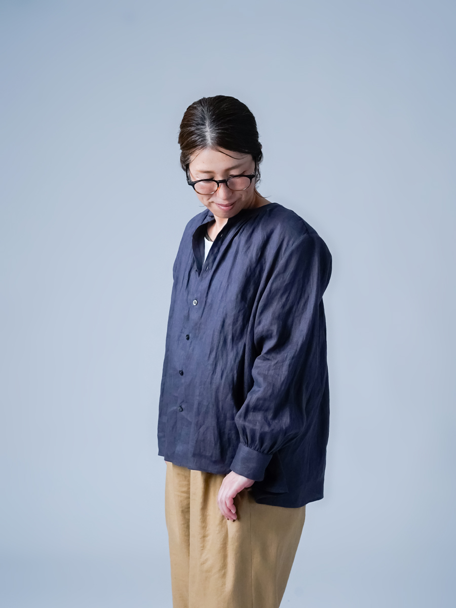 - ※生地工場の生産時期によって色味の濃淡が出ることがございます。セットアップでの着用の場合はご相談下さい。カラーリネンは最初色落ちや生地の性質上、毛羽落ちがある場合がございます。落ち着くまで数回は単品でのお洗濯を。最初は水通しをおすすめします。表面の毛羽立ちがとれて、肌への刺激が極端に少なくなります。リネン特有のネップ、節がございます。