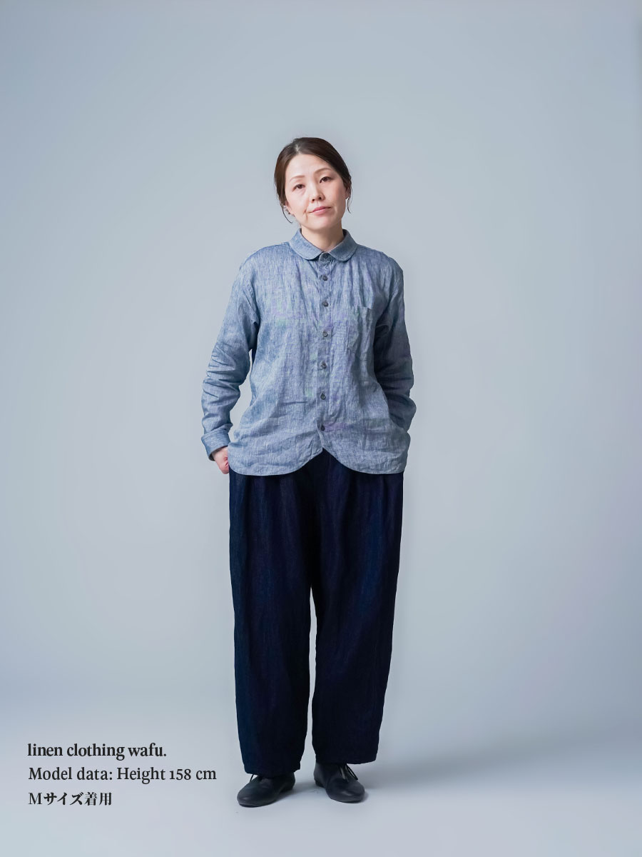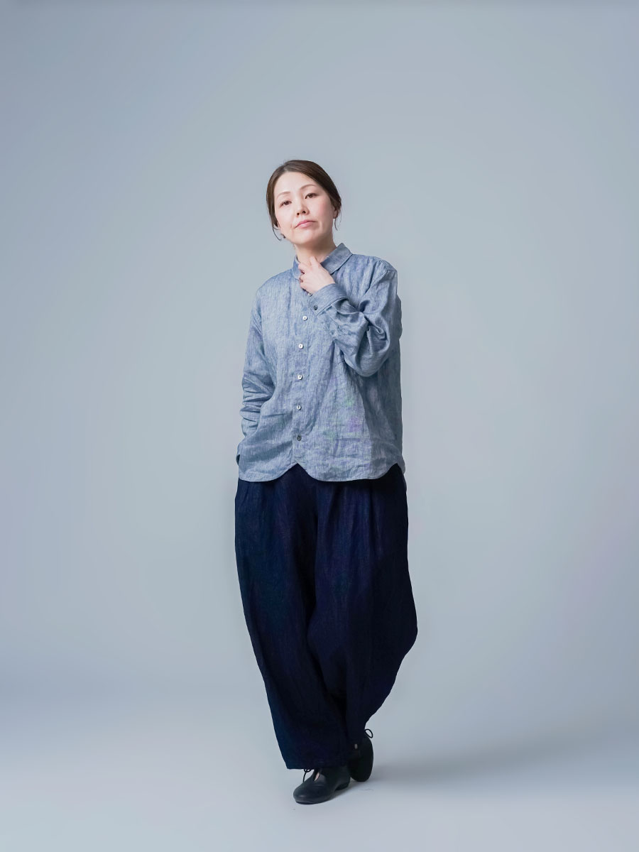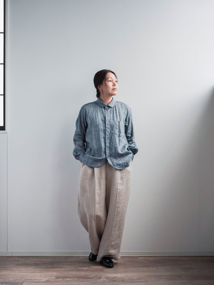 - ※生地工場の生産時期によって色味の濃淡が出ることがございます。セットアップでの着用の場合はご相談下さい。カラーリネンは最初色落ちや生地の性質上、毛羽落ちがある場合がございます。落ち着くまで数回は単品でのお洗濯を。最初は水通しをおすすめします。表面の毛羽立ちがとれて、肌への刺激が極端に少なくなります。リネン特有のネップ、節がございます。
