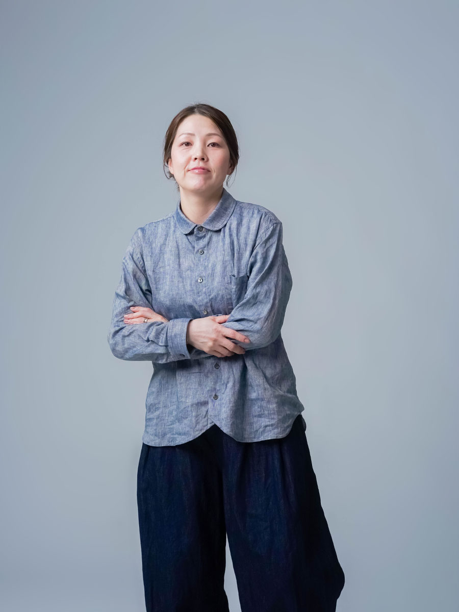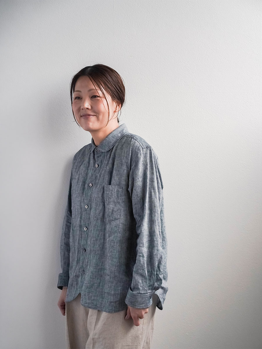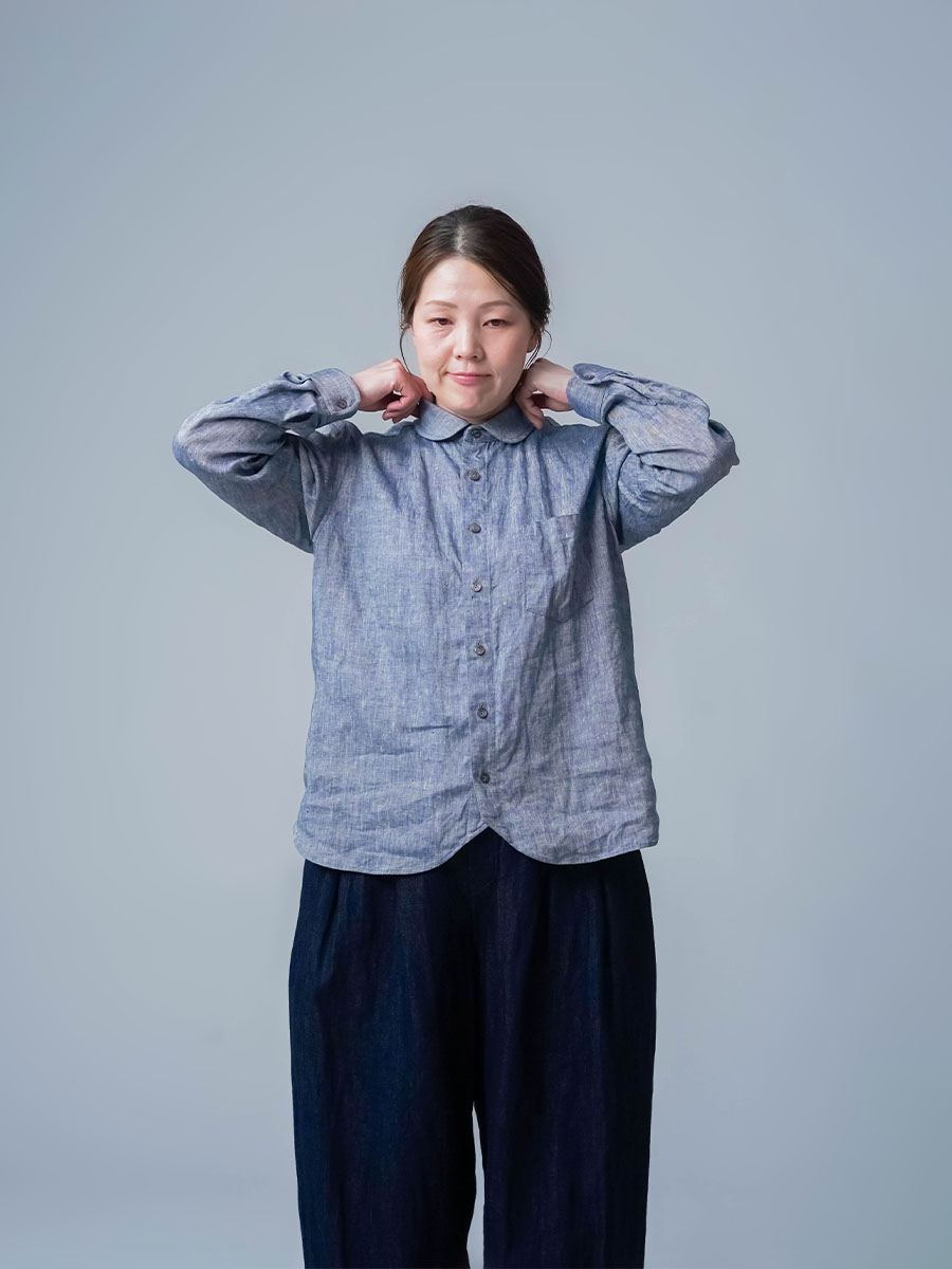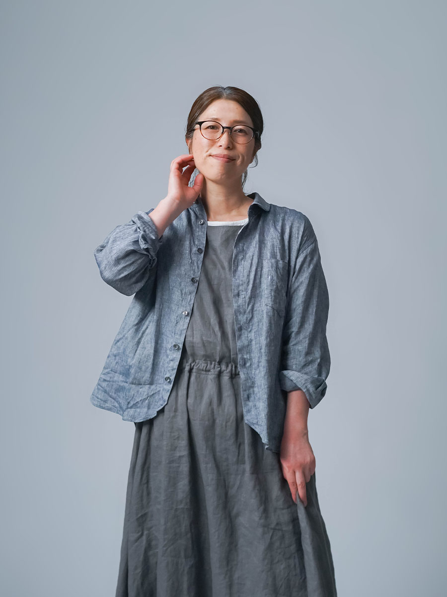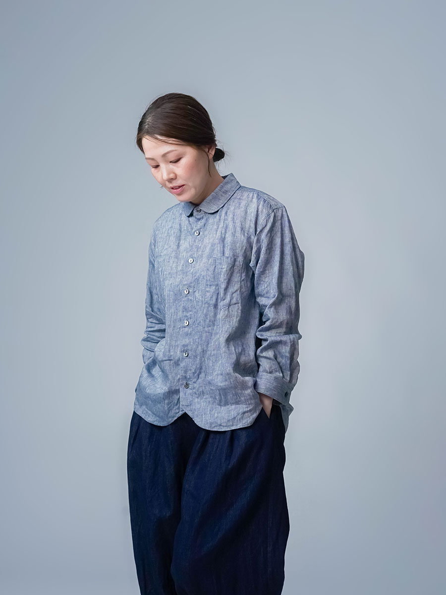 Lサイズでゆったり着たいです。ちび襟と裾の丸みが可愛らしく、全体にゆとりのあるサイズ感でもシャンブレーの軽さで重たく見えません。前を開けて羽織りとしても使えるので、コーディネートの幅が広がり、季節の変わり目にも活躍します。