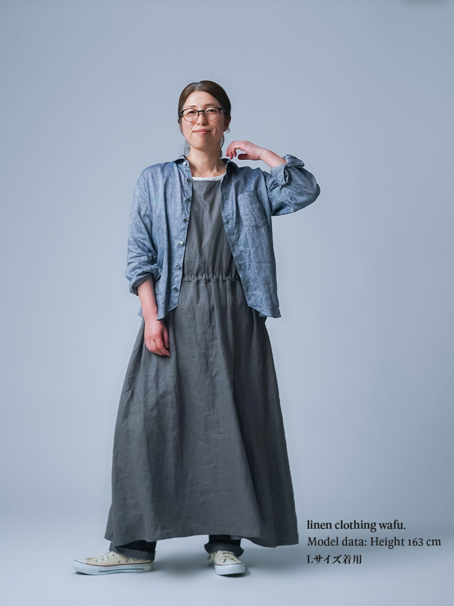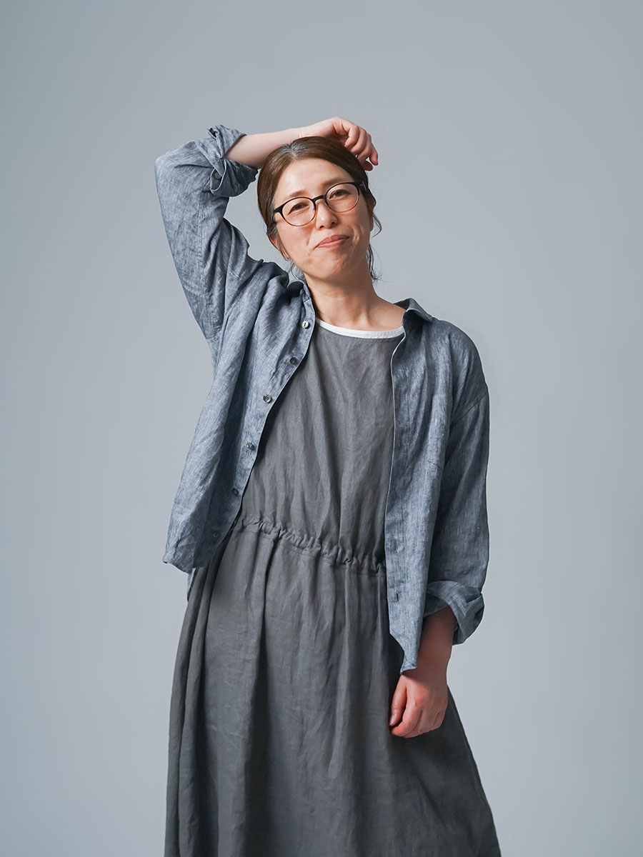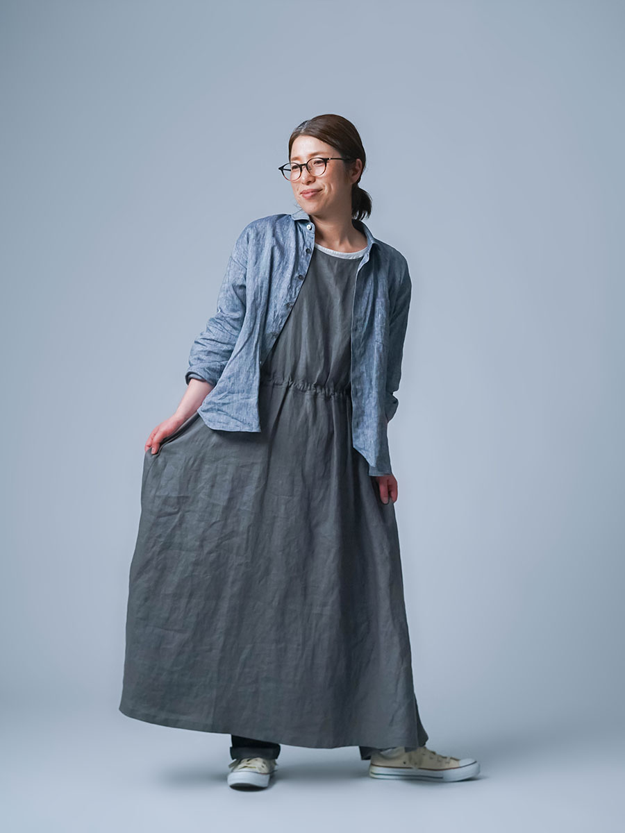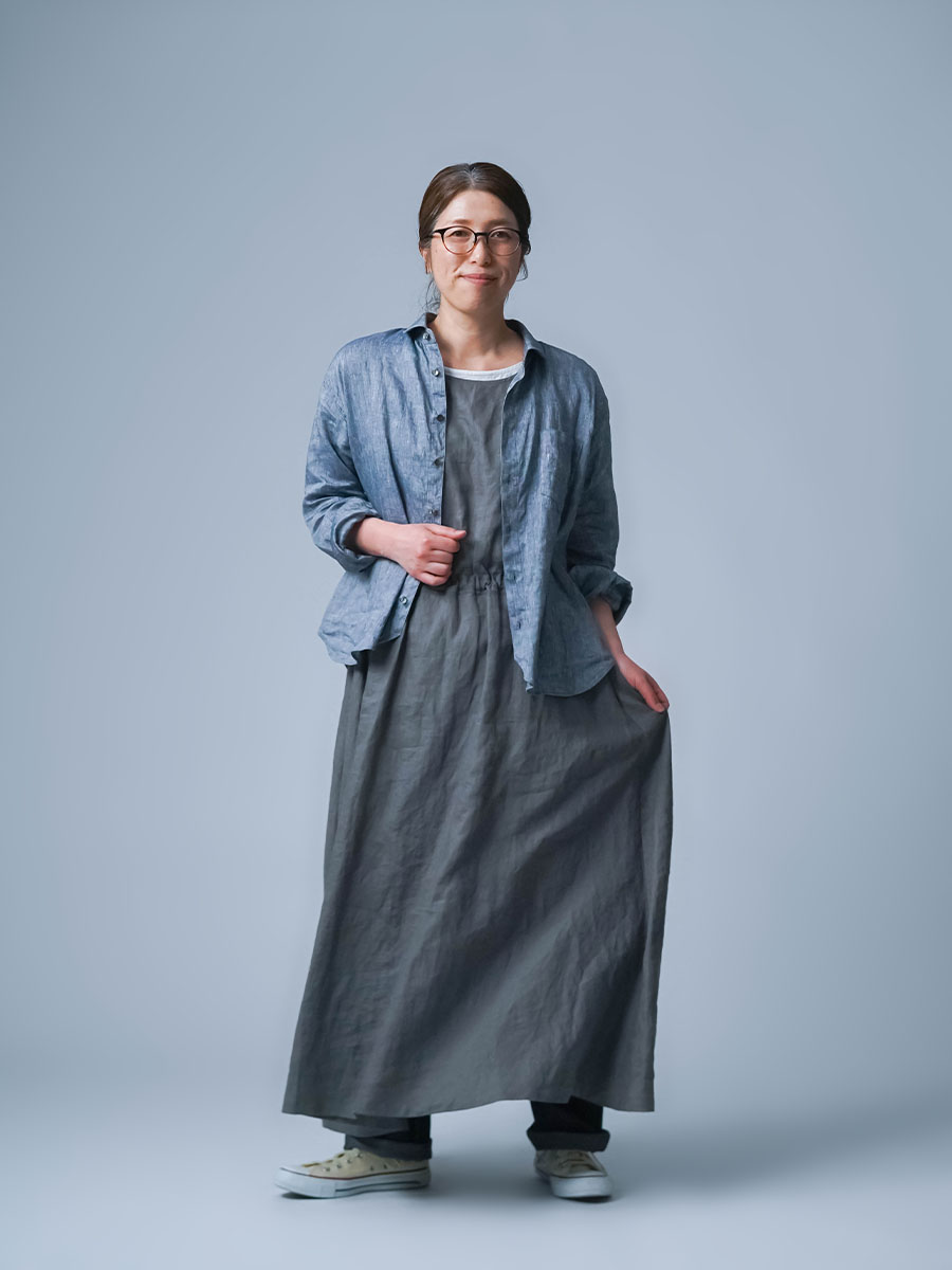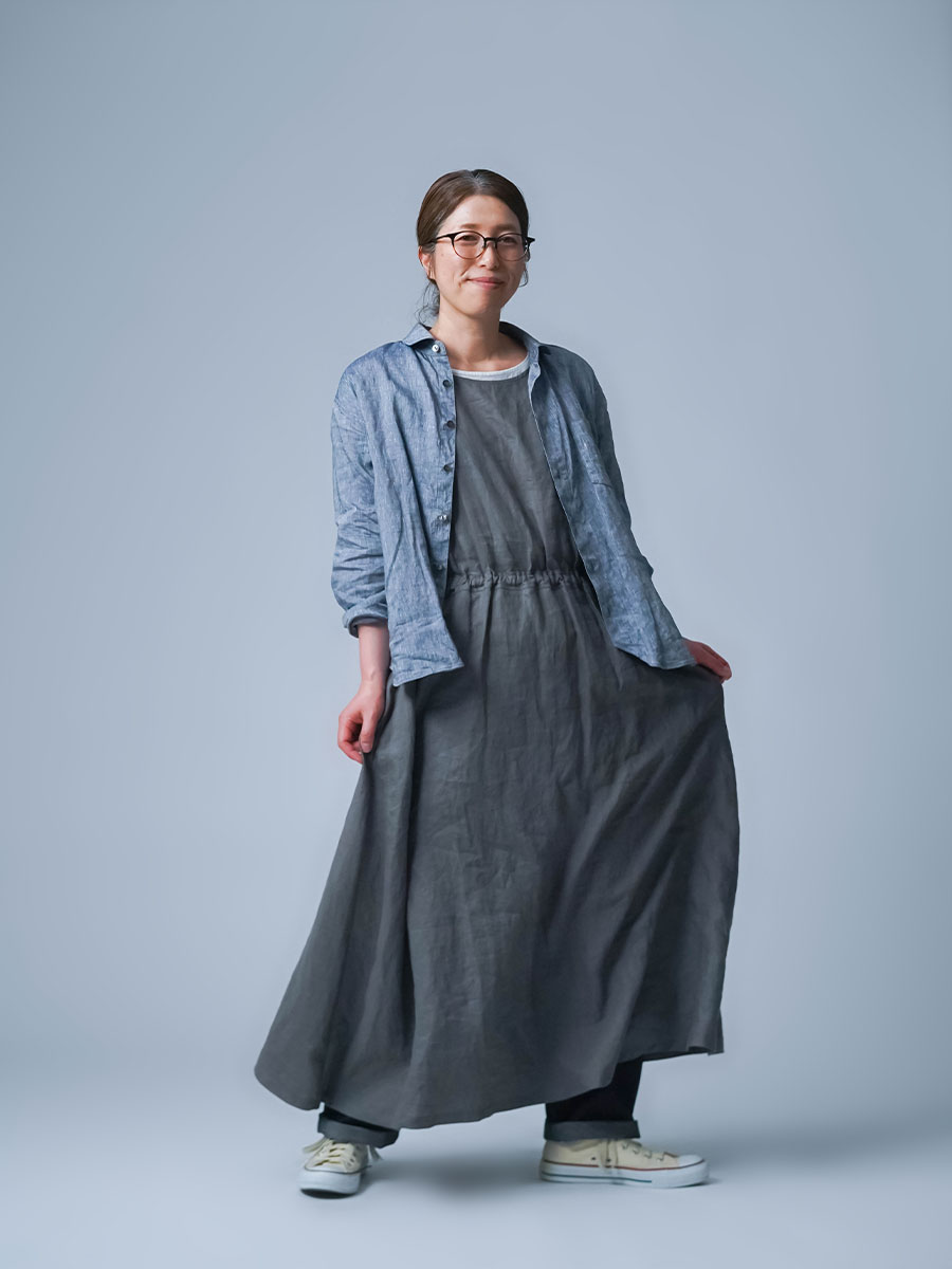 夏こそ長袖派の方へ、驚くほど軽く、すぐ乾く。小さく畳んで持ち歩けるので、酷暑の日よけや冷房対策にぴったりです。シャンブレーは夏の見方、私は昨年この生地にどんなに助けられたことか、これからの季節、絶対にお役たちアイテムになる事間違いありません。また裾に丸みがあるデザインは、ボタンを留めても重たく見えないのがお気に入りです。汗ジミも気にならないので、もう私にとってお守り代わりになるでしょう。私はLサイズです、程よく肌から離れるサイズ感です。着丈は踝丈、バストはゆったりしています。透け感はほとんど感じません。Mサイズは体のラインが少し出るサイズ感です。ピッタリめな好みな方は問題ないかと思います。