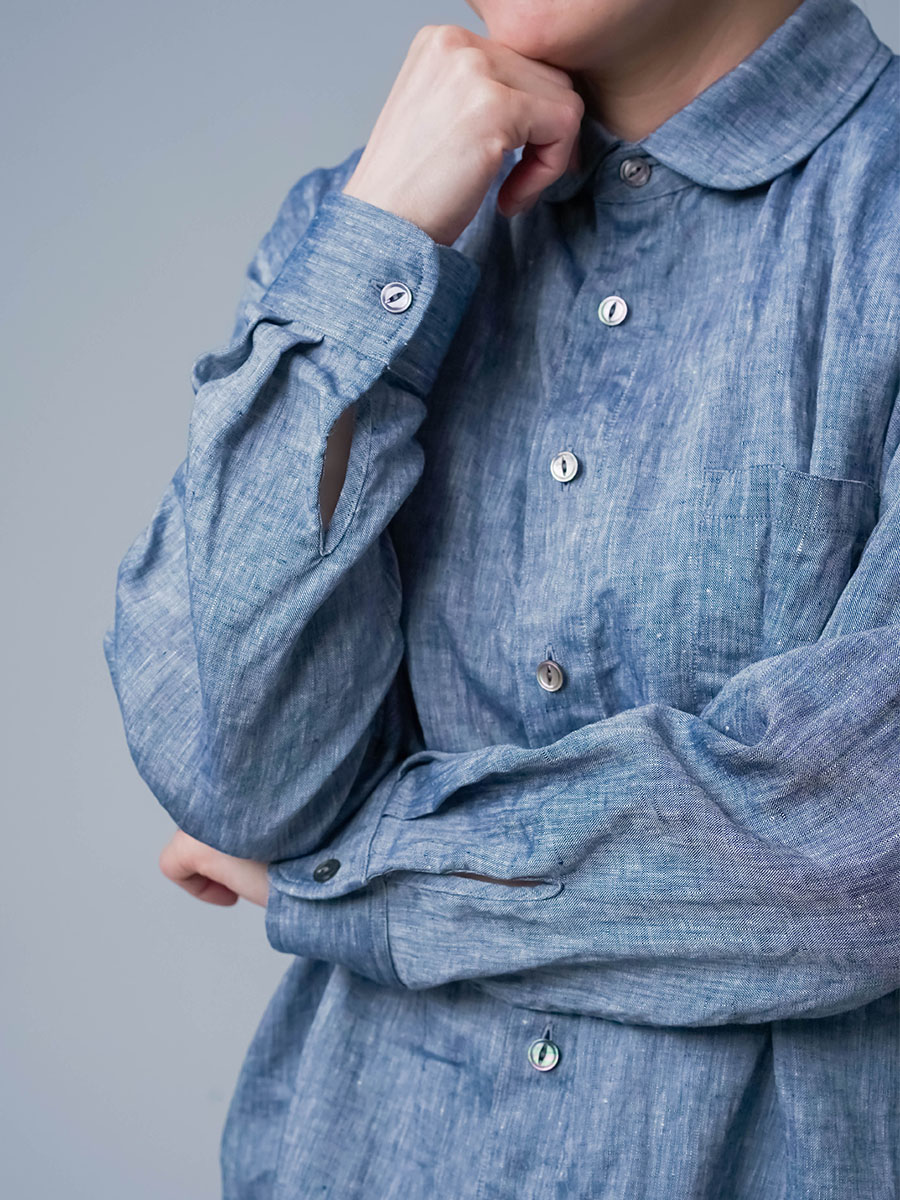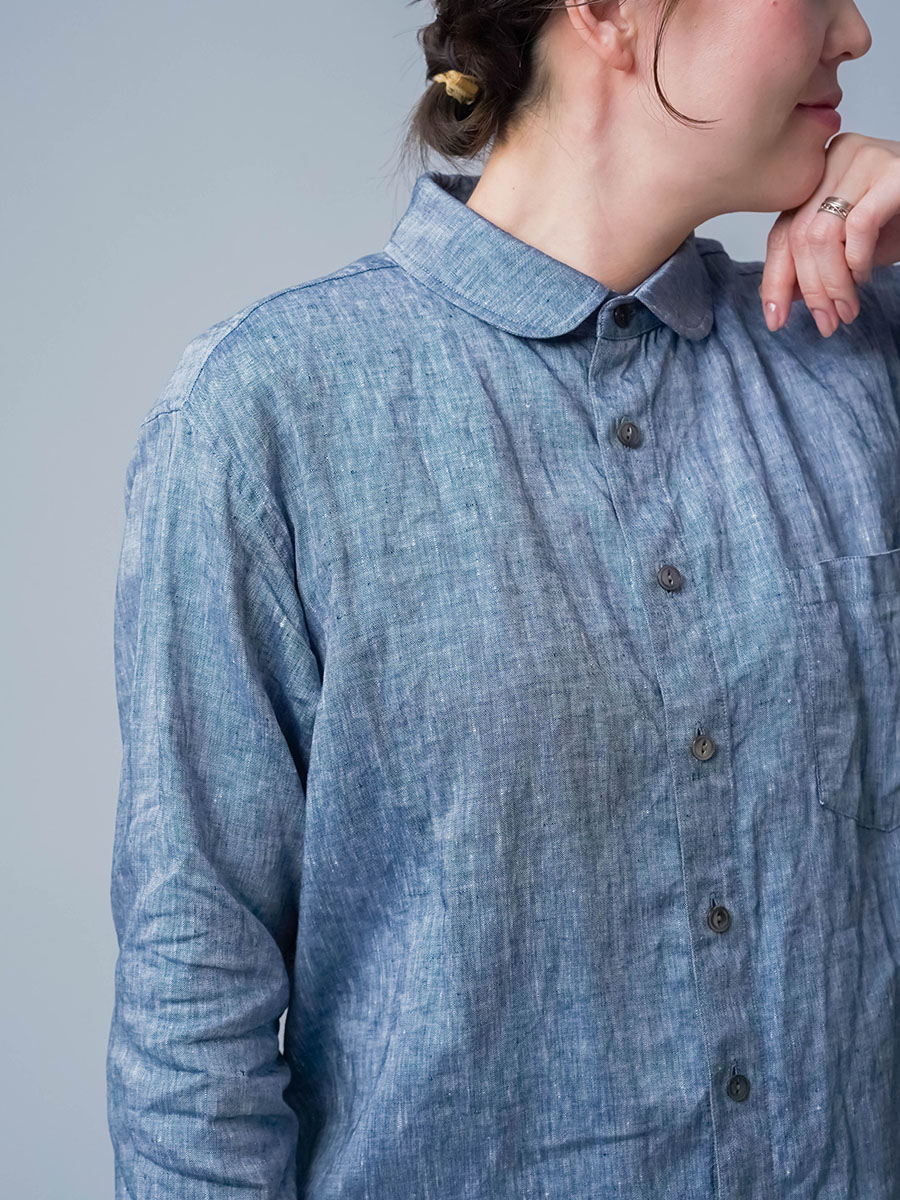小ぶりの丸襟、胸ポケット、ラウンドした裾。