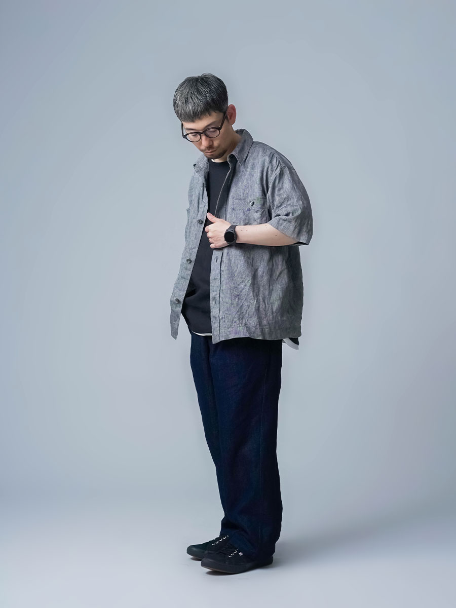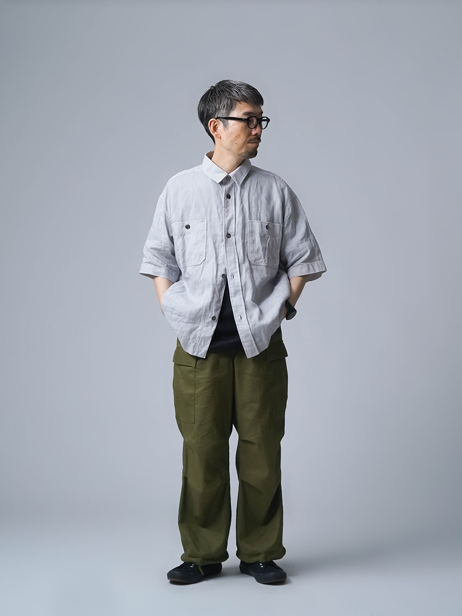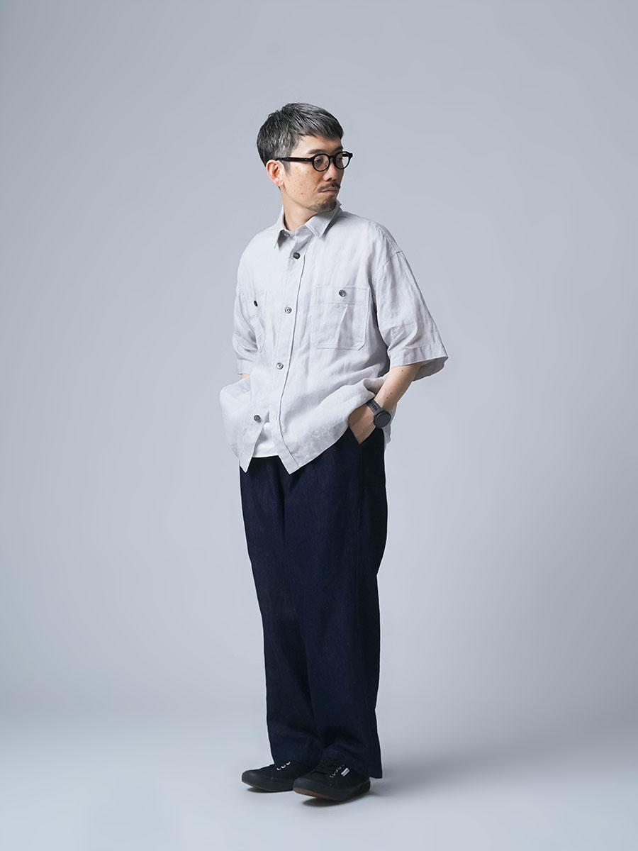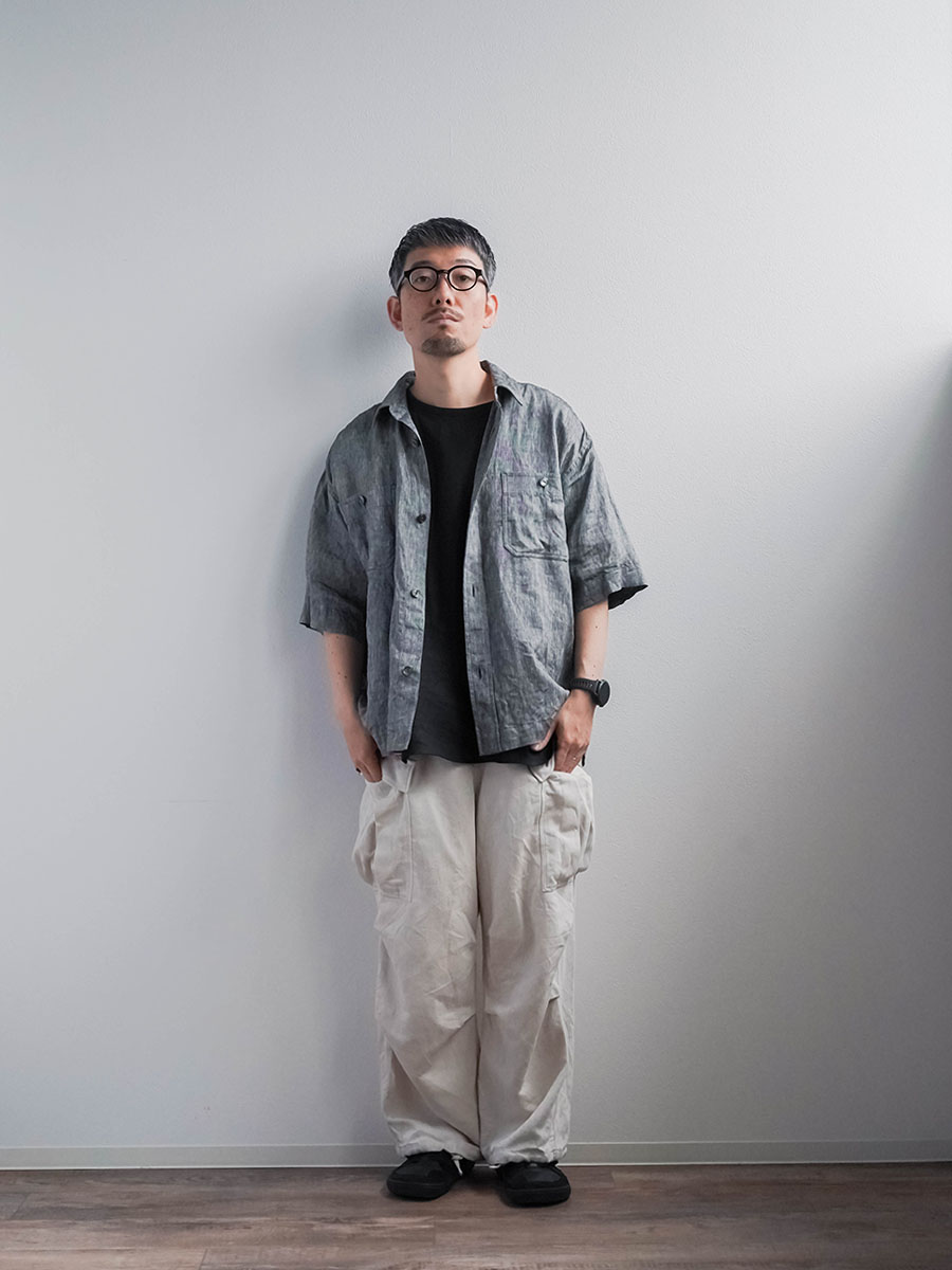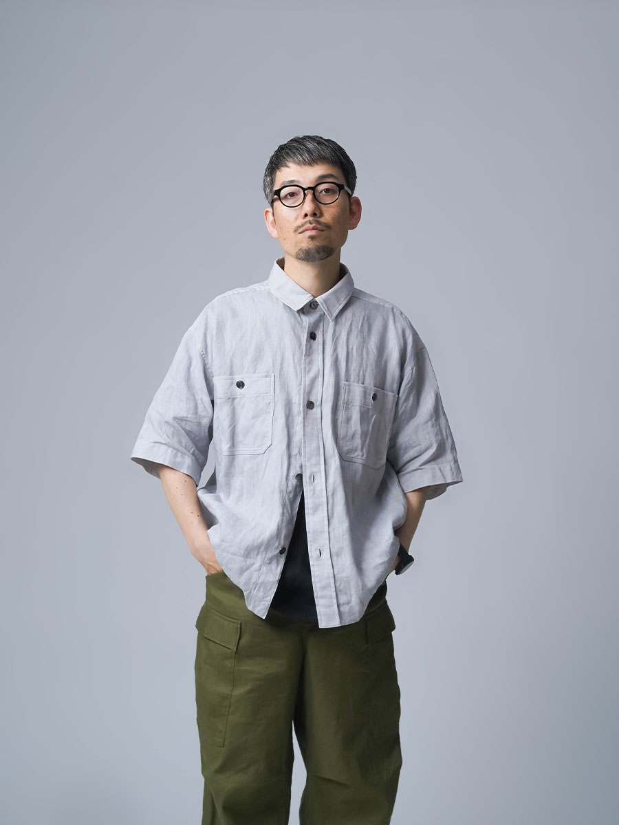 実にメンズらしい、ワークテイストなシャツです。着丈はお尻が半分隠れるくらい。身幅はかなりたっぷりとしています。袖丈は肘の関節プラス3センチほど。ゆったりなボックスシルエットです。胸のポケットがワーク感を演出し、武骨な雰囲気に仕上がっています。ボタンを開けても、閉めてもいい雰囲気で着られる万能型。武骨な作品ながら女性の方がスカートとコーデするのもいいかなと思います。この夏一押しの半袖シャツです。