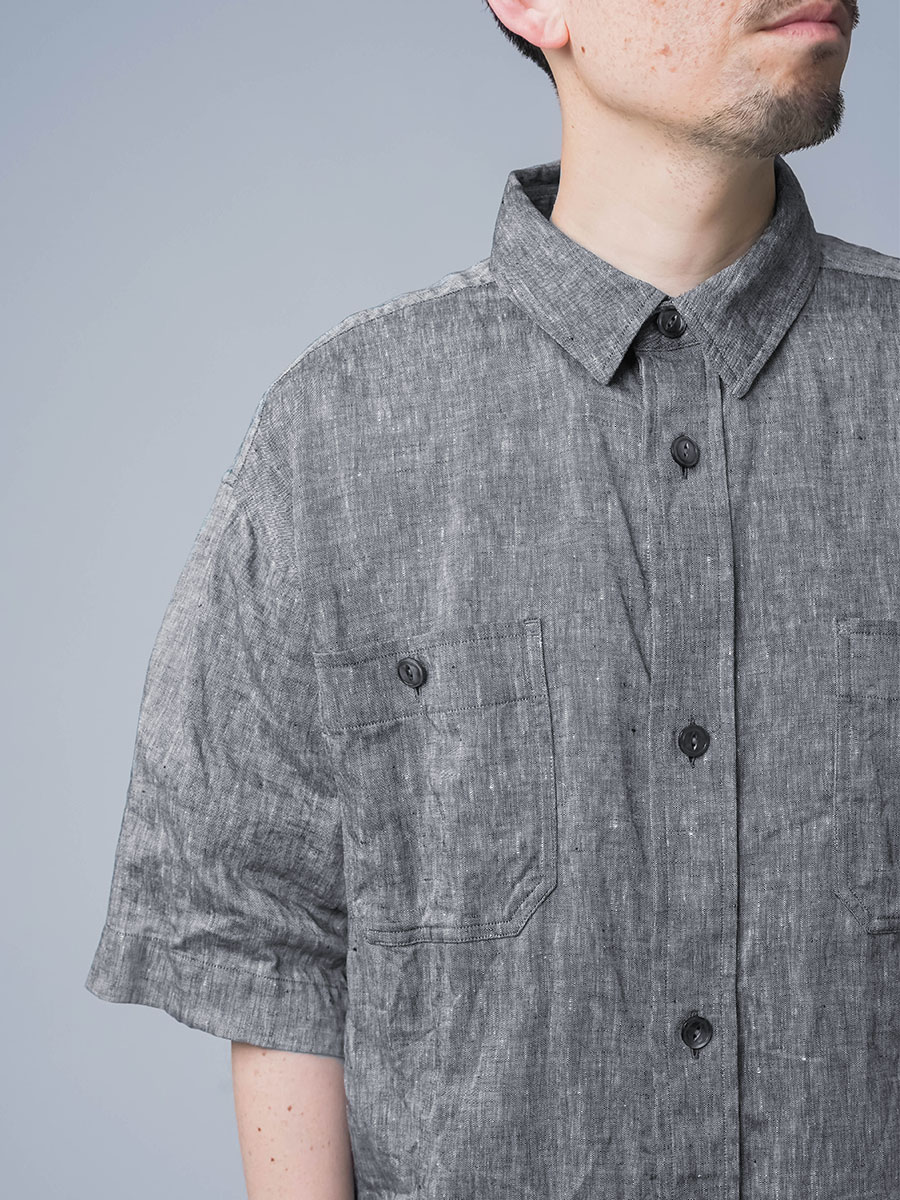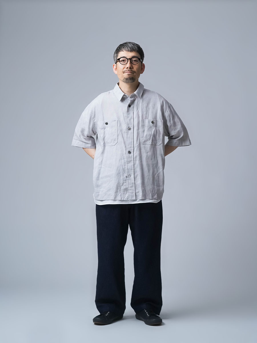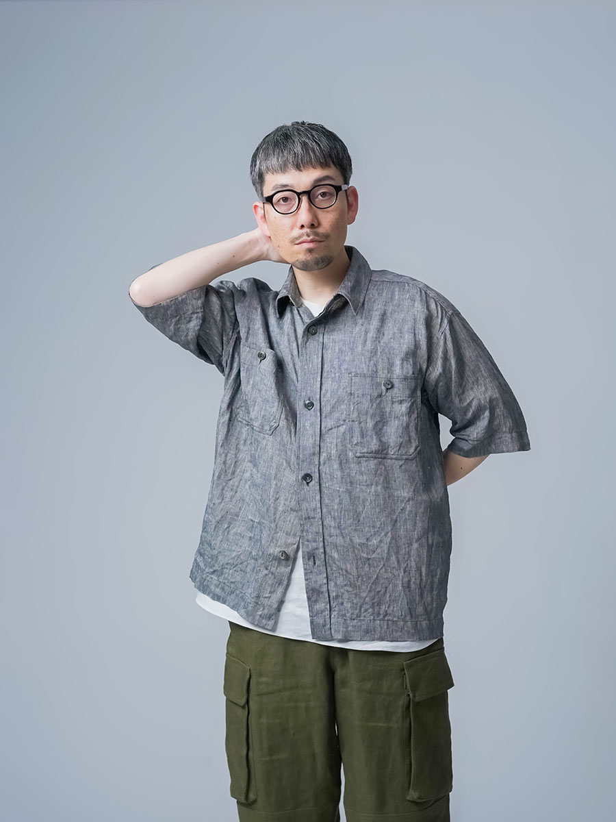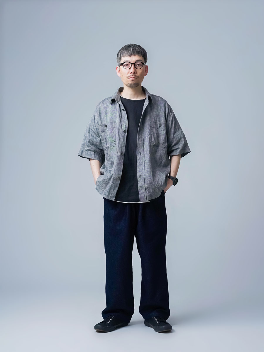 実にメンズらしい、ワークテイストなシャツです。着丈はお尻が半分隠れるくらい。身幅はかなりたっぷりとしています。袖丈は肘の関節プラス3センチほど。ゆったりなボックスシルエットです。胸のポケットがワーク感を演出し、武骨な雰囲気に仕上がっています。ボタンを開けても、閉めてもいい雰囲気で着られる万能型。武骨な作品ながら女性の方がスカートとコーデするのもいいかなと思います。この夏一押しの半袖シャツです。
